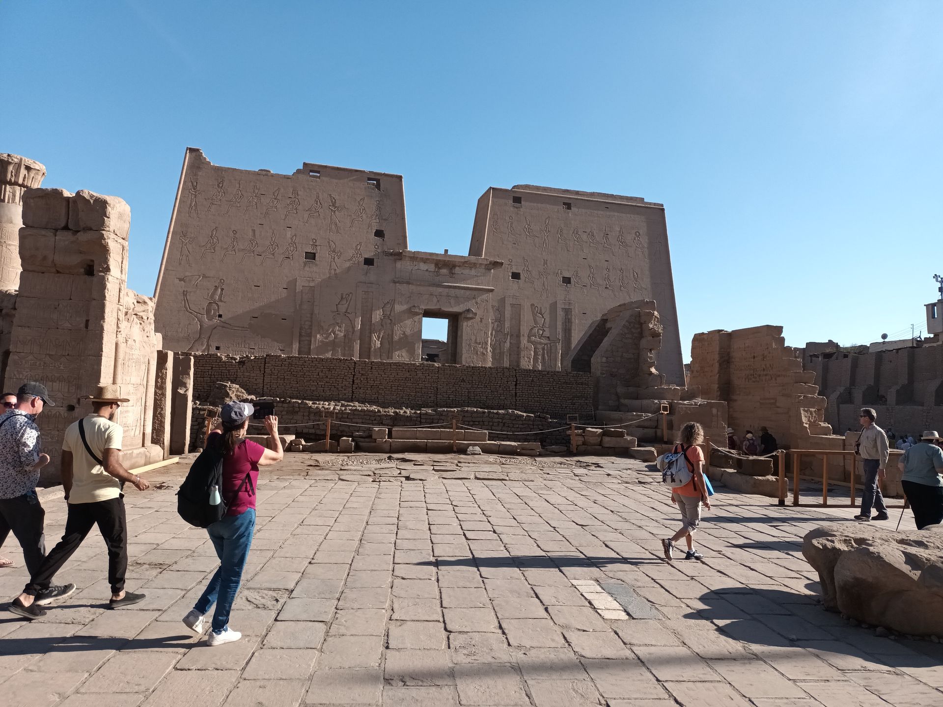 The Ptolemaic Temple of Horus, in Edfu, near Aswan, Upper Egypt, was the first stop on this journey along the Nile, on a cruise ship called the Nile Capital. This visit, like all those we were going to make in Upper Egypt, took place under the direction of an affable, funny and captivating guide, mixed Arab and Nubian, former boxer and footballer, by the name of Amr (pronounced Amro).