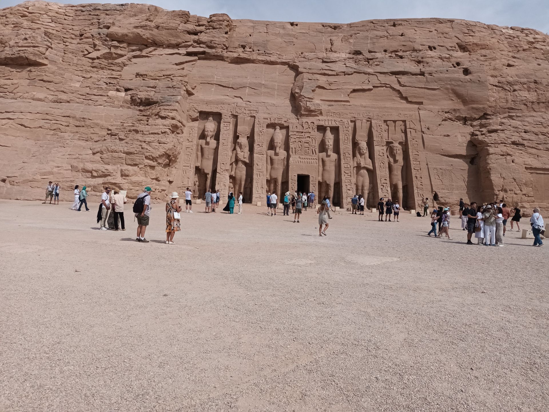 staying in Nubia!), and that's how we ended up at the foot of the four famous giant Ramesseses who watch over the entrance to the temple of Abu Simbel — a colossal building dug out of the rock of Meha hill, which was (like the temple of Philae) completely dismantled and rebuilt, in the 1960s, to protect it from the rising waters of Lake Nasser following the construction of the Aswan High Dam.