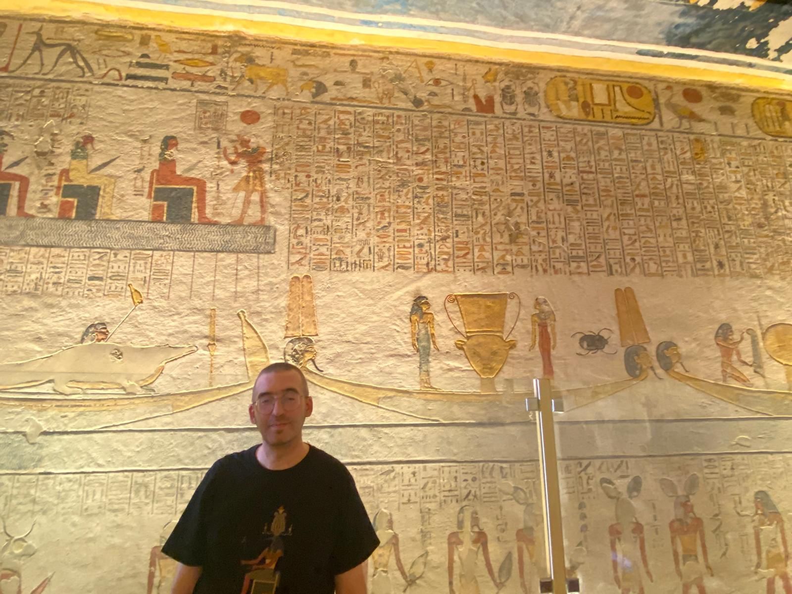 In the Tahrir Square museum, reading part of the Book of the Dead in front of part of the Book of the Dead.