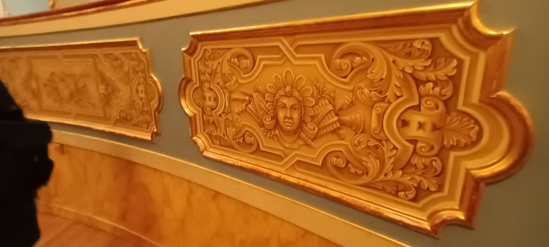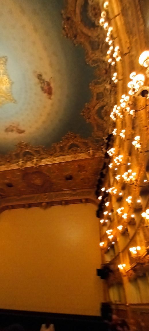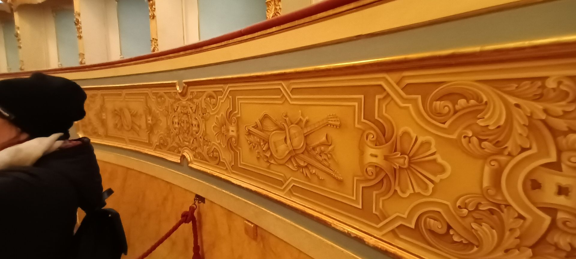 First part of the visit: the Rococo auditorium with its 1,126 seats, including a little over 170 boxes (among which — only since (that great international criminal that was) Napoleon landed with his thugs and ended to the (admittedly grotesquely oligarchic) Republic of Venice in 1797 — an imperial box which later became royal box):