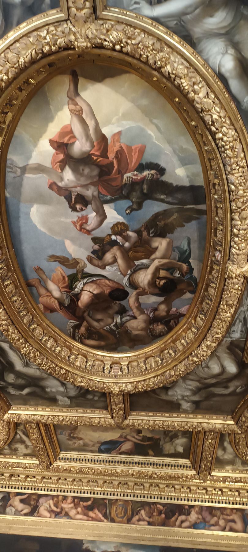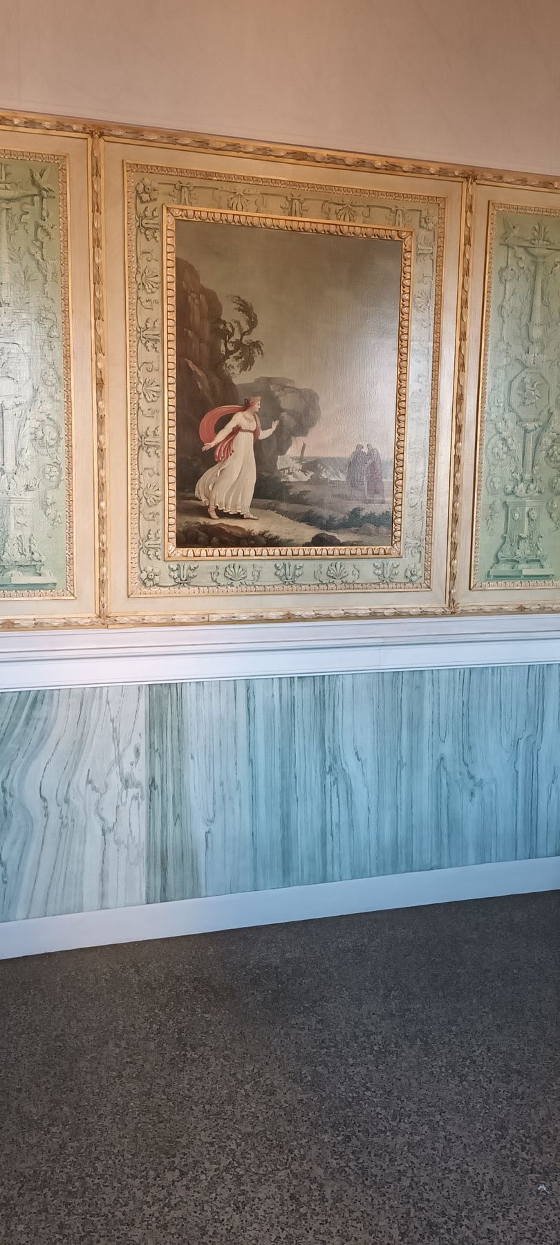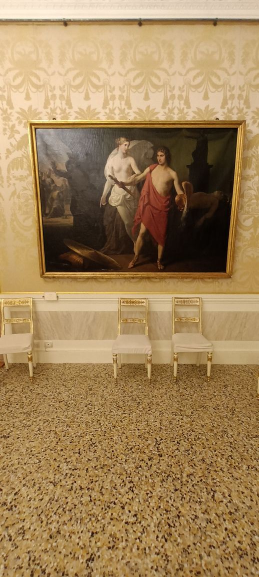 In keeping with these Greco-Latin mythological themes, the next room (decorated in the Empire style by the Venetian painter Giuseppe Borsato (1771-1849)) serves primarily as a setting for one of Canova's first famous works: a statue representing that damn lil' rascal Icarus and his father Daedalus in the process of making him put on the fateful wings: