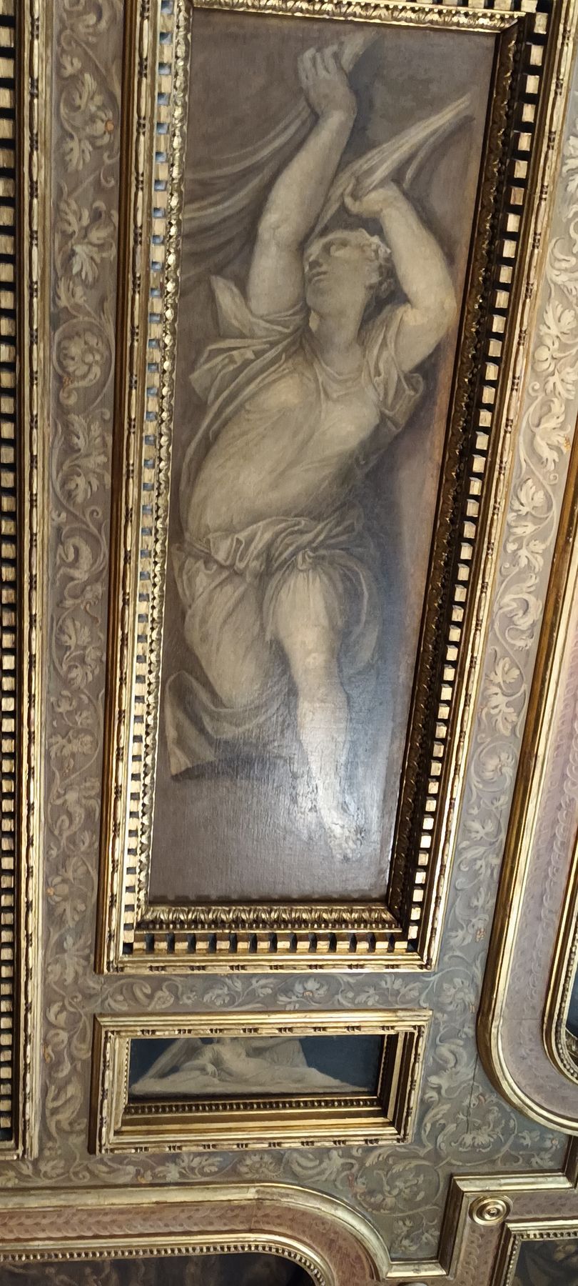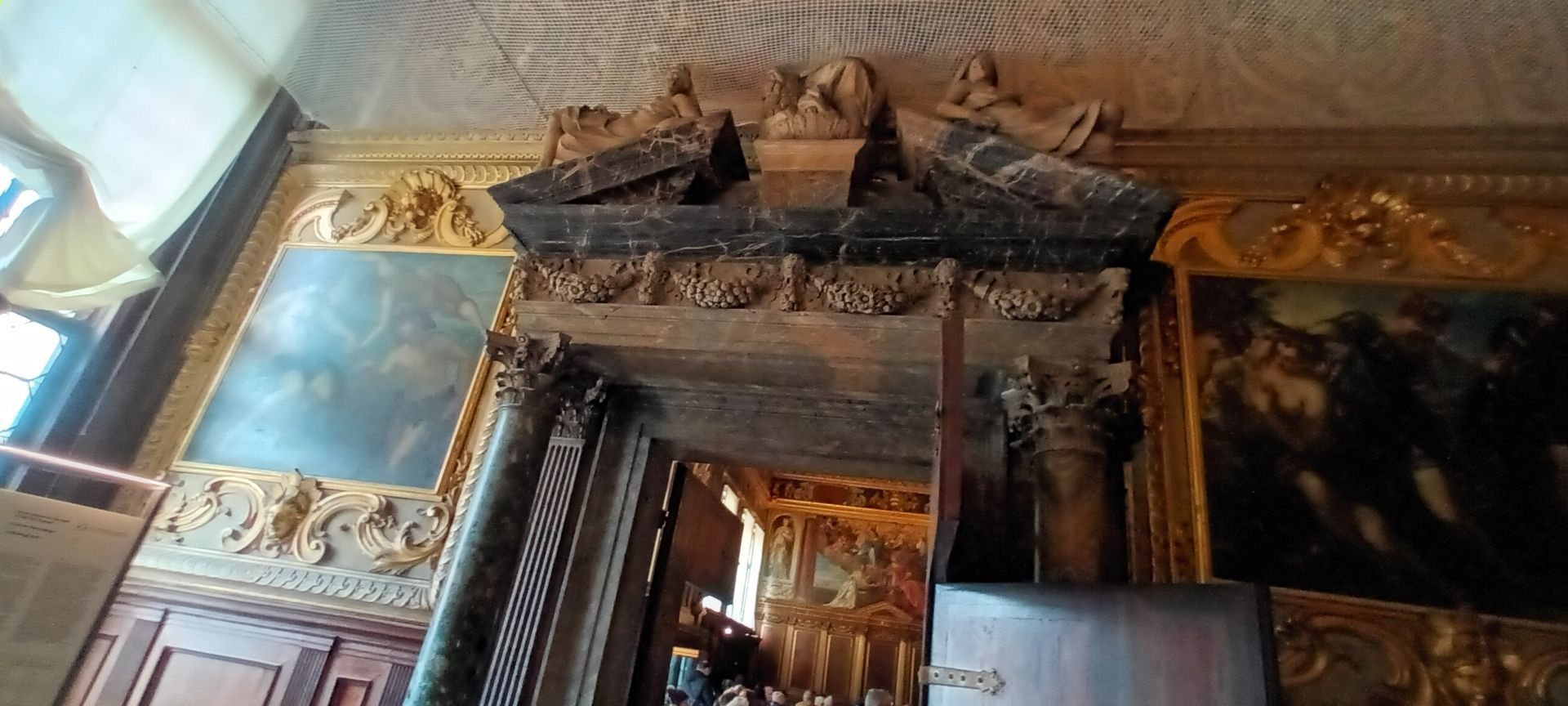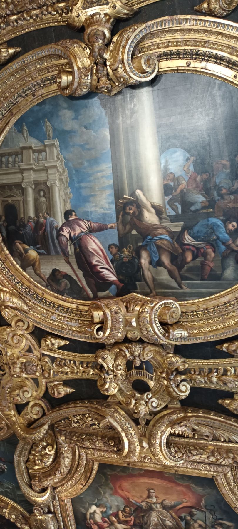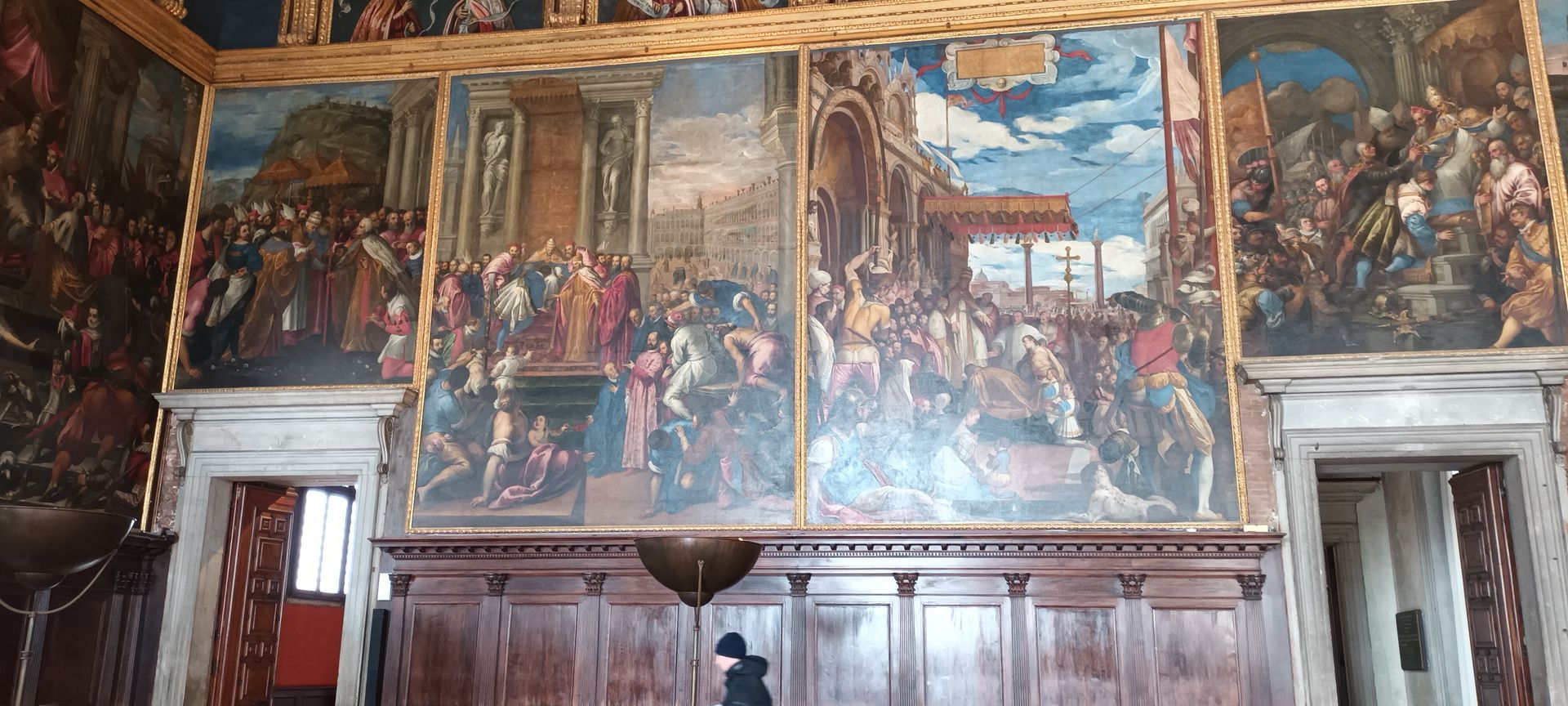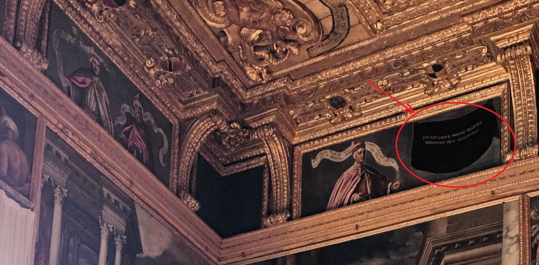 Note the small portraits of all the doges in the history of the Republic, lined up all around the room, above the more monumental paintings — except one, whose portrait has been covered with a painted black sheet (circled in red in the details below): Doge Marino Faliero, in a way the Donald Trump of the Republic of Venice, in that he failed to overthrow the Republic and replace it with his personal autocracy — but, unlike Trump, when the Republic foiled his coup plan, it did not give him on a platter the opportunity to do it again: Faliero was beheaded; and, in the manner of Herostratus (or even Hatshepsut or Akhenaten), the regime also made sure to "erase" him from history, the most famous example of this punishment being the concealment, by painting a black sheet over it, of his portrait in the Great Council Chamber.