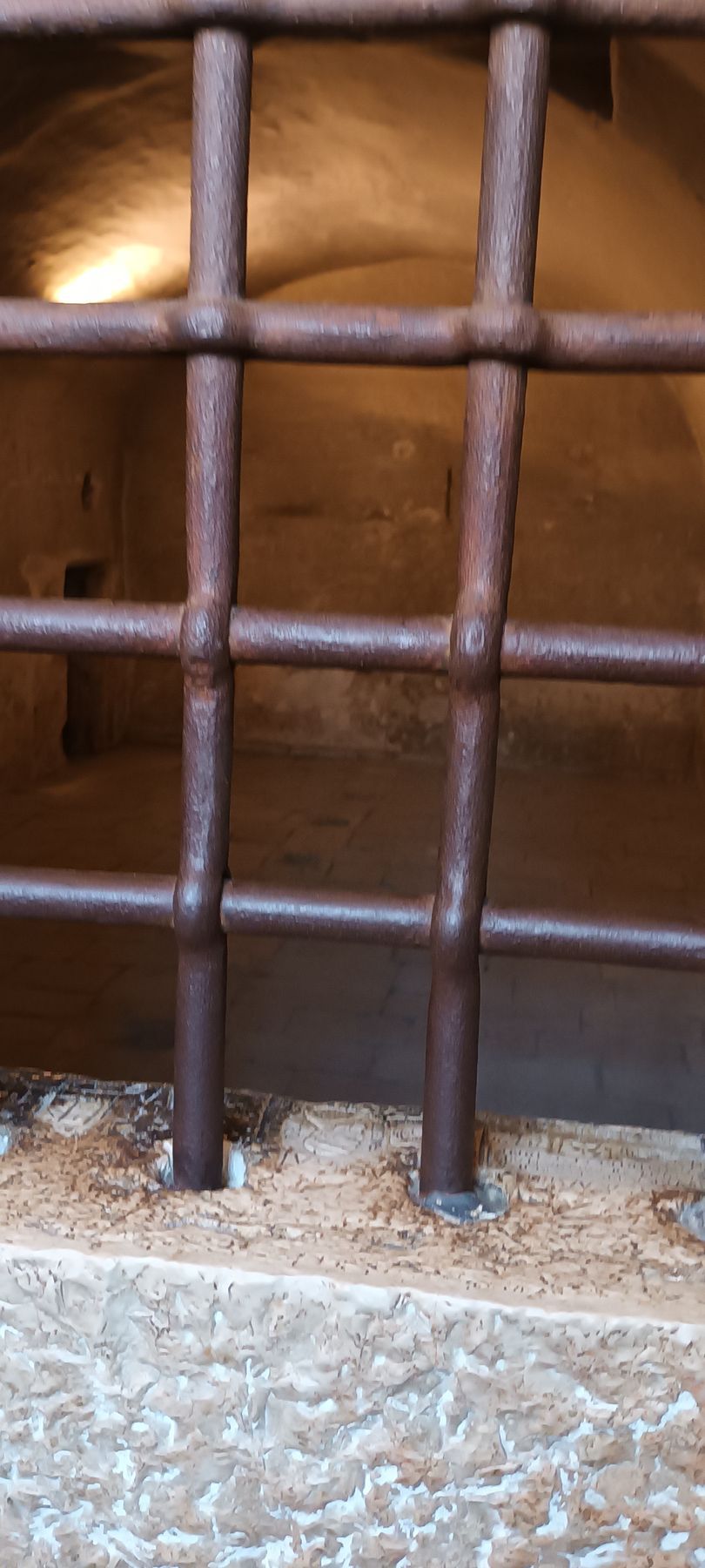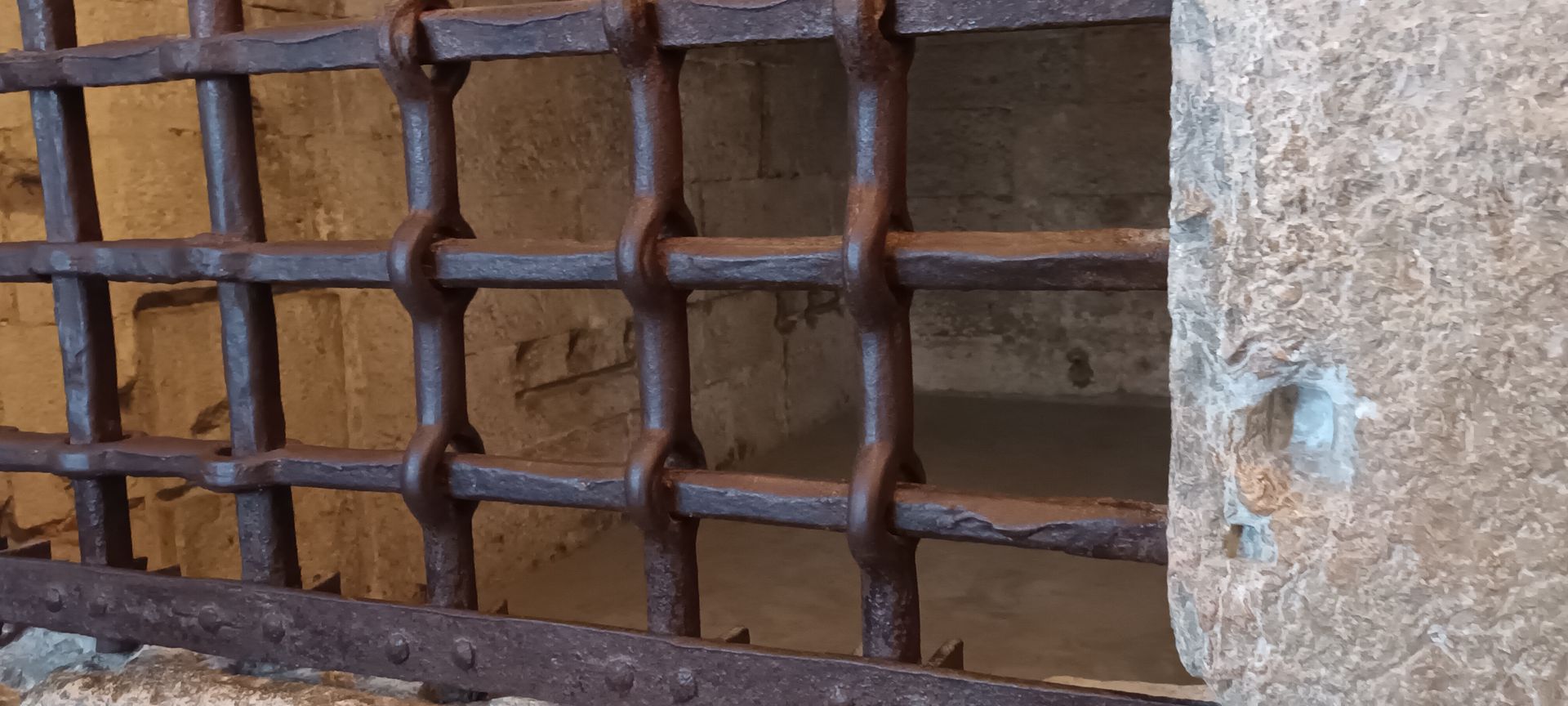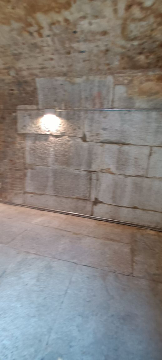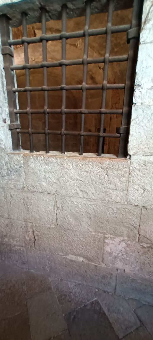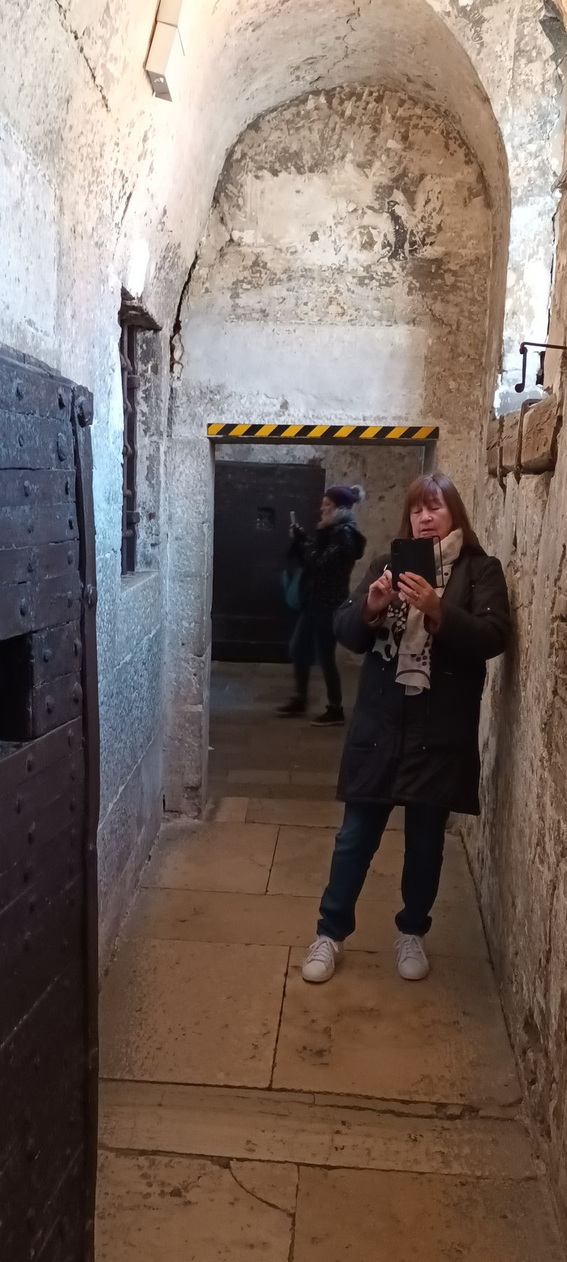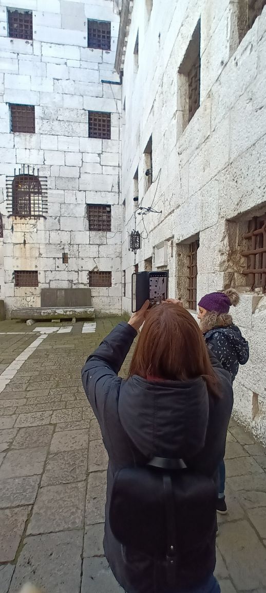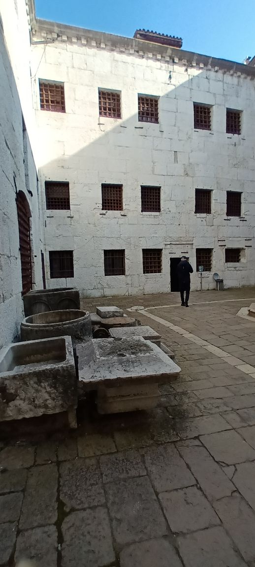 ... before going down the sinister staircase that leads to the even more sinister prisons of the Doge's Palace — but contrary to what I thought, we were not at all shown the Piombi, the initial prison, which was the scene of terrible tortures, and from which Casanova was the only one or one of the few to escape, and which is located directly on the ground floor of the palace (there is no basement: the building, like everything else in Venice, is built directly on the water, on stilts). Instead, we went inside the Bridge of Sighs to visit the New Prisons, built at the end of the 16th century and located on the other side of the Rio di Palazzo. (As a reminder, the Bridge of Sighs that connects the Piombi to the New Prisons, named so after the sighs of despair of soon-to-be prisoners who, when they saw the bridge, knew that it was their last minutes of freedom, and while, inside, it looks like this:)
