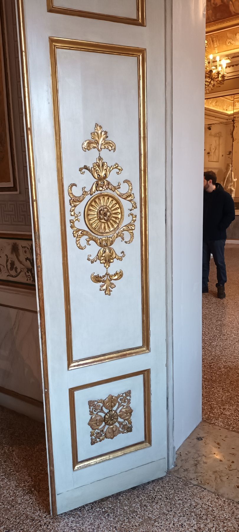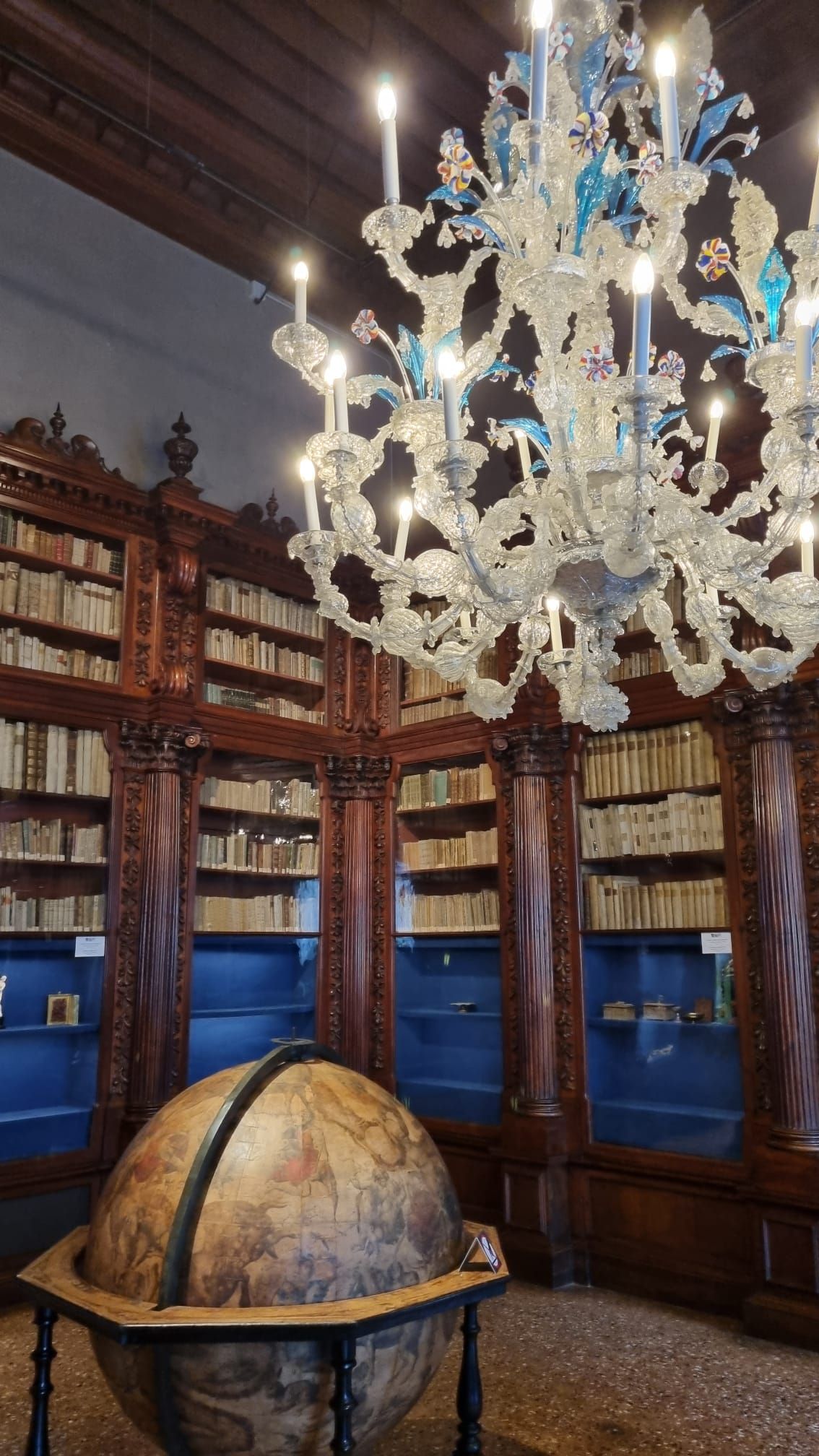 We continue with the embodiment of bliss: a library. More precisely: imposing walnut shelves dating from the 17th century, which surround the next room after being imported from the palace of the Venetian Pisani family, containing all sorts of old books that celebrate, through their exhibition, the history of the early Venetian printing industry. In the middle, two beautiful world maps, of which I mischievously wonder if they are hollow and hide aperitifs like the one my parents had in my early youth. On the ceiling, a beautiful Murano glass chandelier (see the next day's entry, for more on Murano).