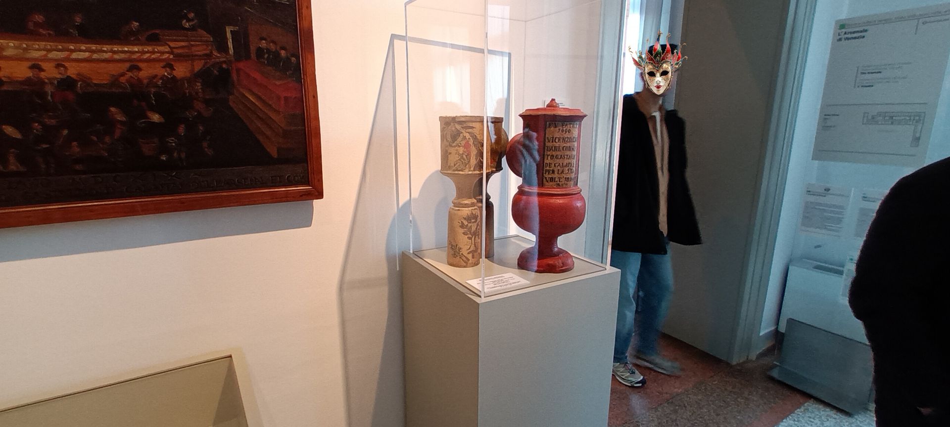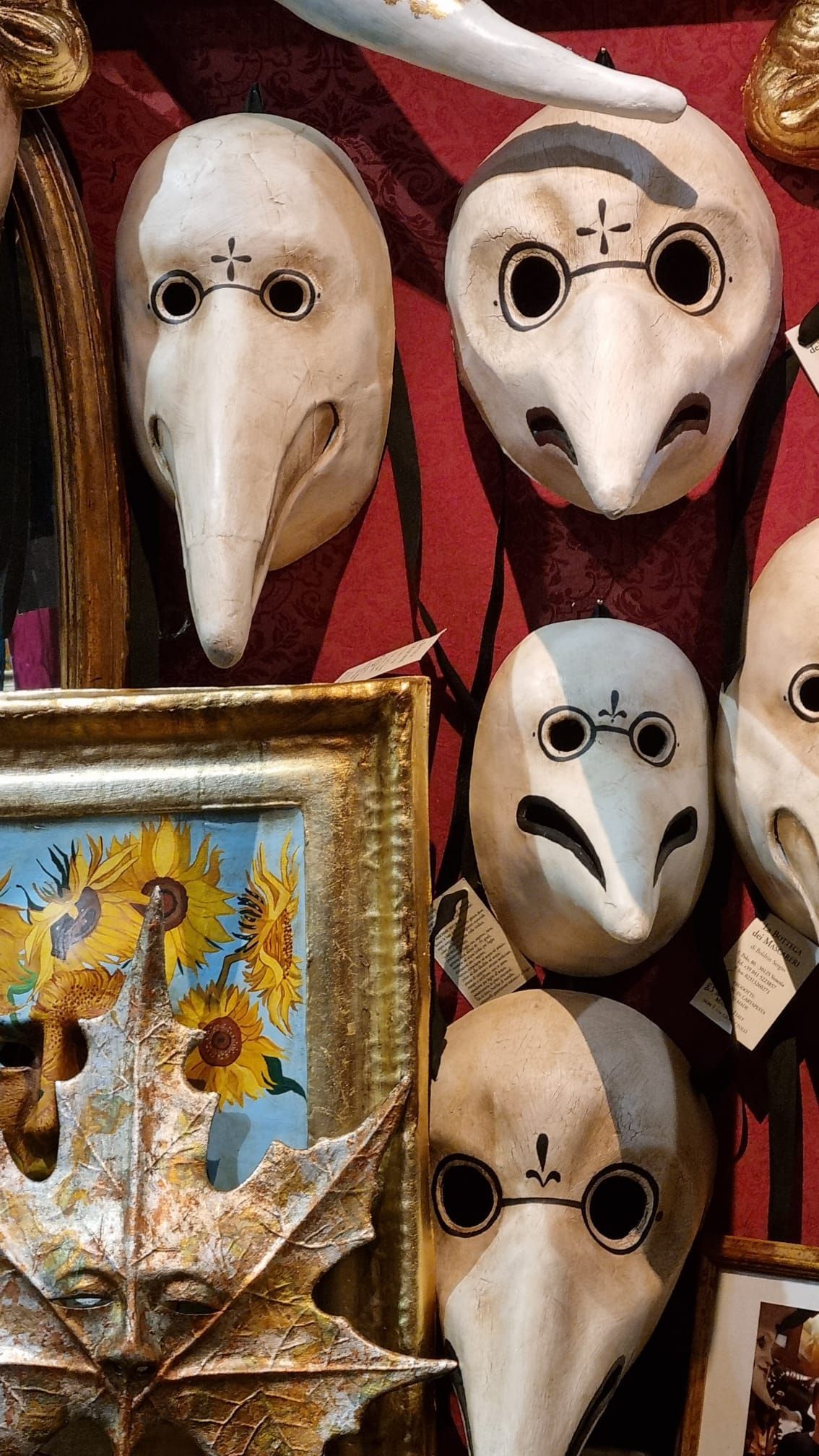 On the right, the famous mask of the plague doctors, which became a symbol of Venice because the city was affected particularly often by this medieval scourge (a commercial and qvant-la-lettre globalized port, built on water and therefore constantly saturated with humidity: the contaminated rats were big fans!), hence the invention of quarantine, on the island of Lazzaretto Nuovo: