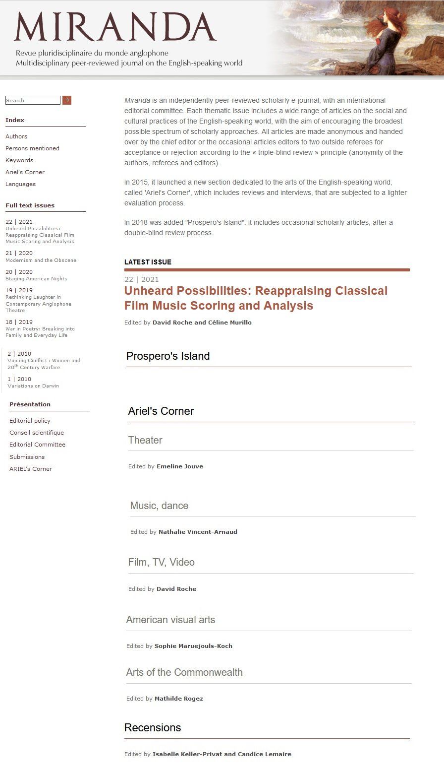 Le numéro d'automne 2023 de la revue Miranda, contient, dans la section musicale (dirigée par Nathalie Vincent-Arnaud) de sa rubrique Ariel's Corner, la première partie de ma "promenade musicale" intitulée "Quelques escapades musicales en Bretagne: voyage sans bateau du Donegal aux Highlands et du pays de Galles aux Asturies".