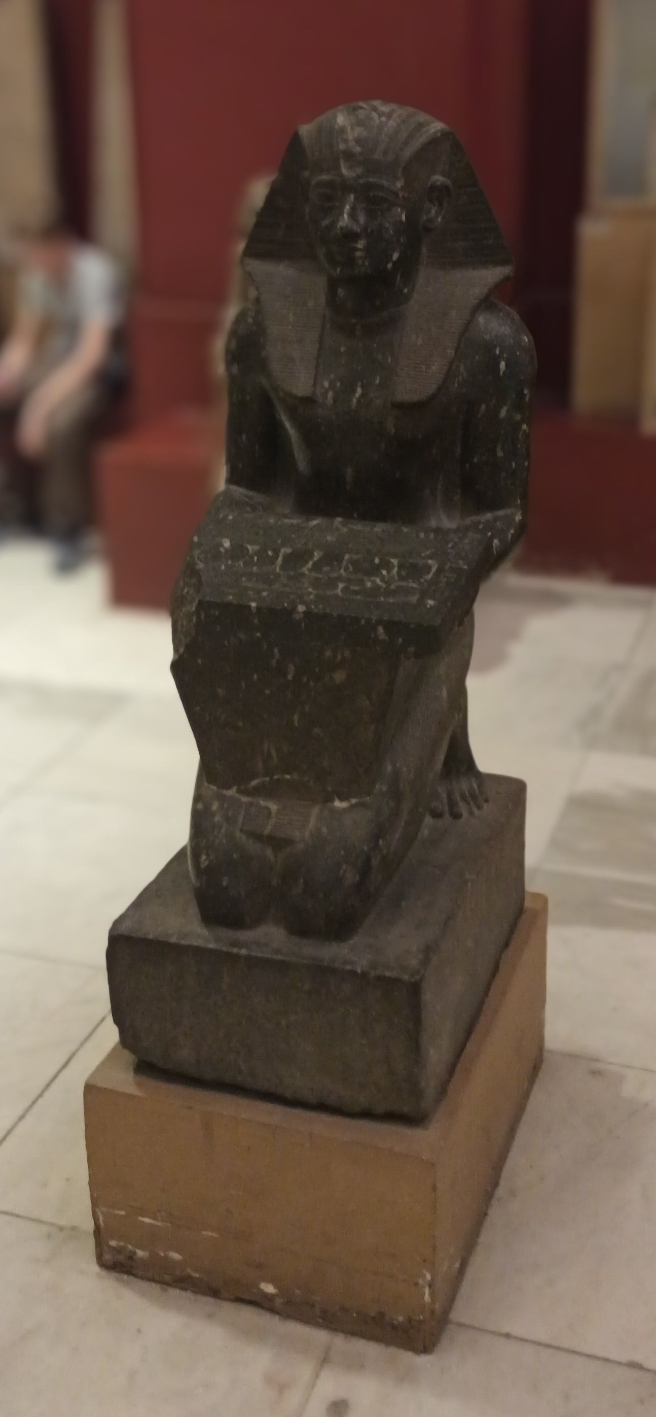 En plus de ses sphinx assis devant l'entrée du musée, il y des statues plus anthropomorphes de Thoutmôsis III à l'intérieur. Celle qui se trouve ci-dessous suit une mode qui a commencé après la VIème dynastie: le pharaon est représenté à genoux (devant un dieu), tenant dans ses mains deux pots dits "nu" pouvant contenir du lait ou du vin (en guise d'offrande au dieu). C'est une statue en diorite, trouvée à Karnak.