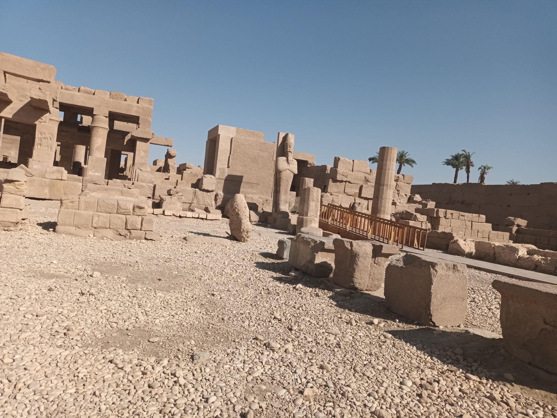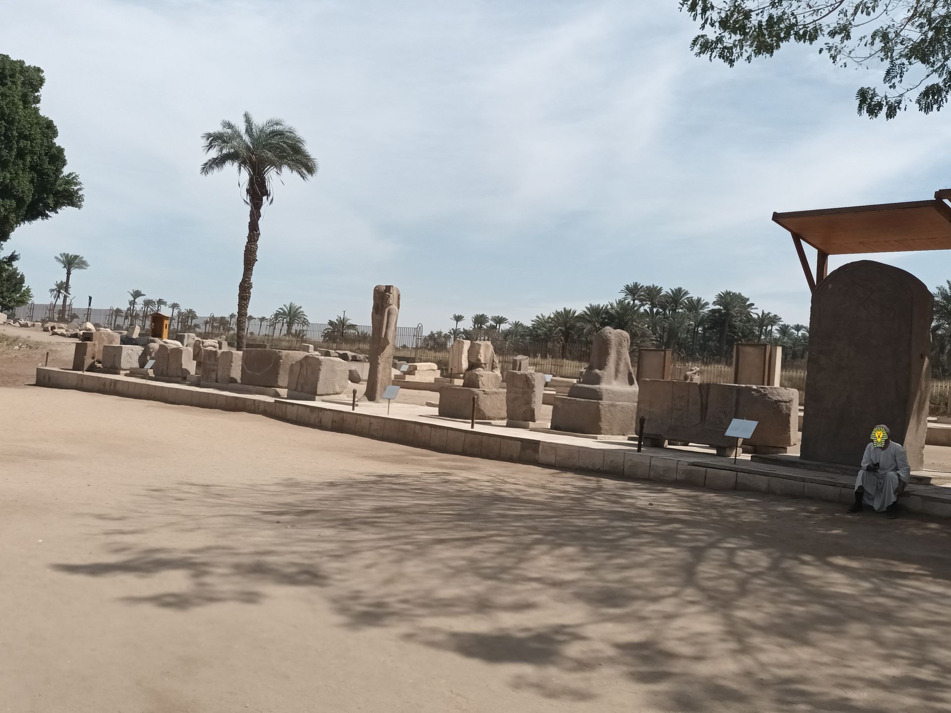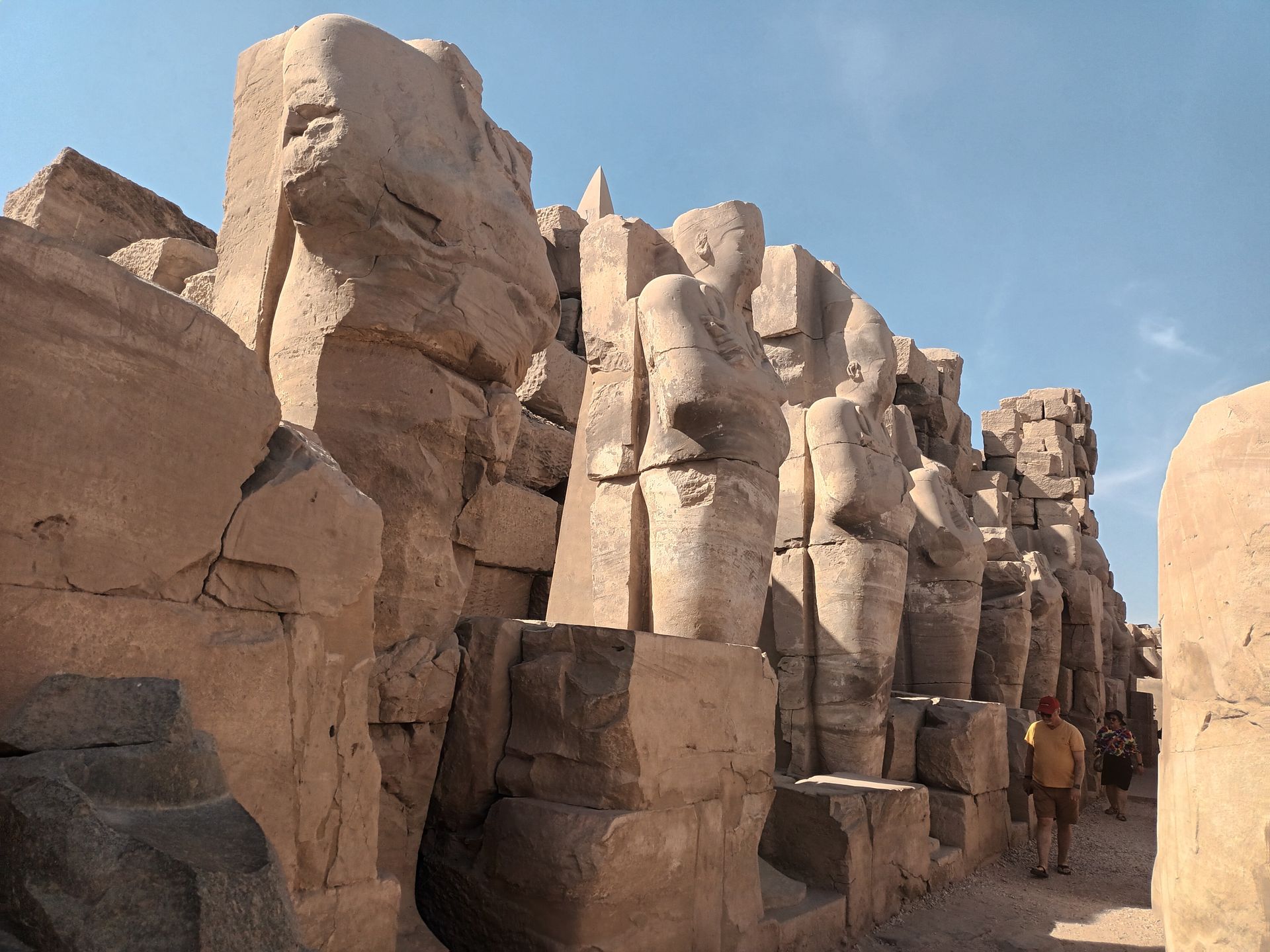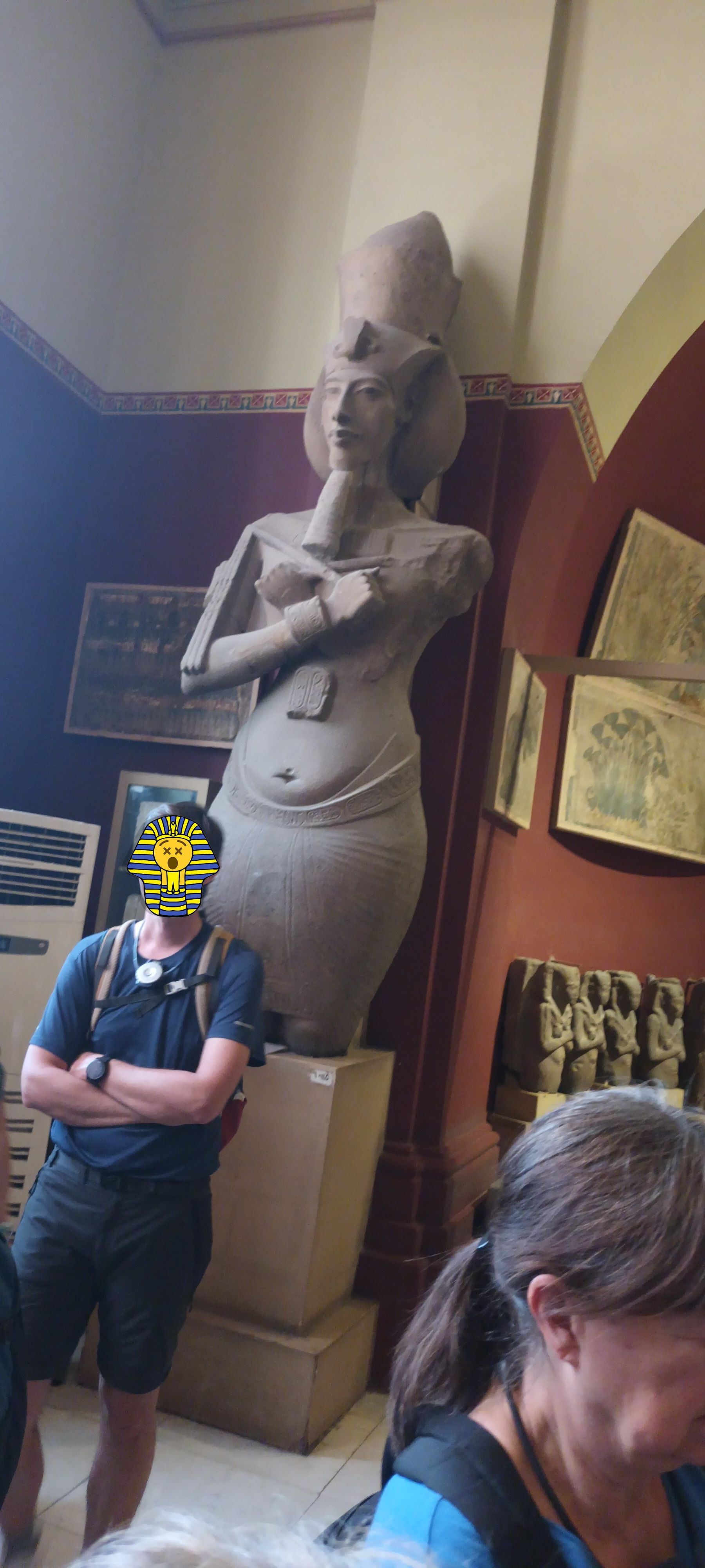 Pour commencer on a deux colosses diversement endommagés, tous les deux trouvés à Karnak. Celui qui a toujours sa couronne est en grès. Il y a aussi un très beau buste de ce pharaon non conformiste quelque part dans le musée, mais apparemment on ne l'a pas vu ou on est passé trop vite pour le remarquer.