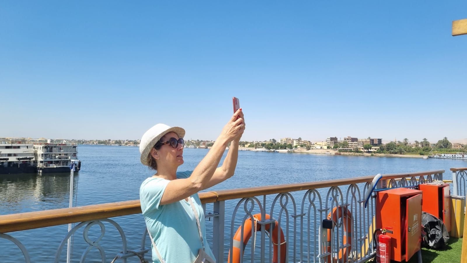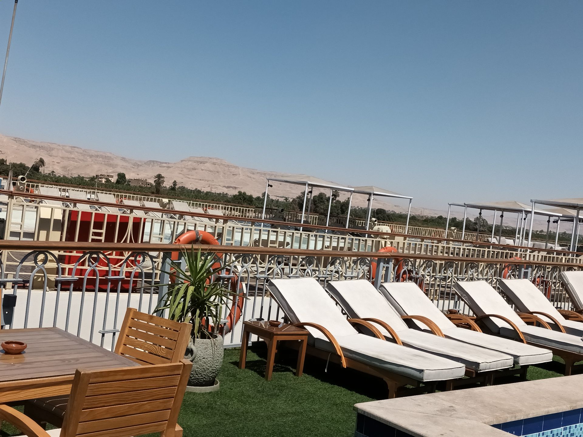 Vues des berges du Nil depuis les fauteuils confortables des ponts intérieurs: