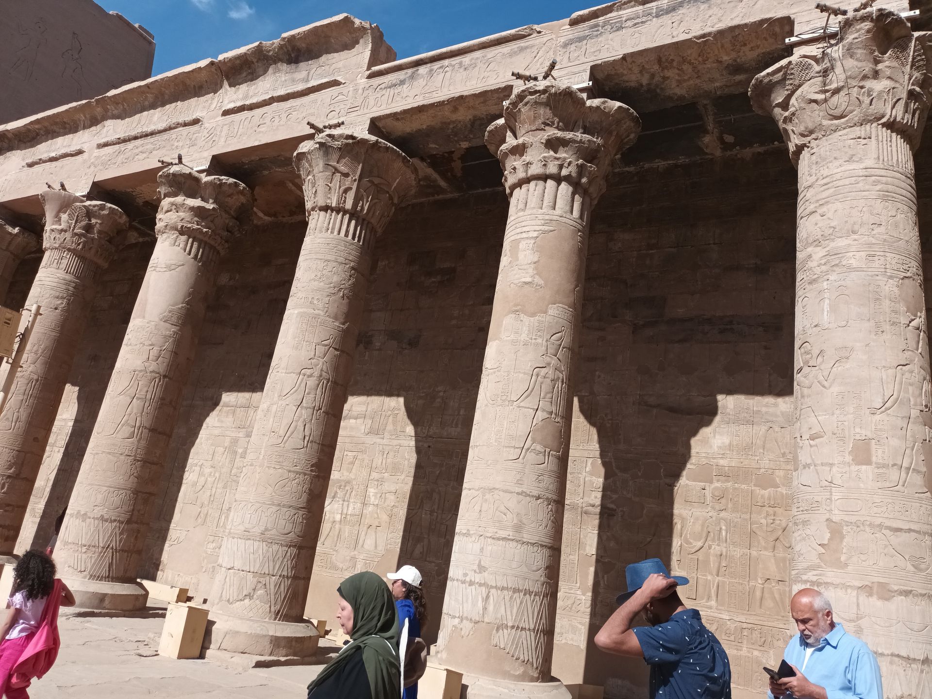 Le temple ptolémaïque d'Horus, à Edfou, près d'Assouan, en Haute-Égypte, fut la première étape de ce périple au long du Nil, sur un navire de croisière appelé Nile Capital. Cette visite, comme toutes celles qu'on allait faire en Haute-Égypte, se fit sous la direction d'un guide affable, drôle et captivant, métisse arabe et nubien, ancien boxeur et footballeur, du nom d'Amr (prononcé Amrou).
