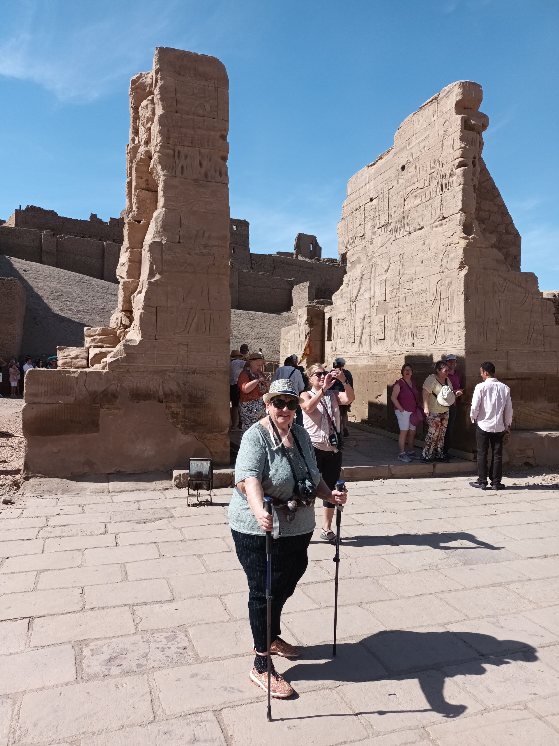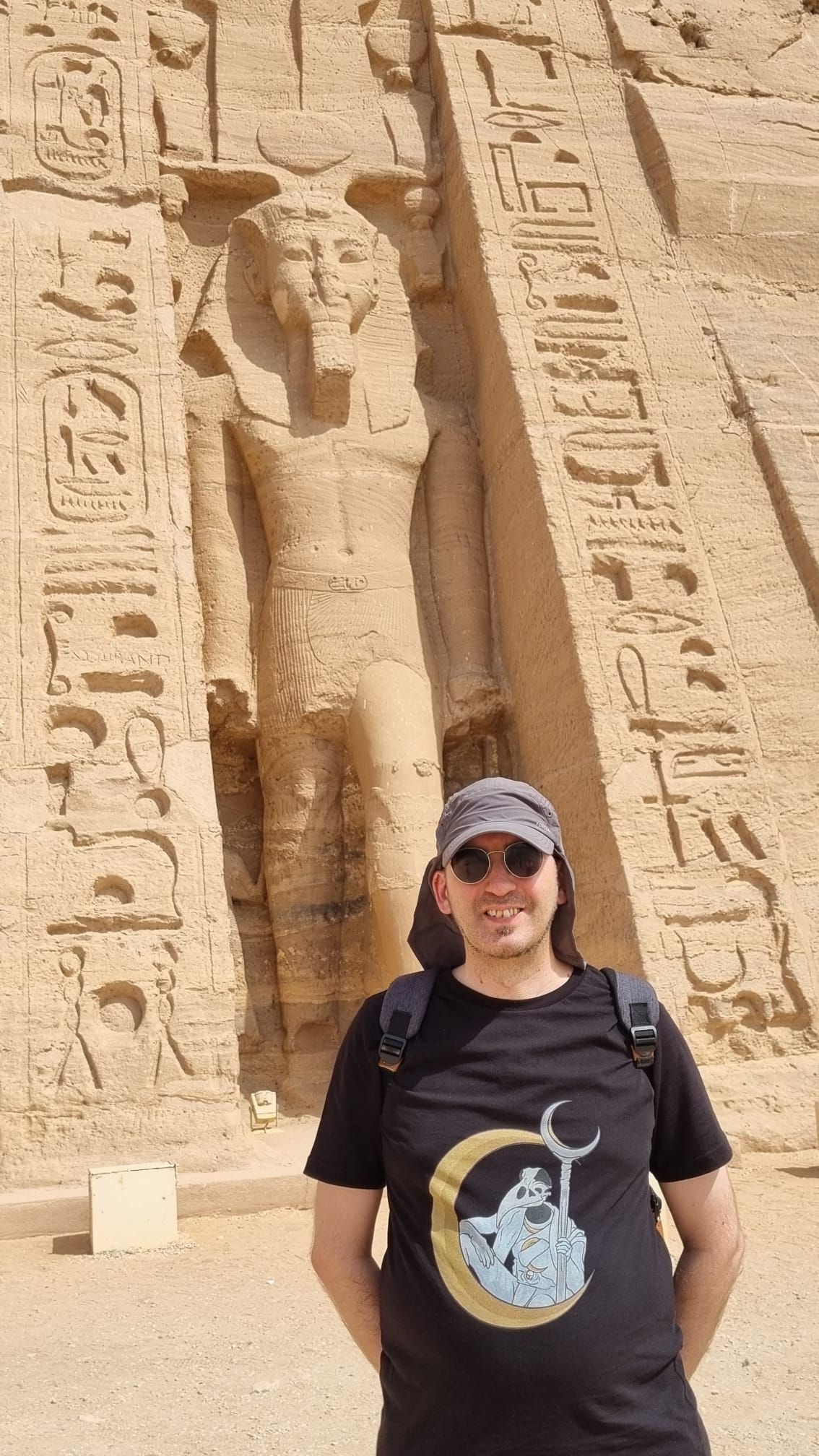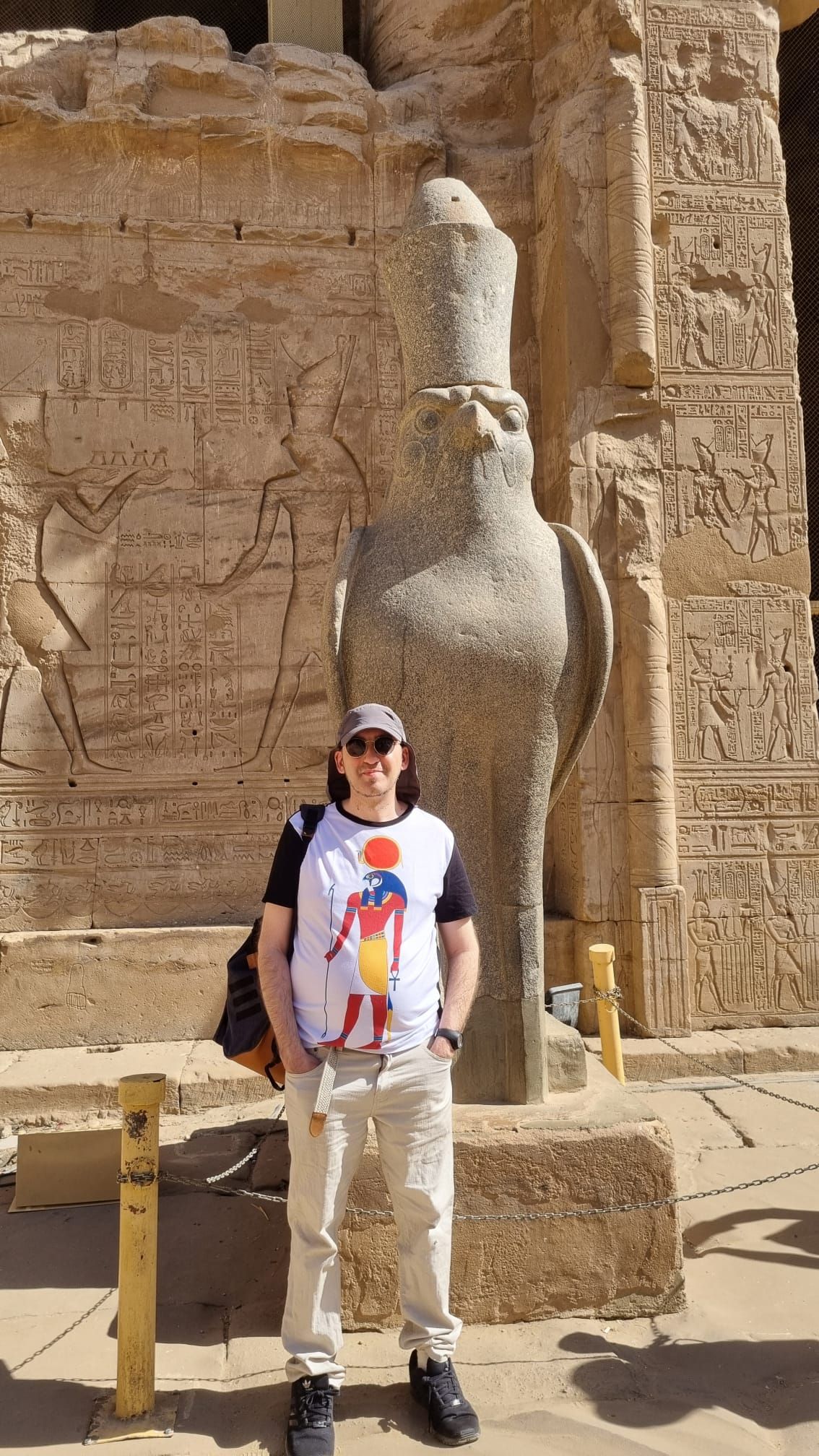 À l'entrée du Temple d'Horus à Edfou, en tenue de supporter d'Horus dans son match retour victorieux contre Set.