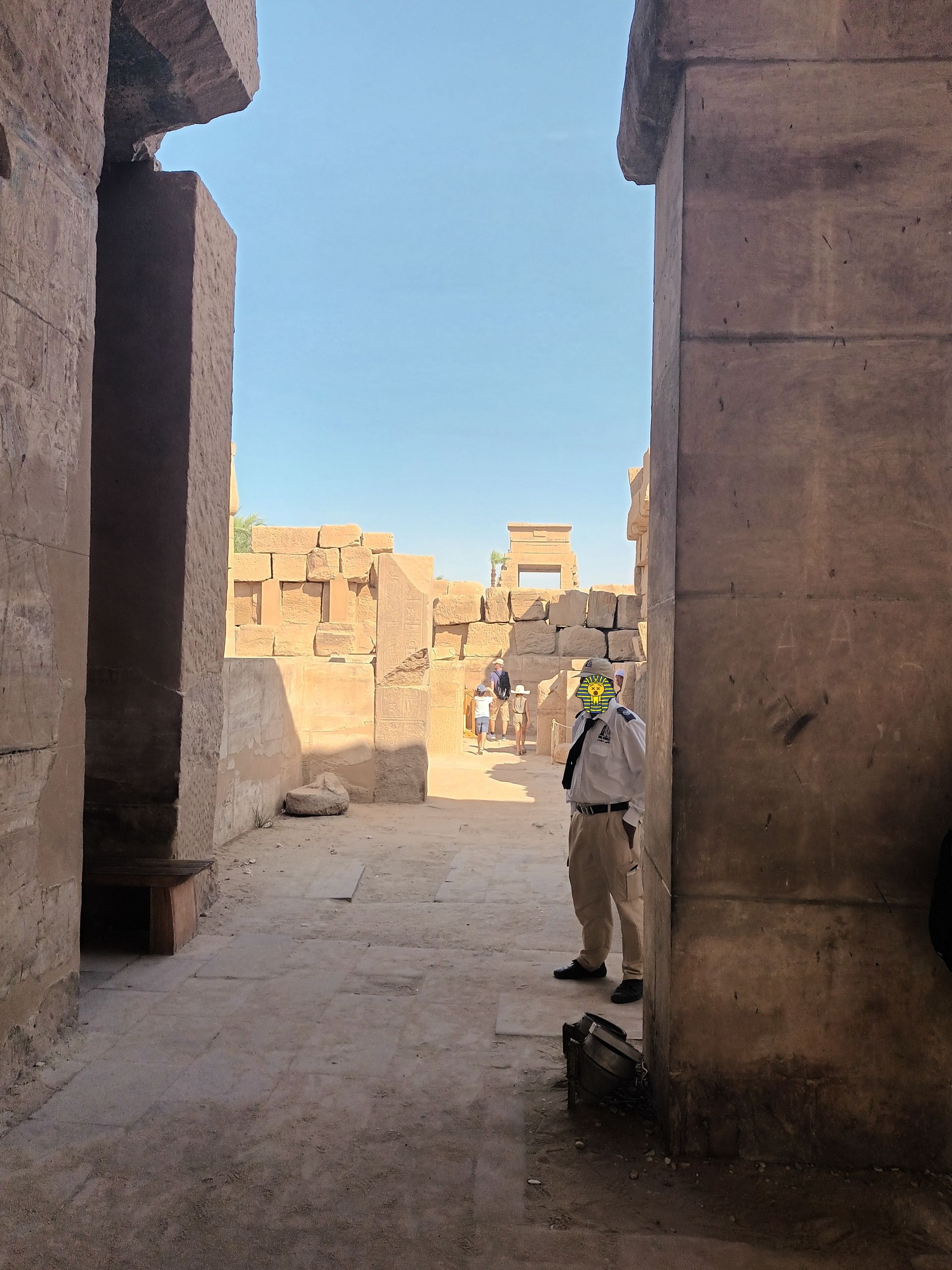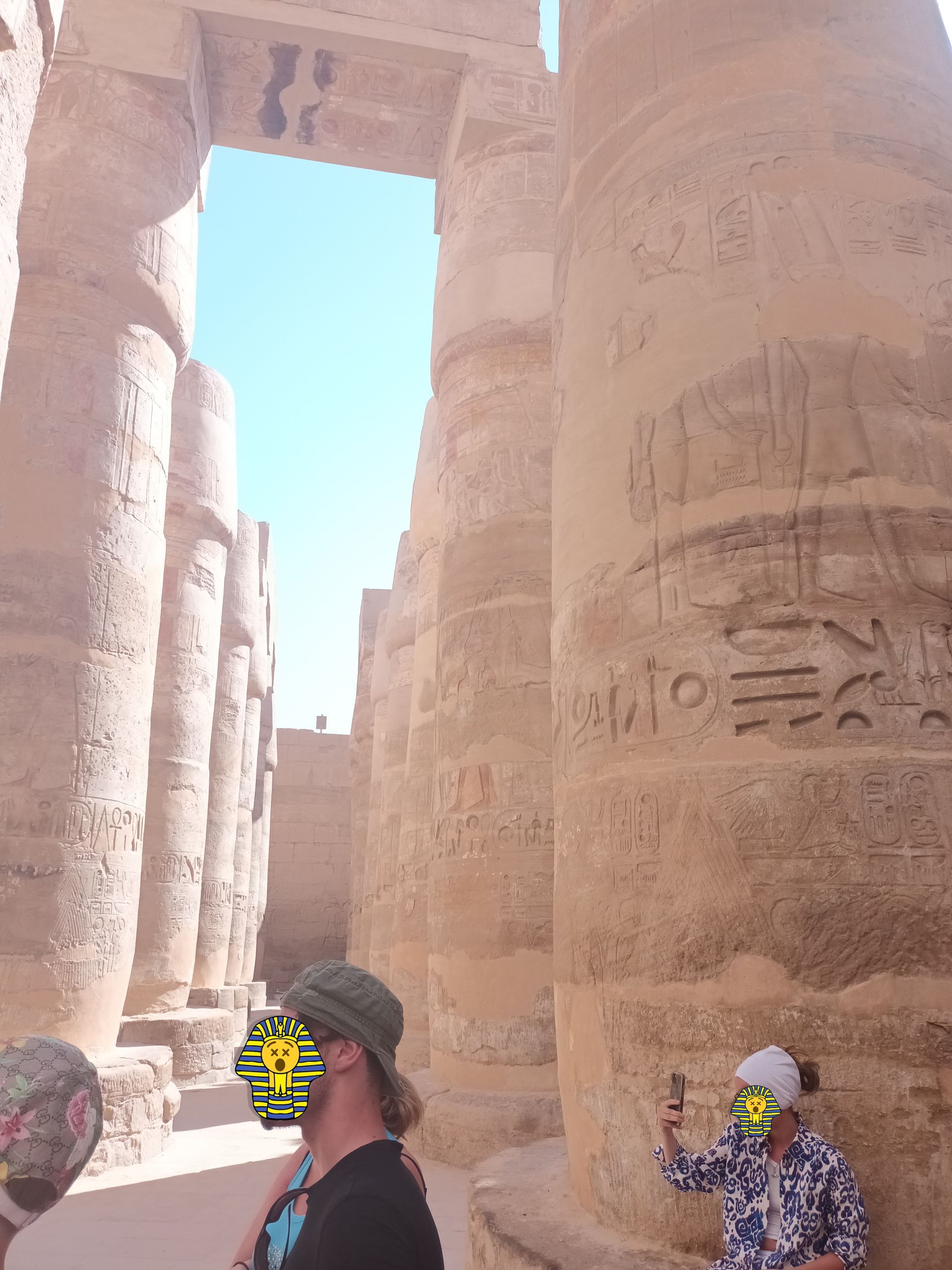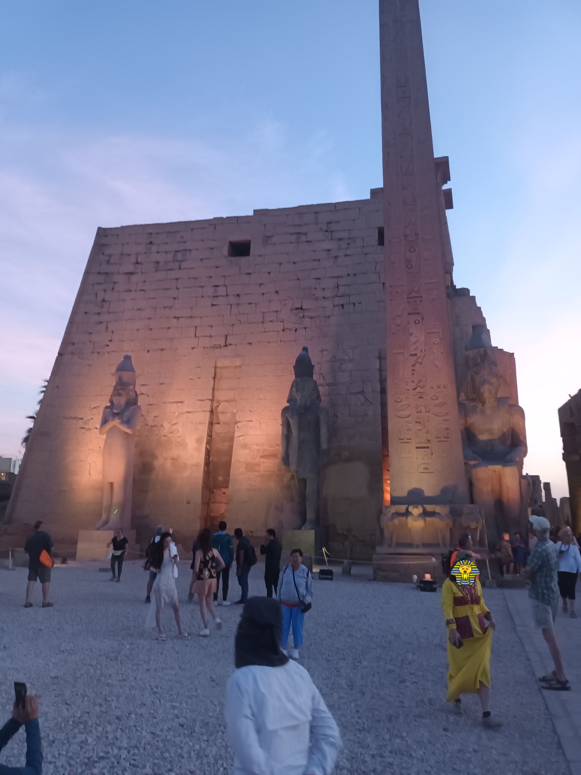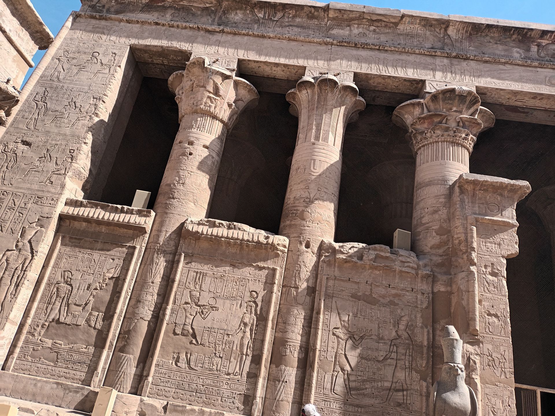 À l'entrée du Temple d'Horus à Edfou, en tenue de supporter d'Horus dans son match retour victorieux contre Set.