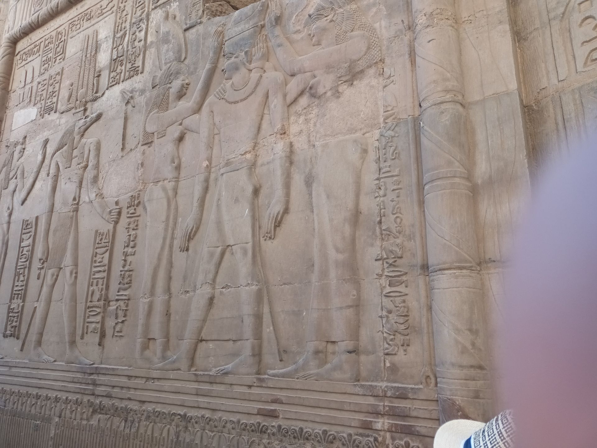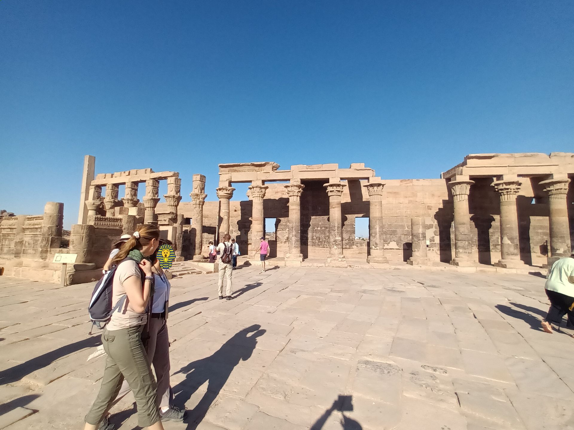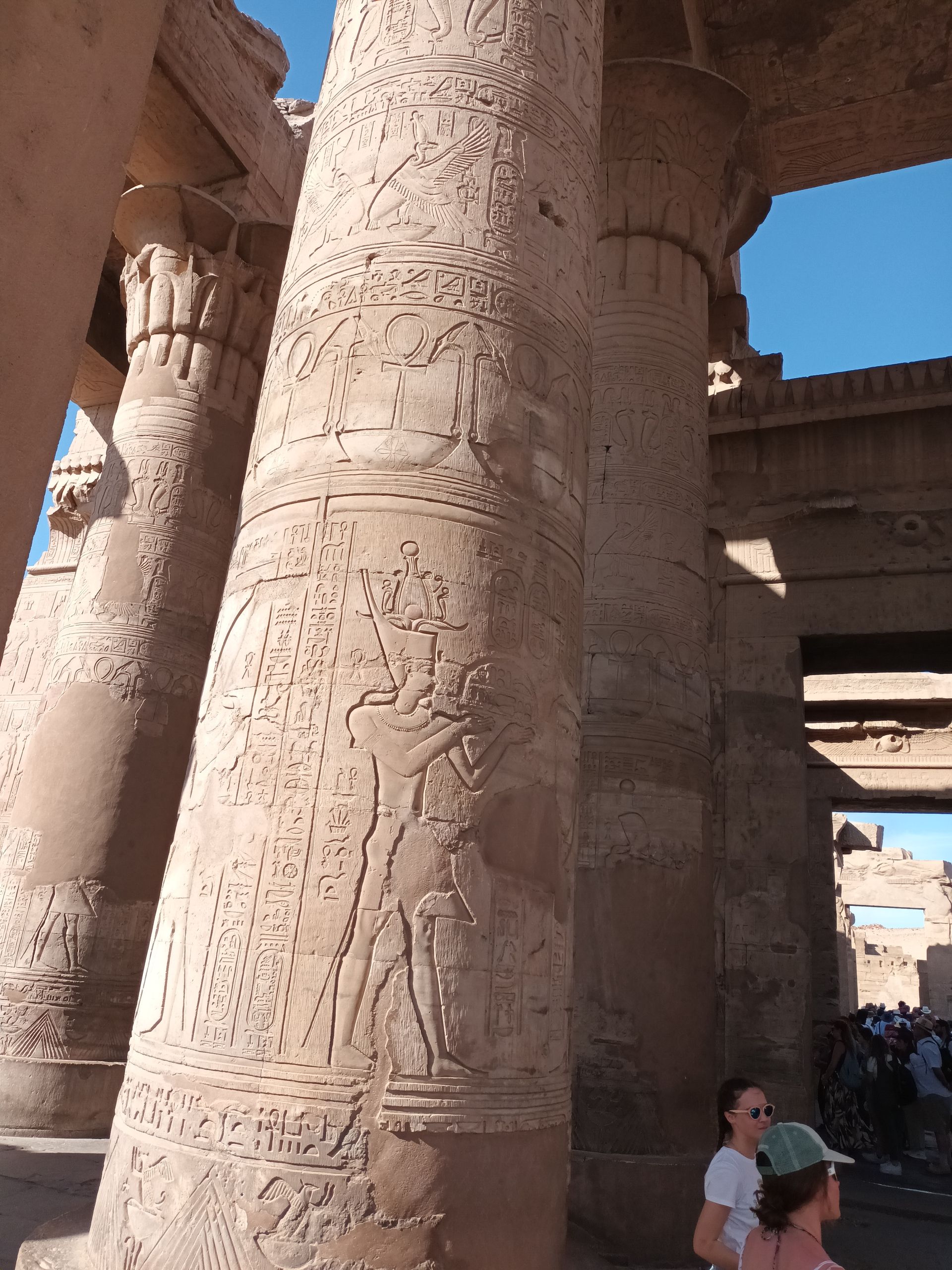 Après la pause de midi, le bateau nous a conduits jusqu'au pied du temple de Kôm Ombo, construction de la même période que celui d'Edfou, très comparable dans sa structure, si ce n'est que c'est un double temple, dédié à la fois au dieu crocodile Sobek et à Haroëris (un avatar d'Horus dont le nom signifie "Horus l'Ancien"/"Horus l'Aîné").