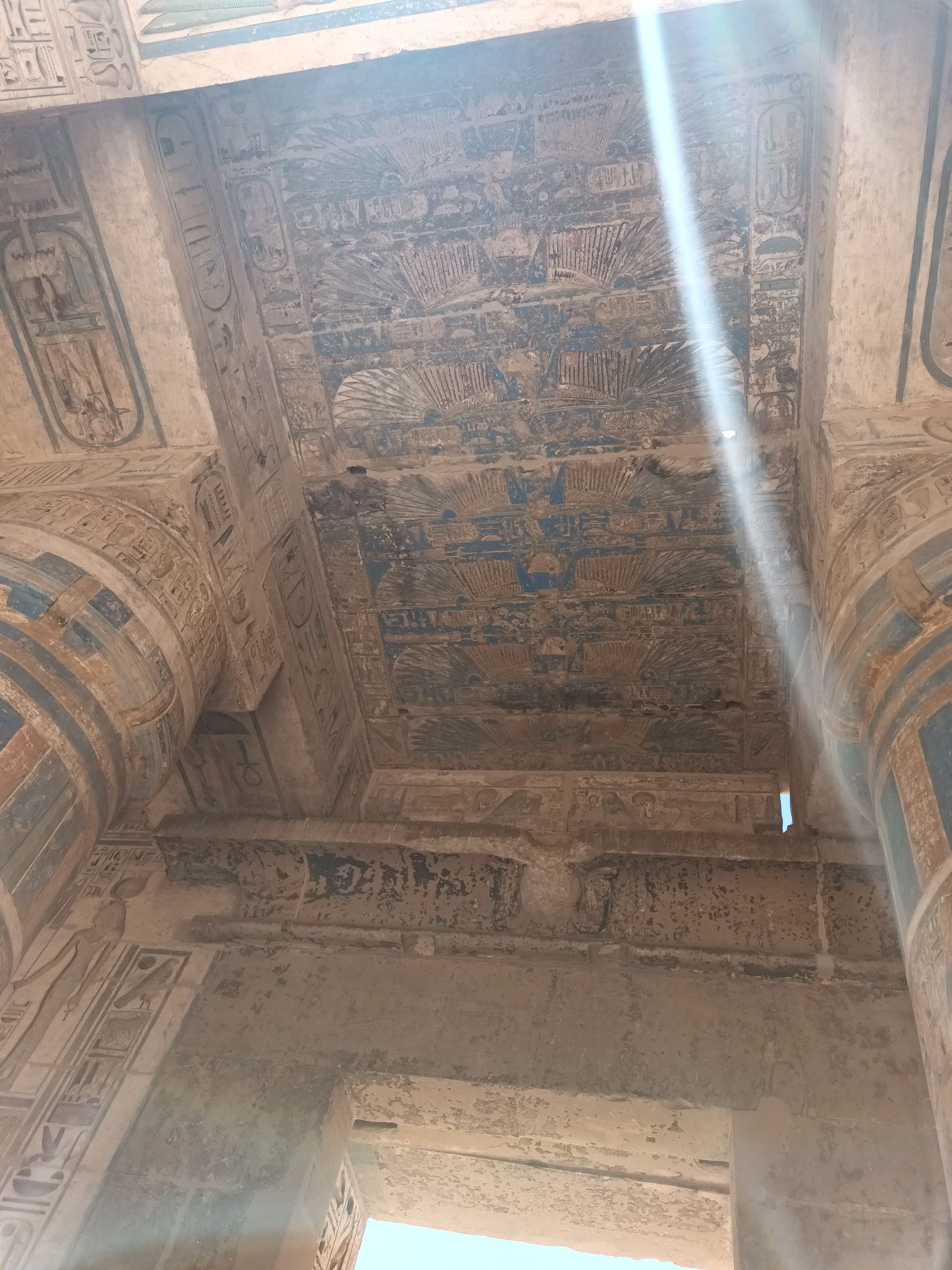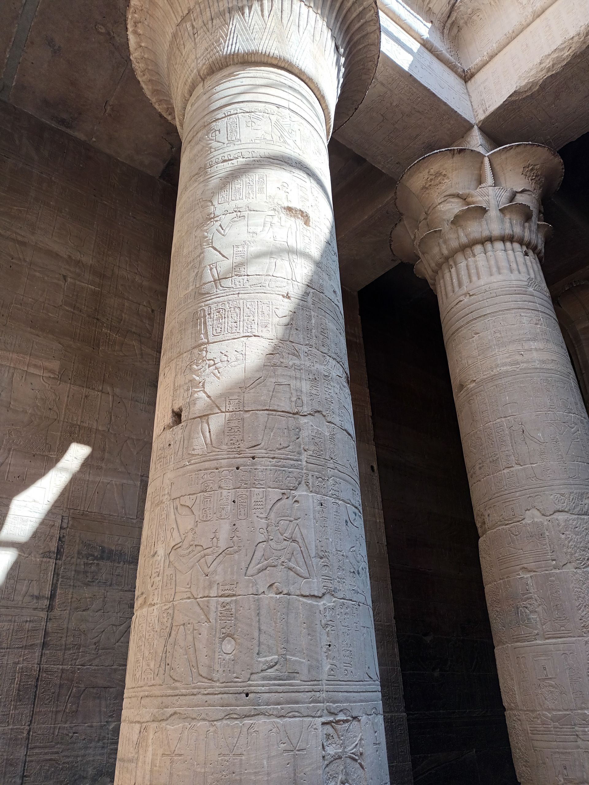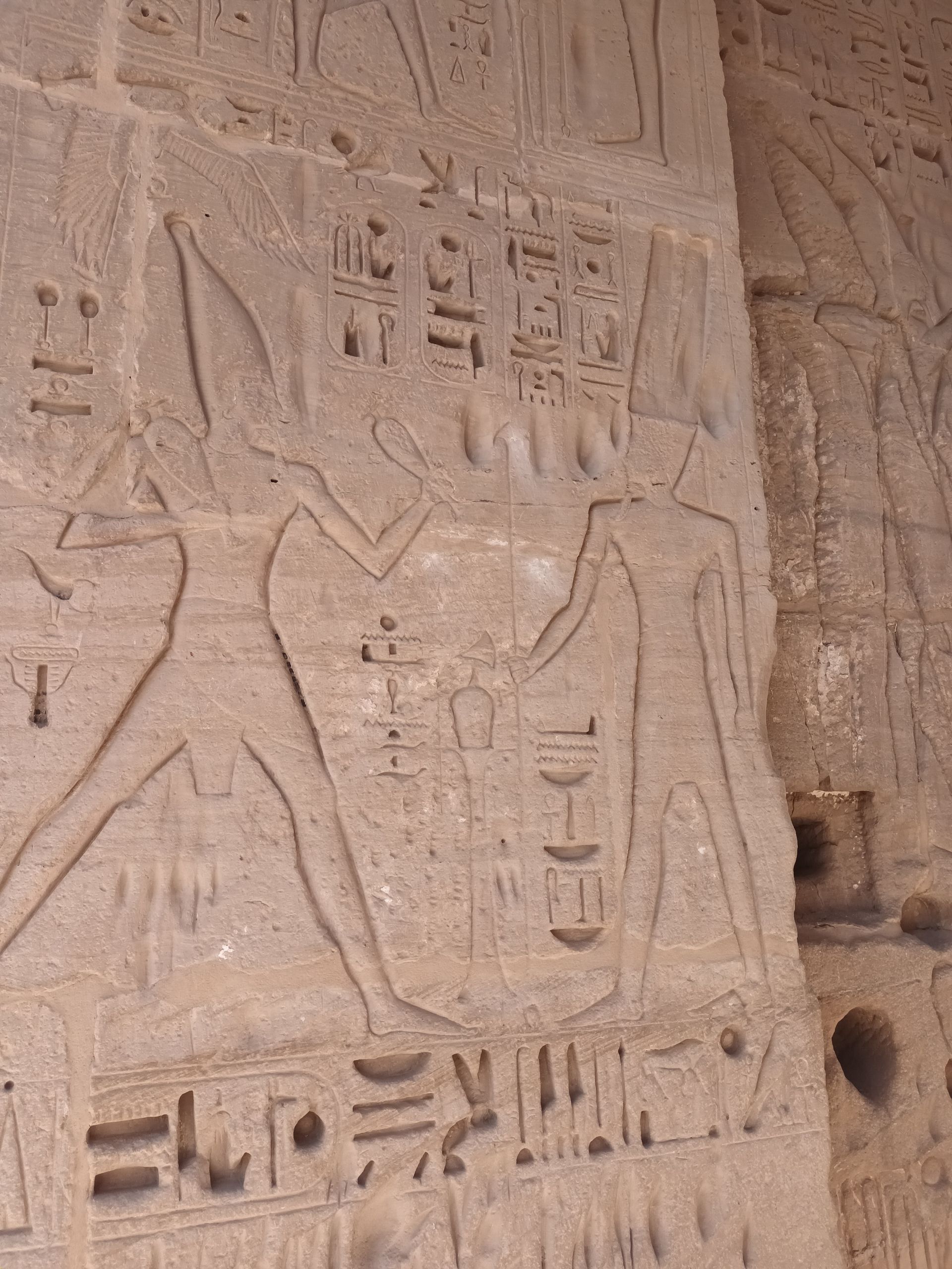Du coup, puisque le prestigieux dieu pharaon Horus est de la partie, pour le couronnement, on imagine bien que nombre de colonnes de la salle hypostyle lui sont consacrées, mais il y en a aussi un certain nombre qui figurent l'épouse d'Horus, la déesse Hathor — ainsi, comme le système symbolique du temple suggère qu'Horus parraine directement Ramsès, la même chose est suggérée concernant Hathor et l'épouse de Ramsès, Nefertari: