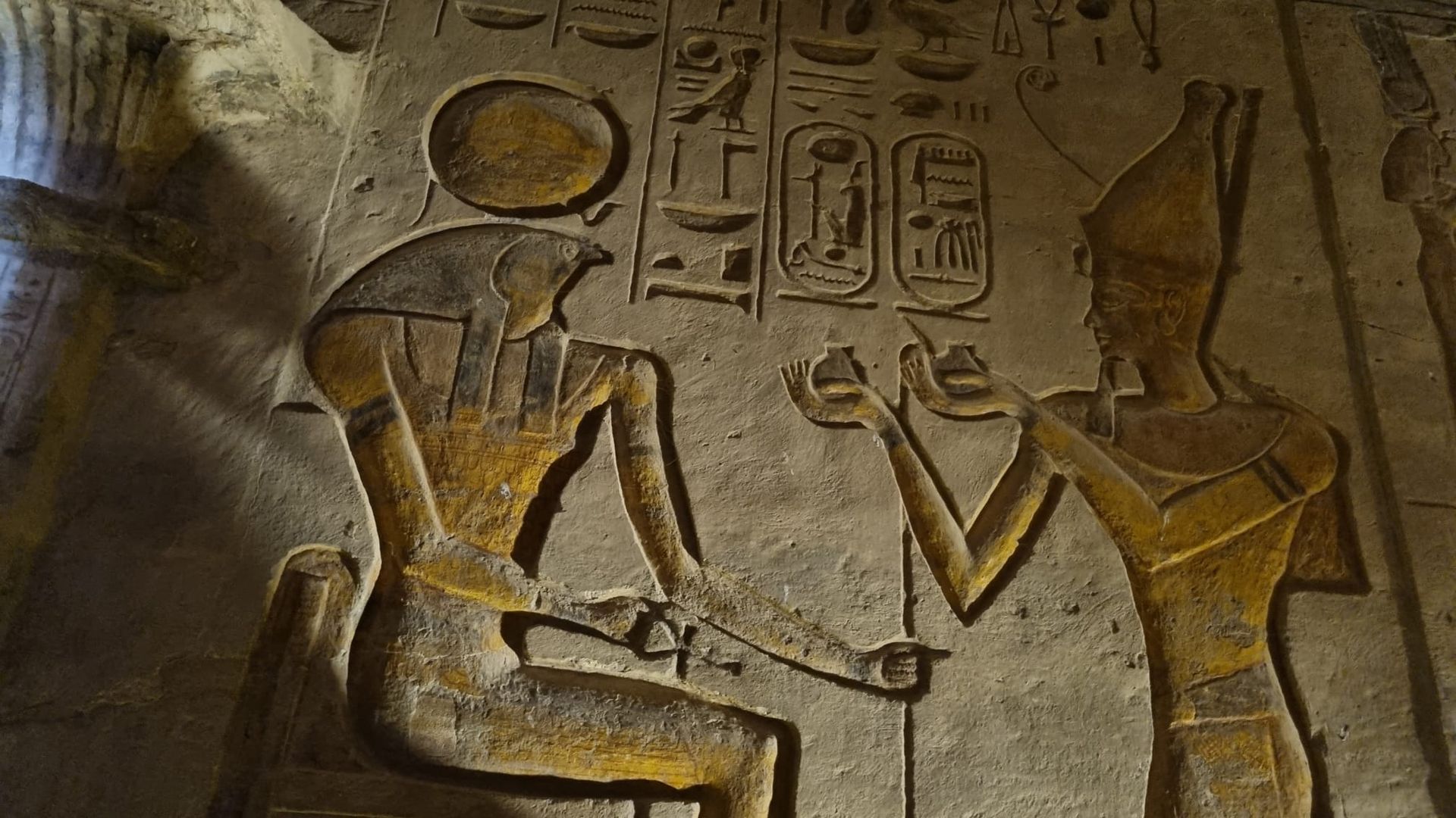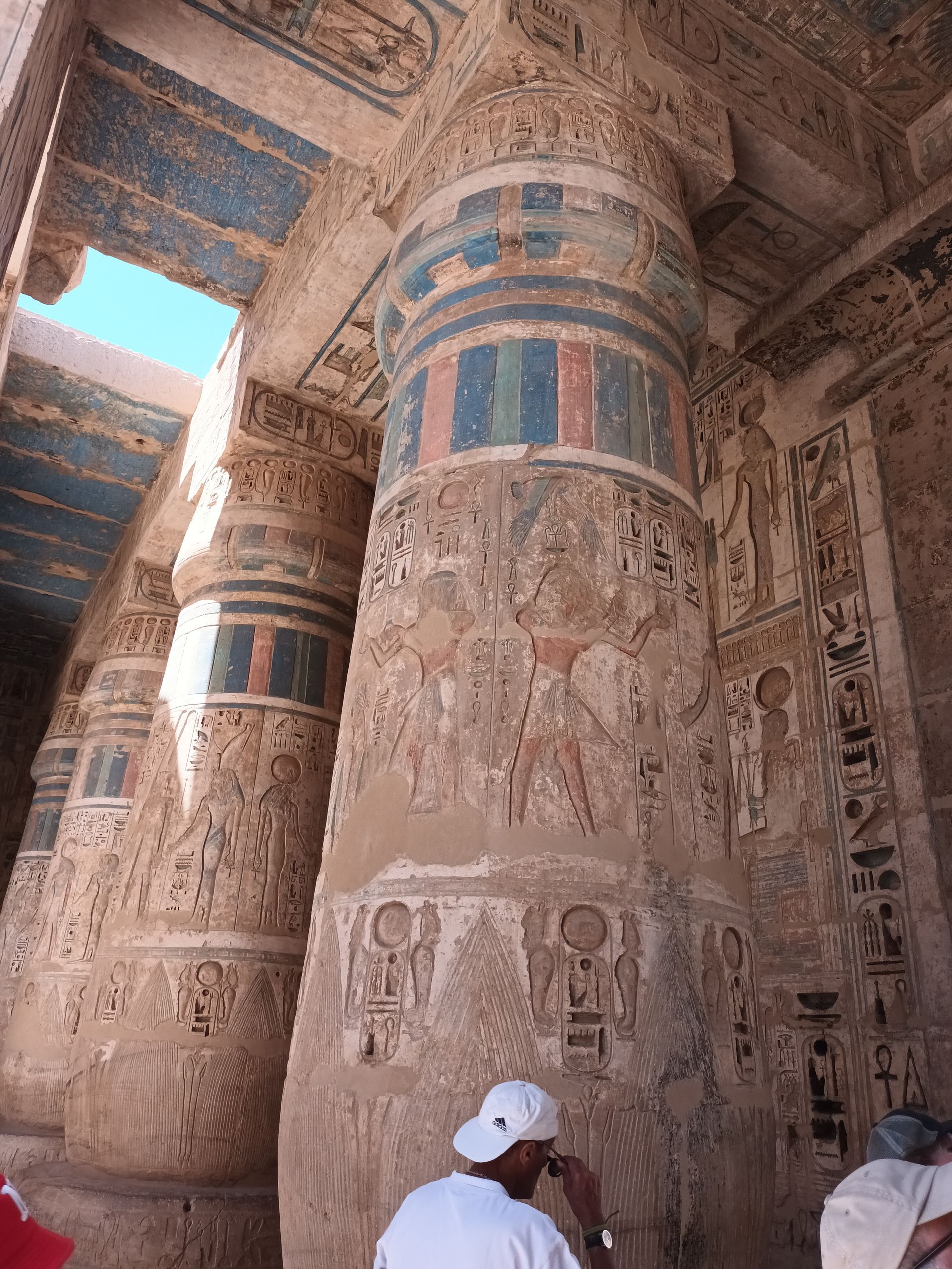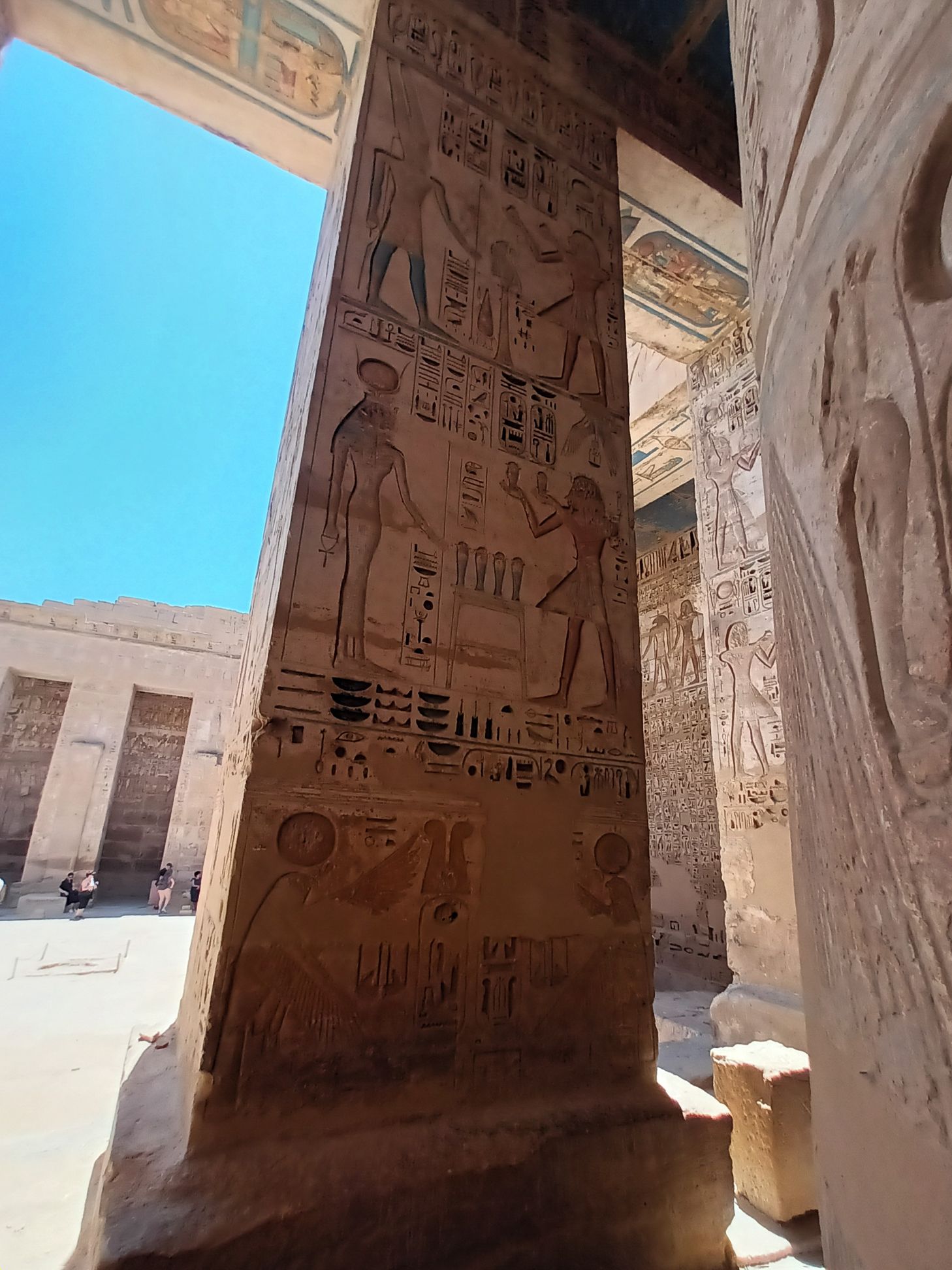Du coup, puisque le prestigieux dieu pharaon Horus est de la partie, pour le couronnement, on imagine bien que nombre de colonnes de la salle hypostyle lui sont consacrées, mais il y en a aussi un certain nombre qui figurent l'épouse d'Horus, la déesse Hathor — ainsi, comme le système symbolique du temple suggère qu'Horus parraine directement Ramsès, la même chose est suggérée concernant Hathor et l'épouse de Ramsès, Nefertari: