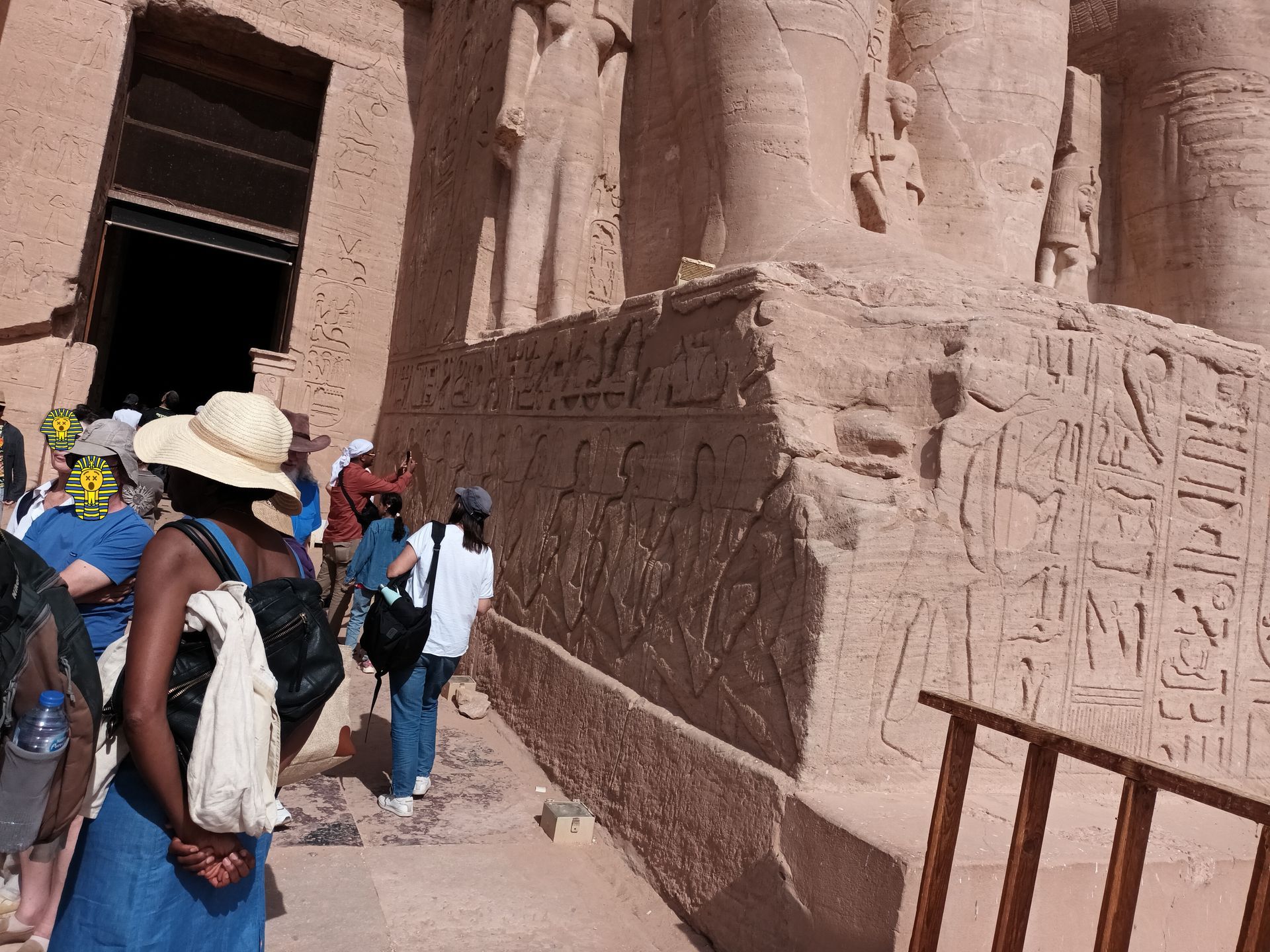 ...puis le bus a continué à nous rapprocher inexorablement de la frontière soudanaise, avant de bifurquer vers le lac Nasser une soixante-dizaine de kilomètres avant de changer de pays (mais de rester en Nubie!), et c'est ainsi qu'on a fini par se retrouver au pied des quatre fameux Ramsès géants qui veillent à l'entrée du temple d'Abou Simbel, colossale construction creusée à même la roche de la colline de Méha, et (comme le temple de Philae) entièrement démontée et reconstruite, dans les années 1960, pour la mettre à l'abri de la montée des eaux du lac Nasser à la suite de l'édification du haut barrage d'Assouan.