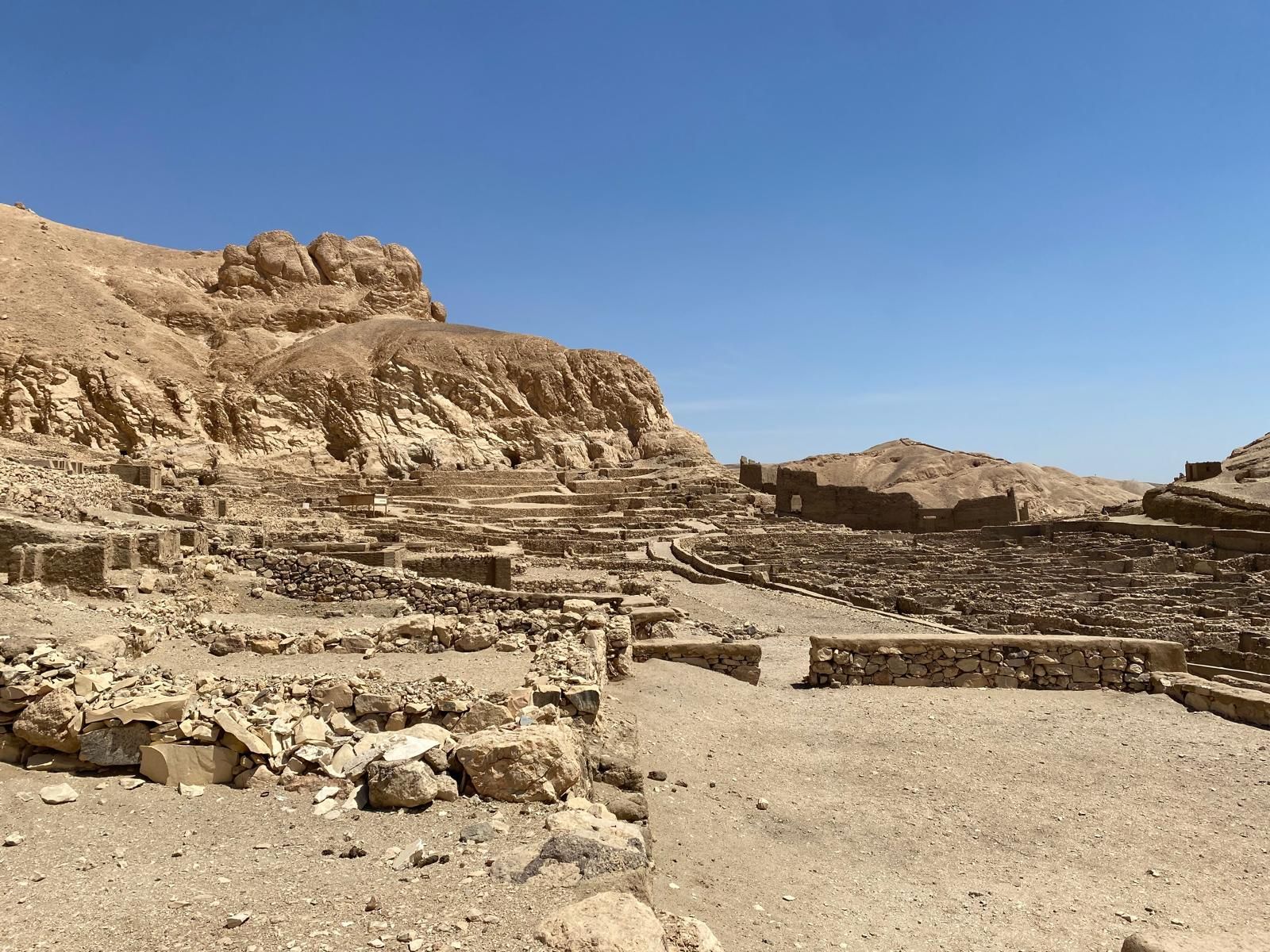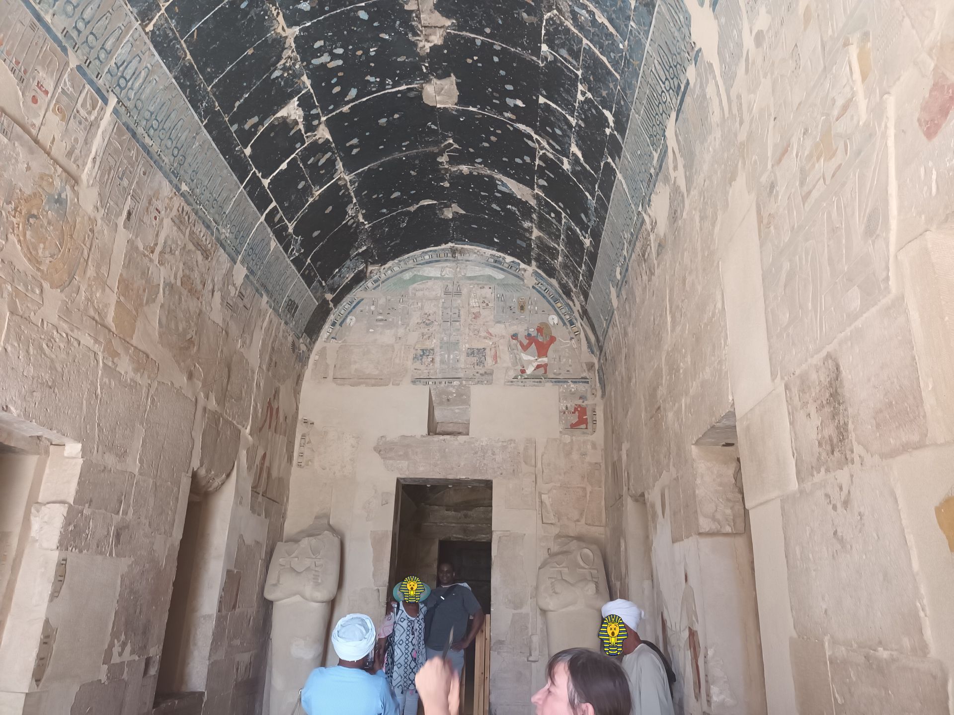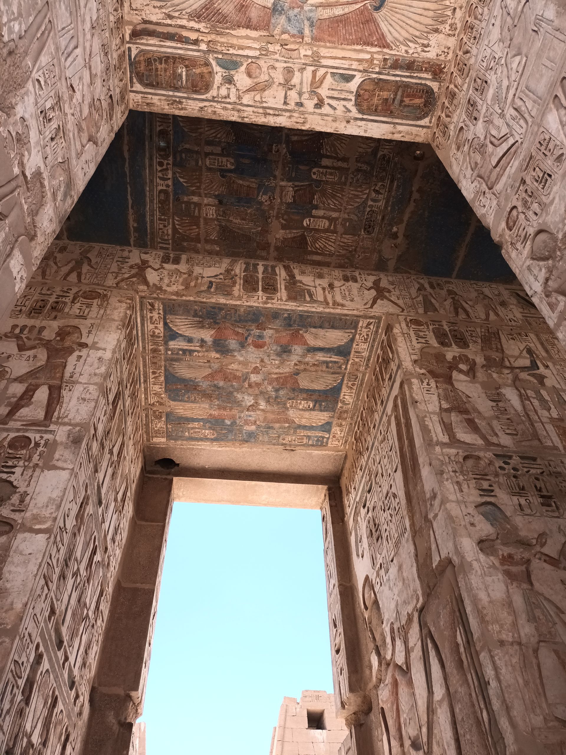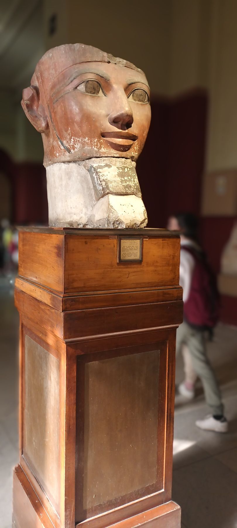 Ceci est une tête de calcaire peint, vestige d'une statue d'Hatchepsout qui aurait dû être parmi celles de son temple funéraire à Deir el-Bahari, dans la nécropole de Thèbes (oui, celui qu'on a visité, avec les gigantesques terrasses). Donc les statues qu'on a effectivement vues étaient peintes comme celle-là, à l'origine:
