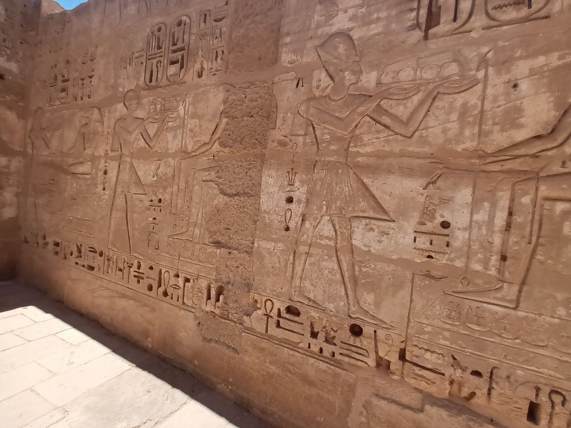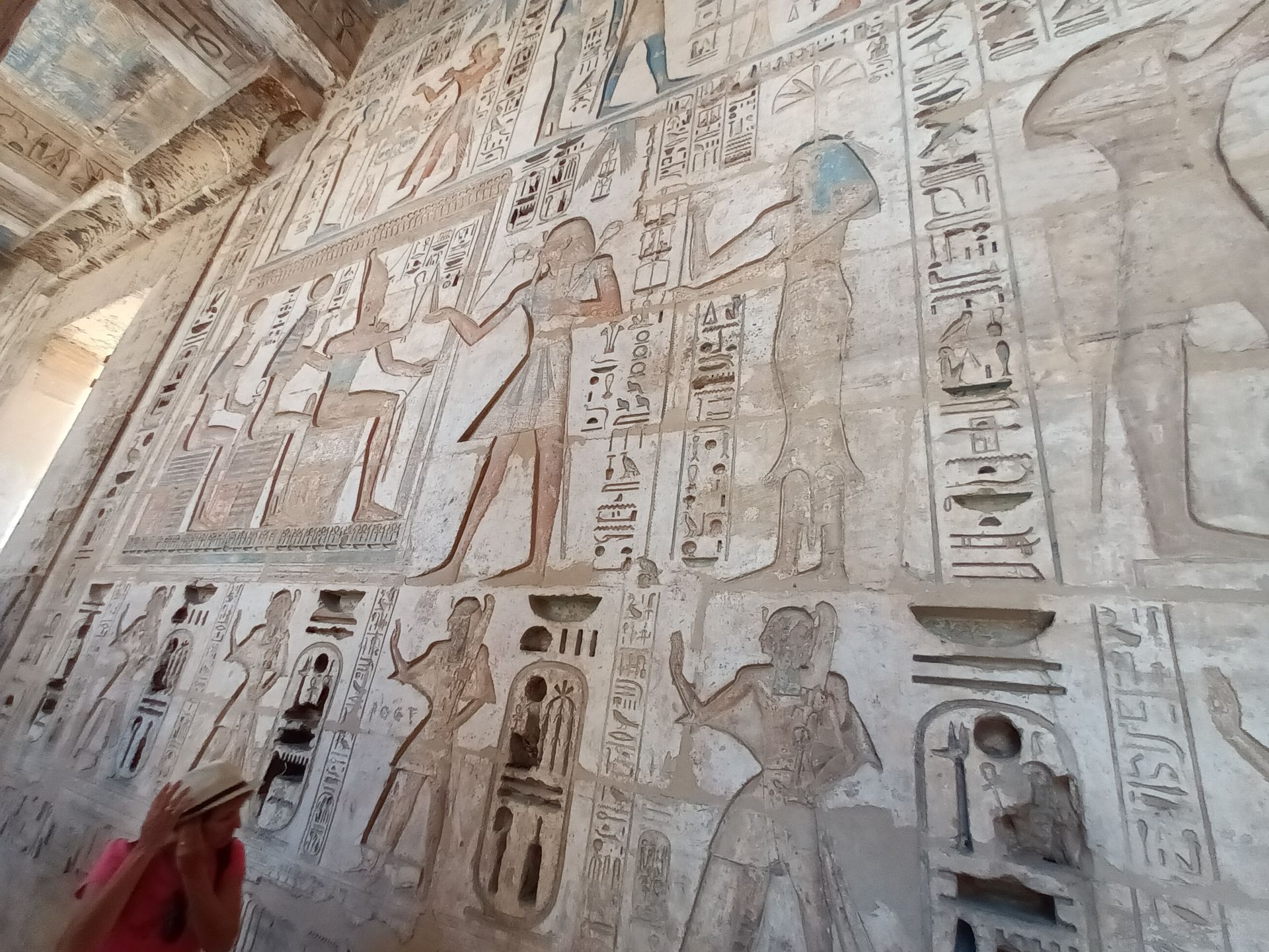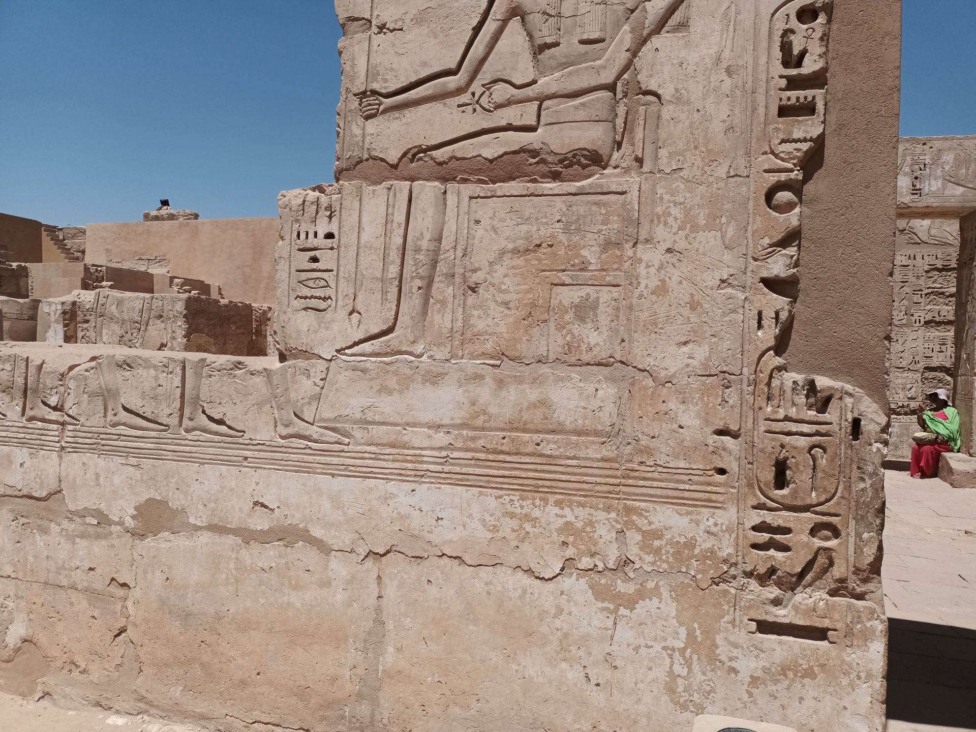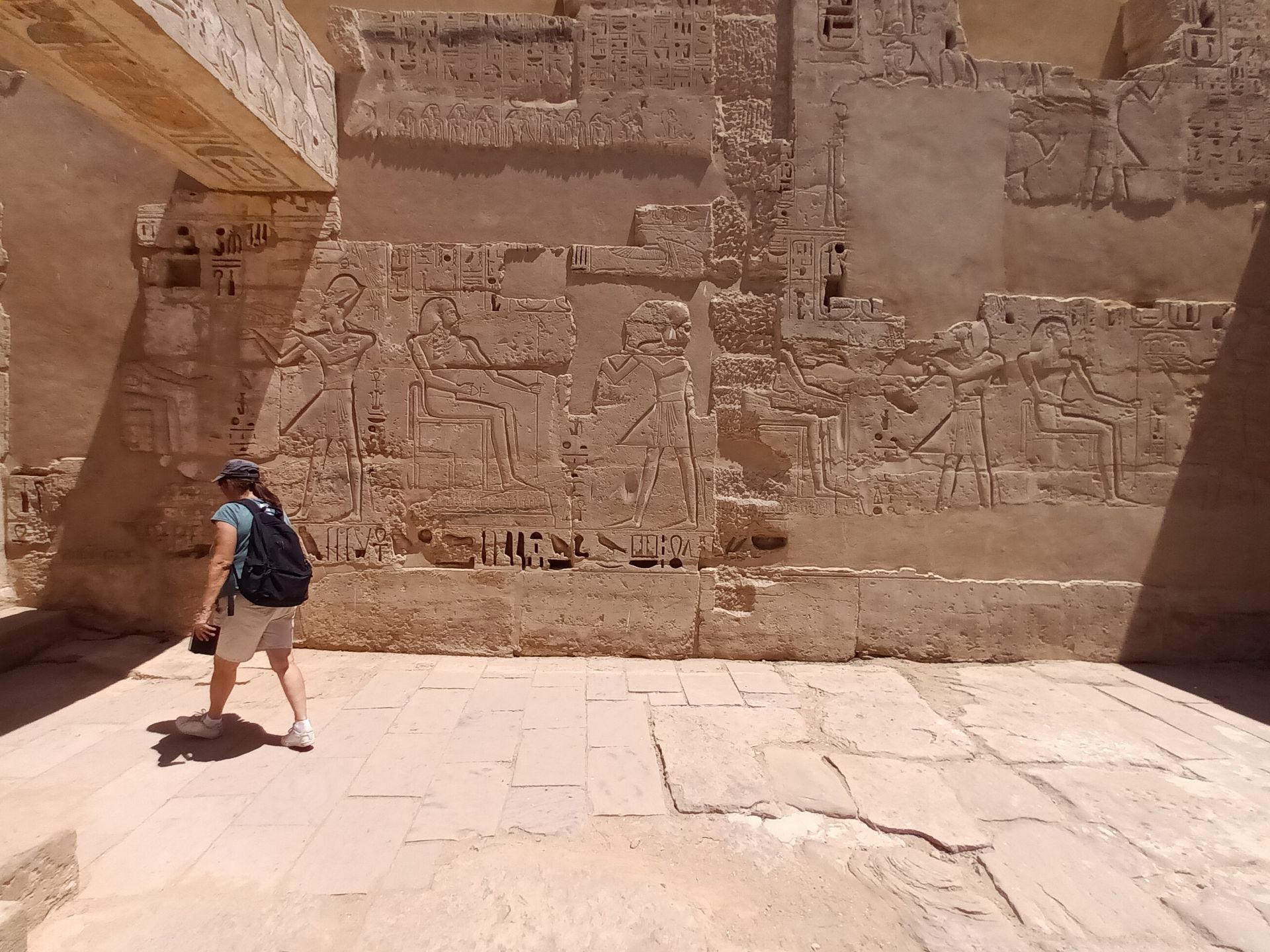 On y trouve aussi des bas-reliefs également à la gloire de Ramsès II (forcément, c'est son temple, fait par lui, pour lui, et même avec lui). Ainsi de la bataille de Qadesh (Syrie, 1274 AEC), que l'animateur anglais Greg Jenner a qualifié, dans le podcast historique BBC You're Dead to Me, de première "fake news" de l'histoire (dans le sens où Ramsès a perdu cette bataille contre les Hittites, mais a convaincu le peuple égyptien qu'il l'avait gagnée triomphalement) (dans la bouche de notre guide, c'est plutôt: il l'a gagnée triomphalement, mais les Syriens prétendent qu'il l'a perdue):