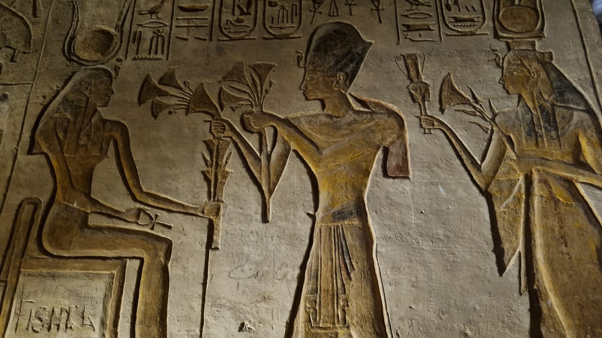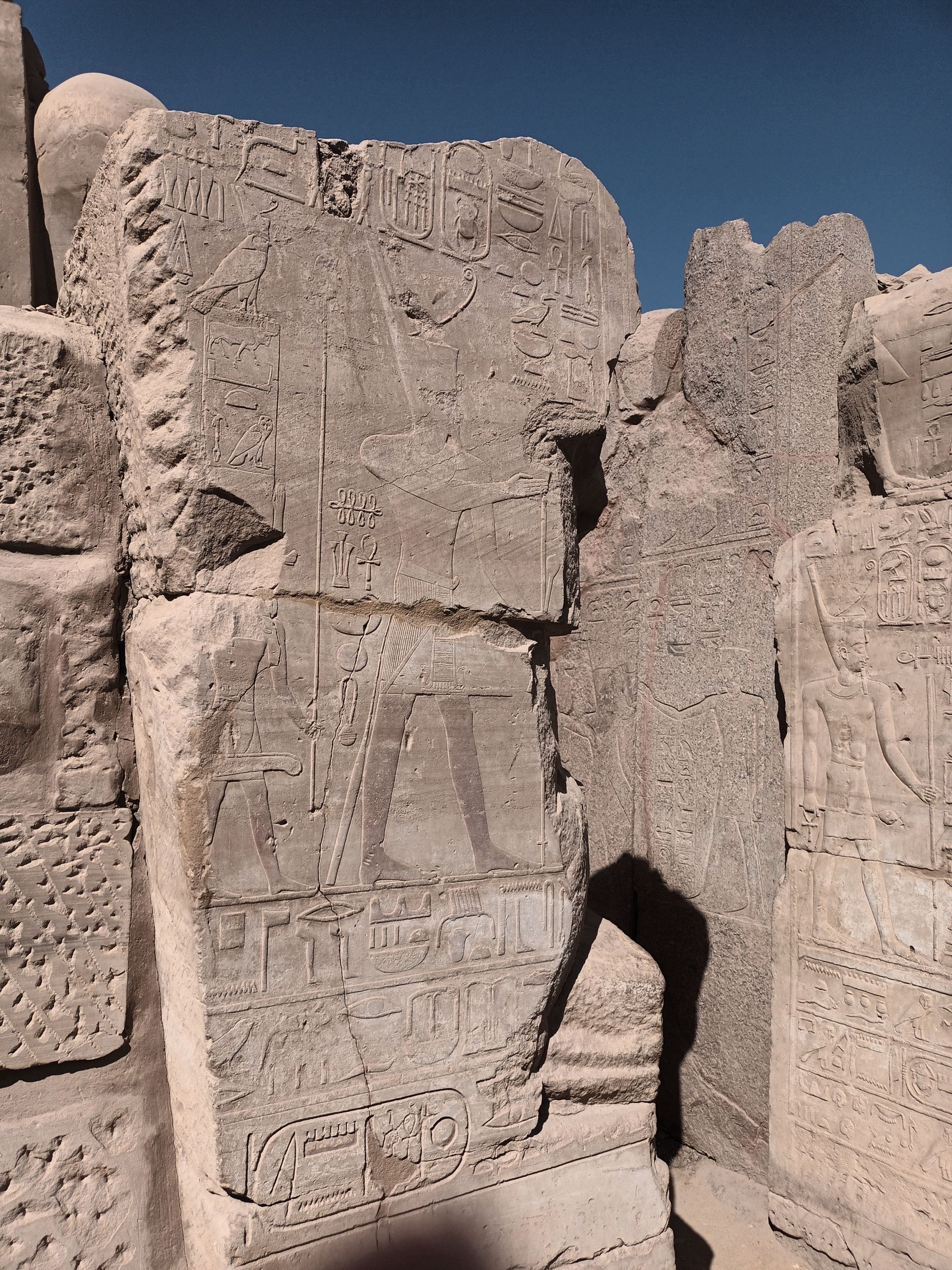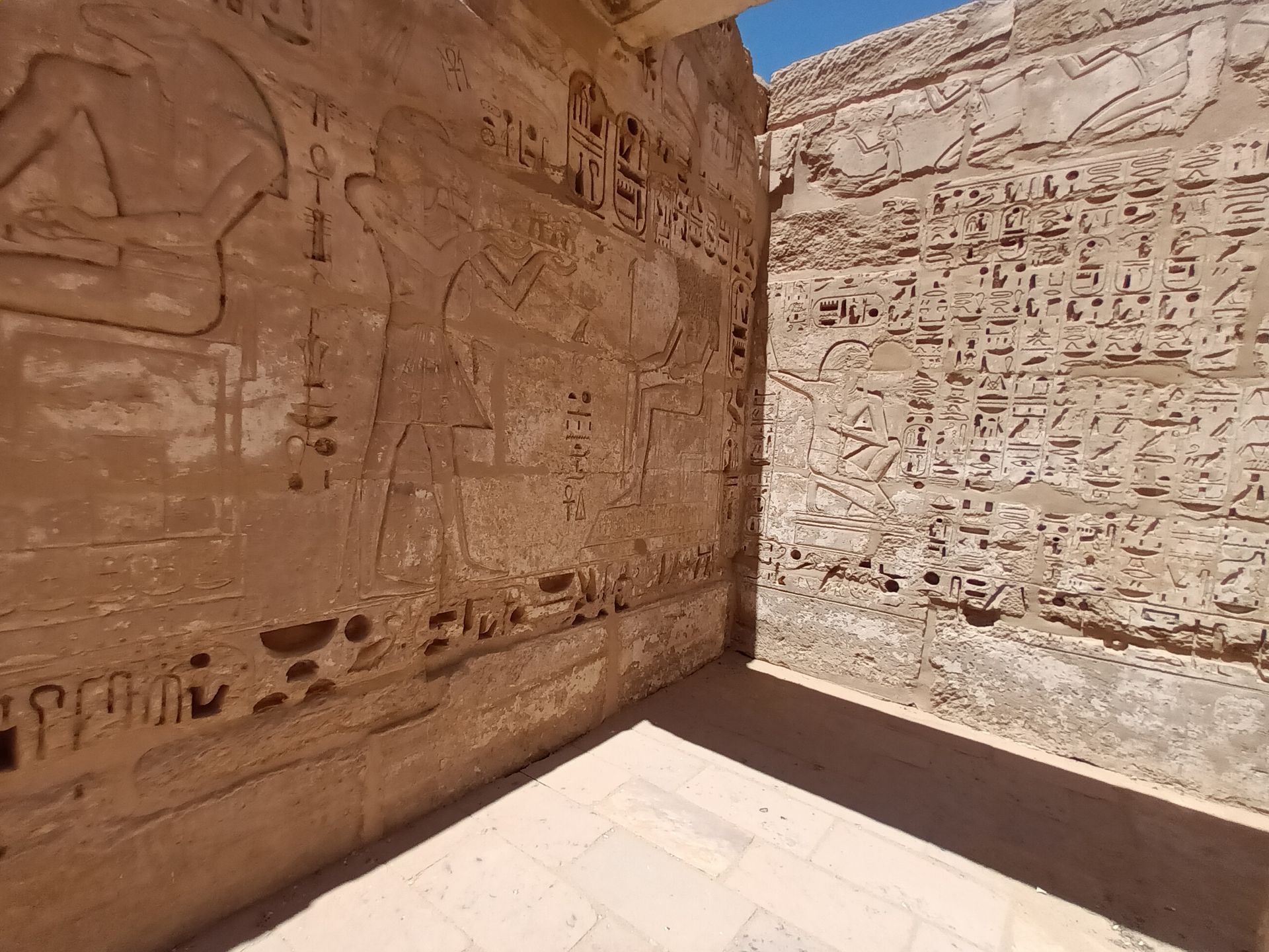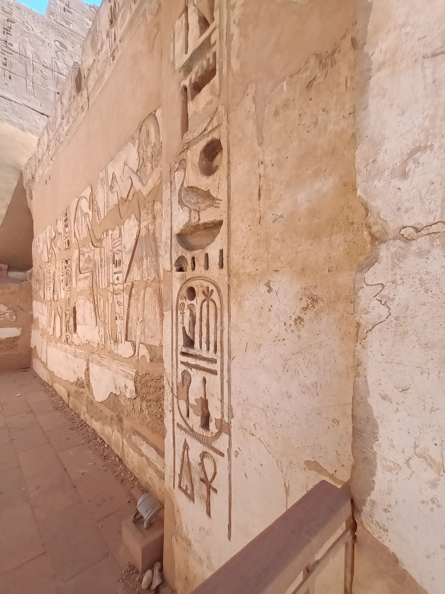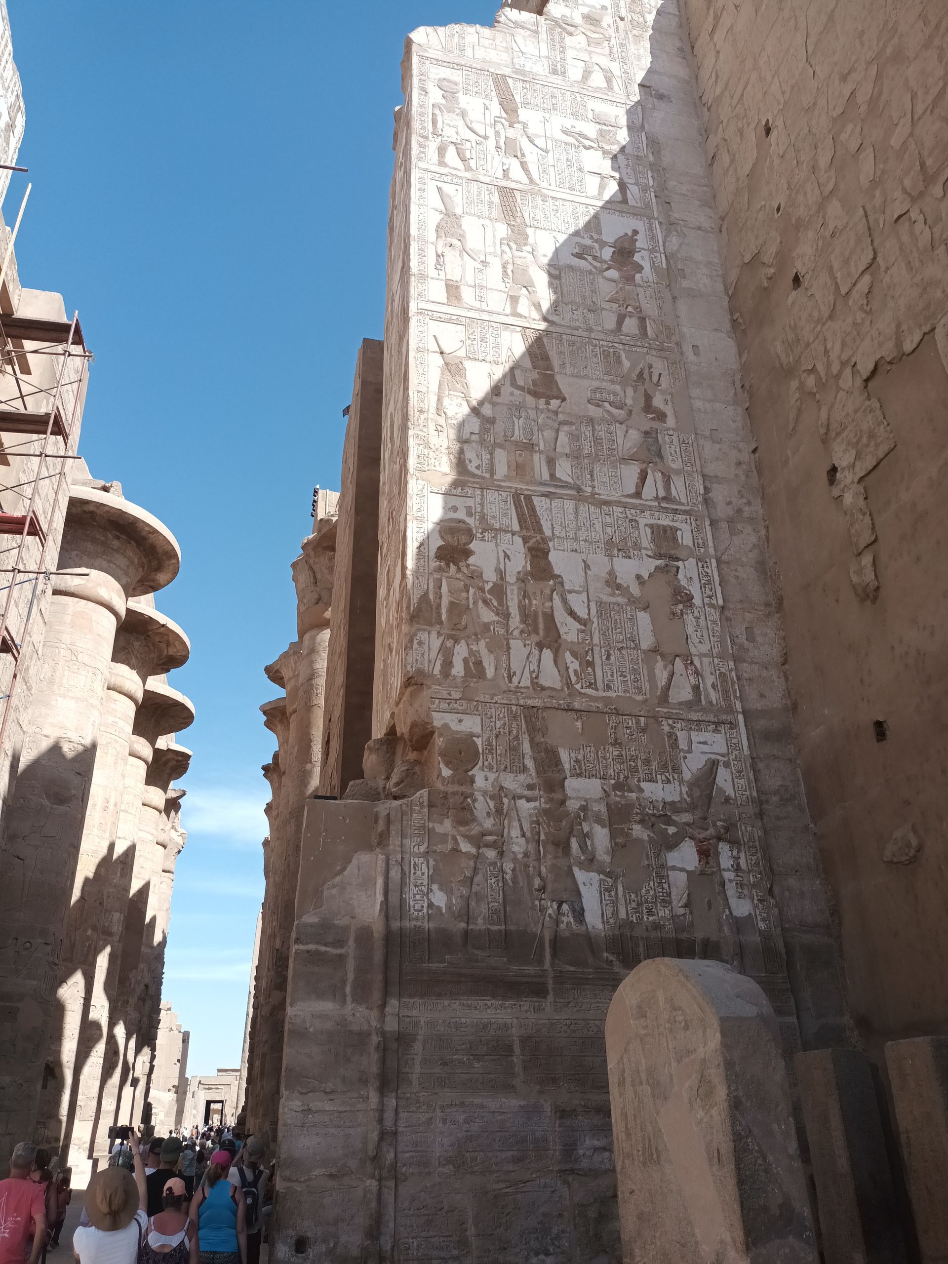 On y trouve aussi des bas-reliefs également à la gloire de Ramsès II (forcément, c'est son temple, fait par lui, pour lui, et même avec lui). Ainsi de la bataille de Qadesh (Syrie, 1274 AEC), que l'animateur anglais Greg Jenner a qualifié, dans le podcast historique BBC You're Dead to Me, de première "fake news" de l'histoire (dans le sens où Ramsès a perdu cette bataille contre les Hittites, mais a convaincu le peuple égyptien qu'il l'avait gagnée triomphalement) (dans la bouche de notre guide, c'est plutôt: il l'a gagnée triomphalement, mais les Syriens prétendent qu'il l'a perdue):