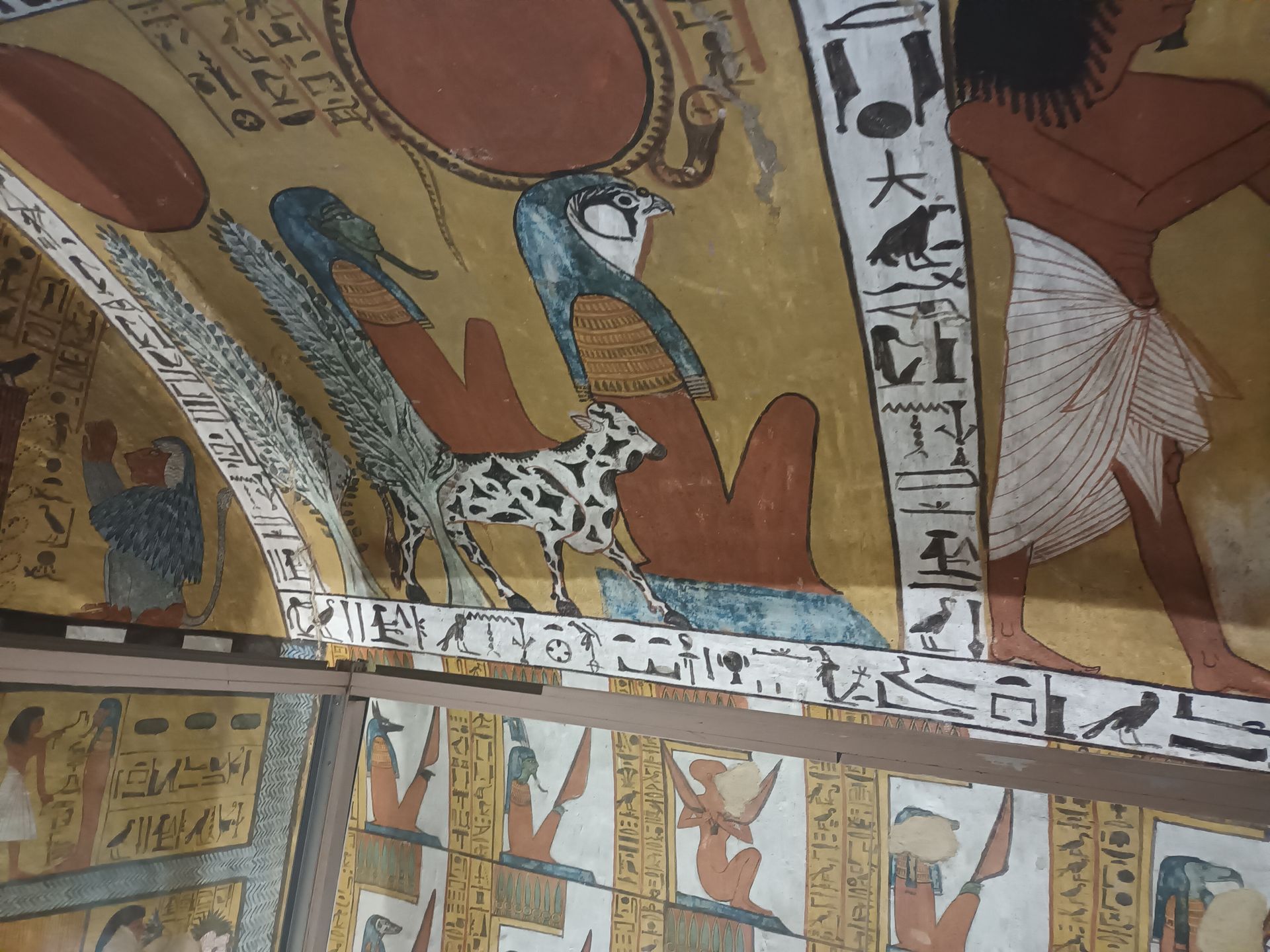 Sur cette statue d'Amenhotep II sous l'égide d'Hathor, déesse nourricière dépeinte, comme souvent, sous forme de vache, les infos données par le musée sont contradictoires. Le site dit qu'elle est en grès peint et a été récupérée au temple funéraire de Thoutmôsis III. L'écriteau dans le musée dit qu'elle est en calcaire peint, et qu'elle a été trouvée au temple funéraire d'Hatchepsout. Bon, certes les deux sont à Deir el-Bahari, mais on sait à quel point ils n'aimeraient pas qu'on les confonde...
