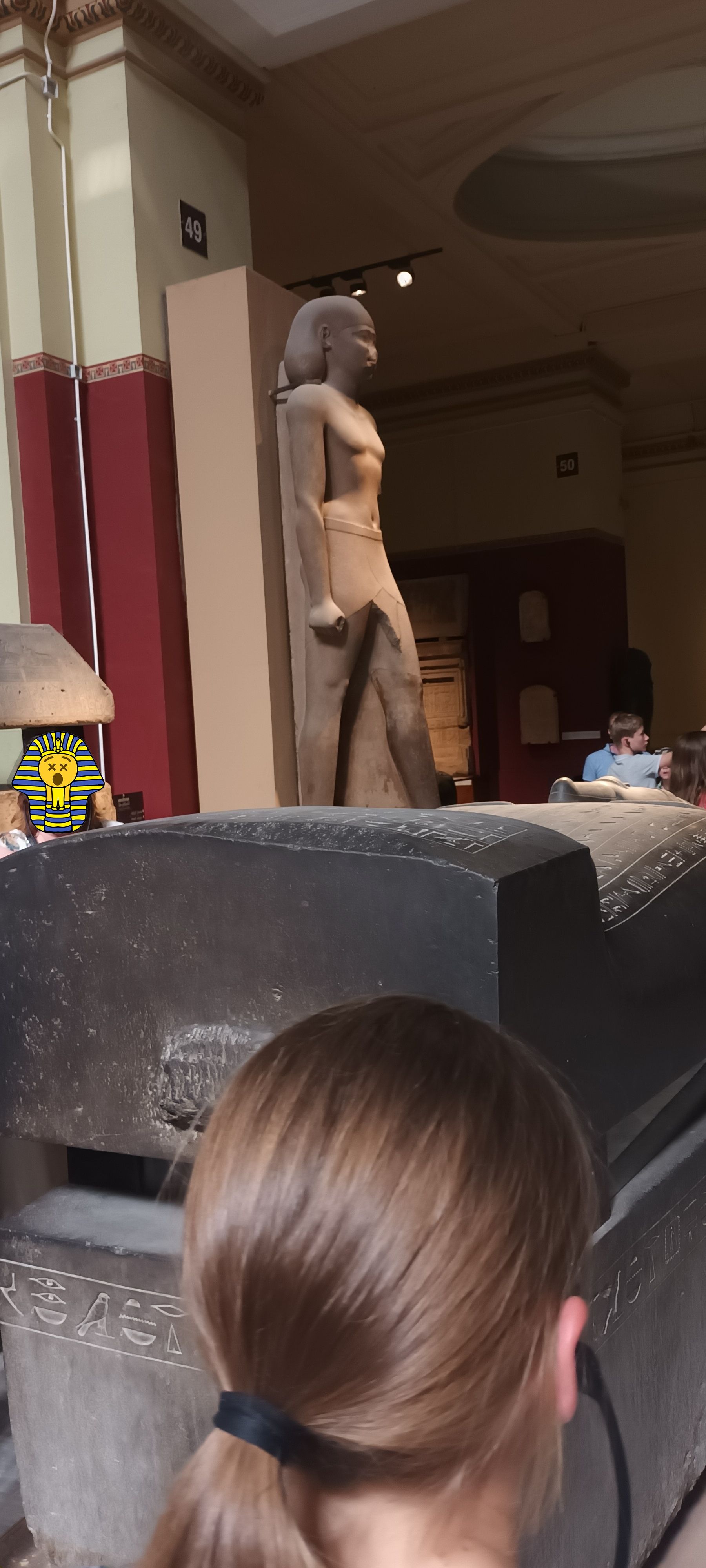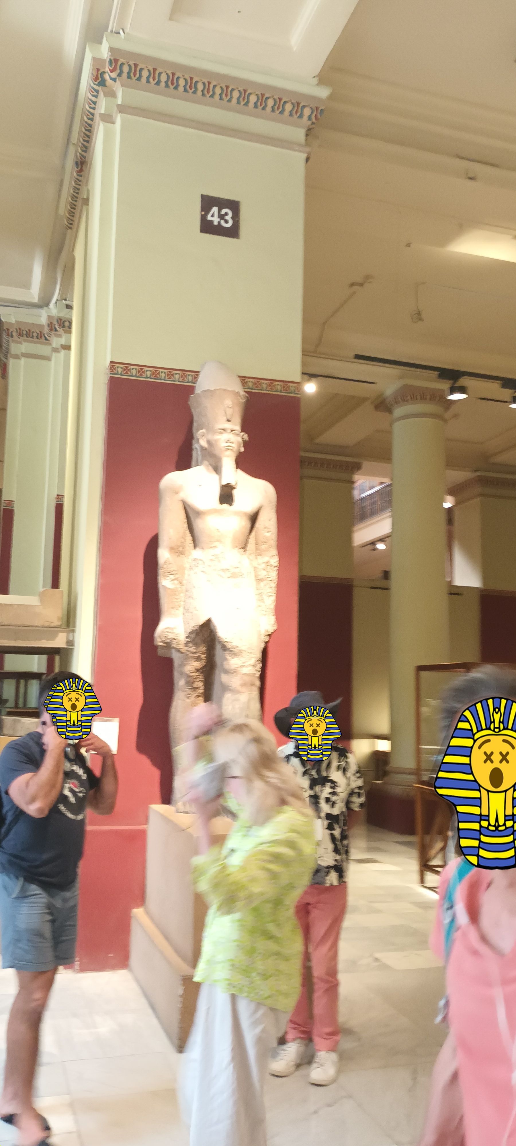 Rassurez-vous: on n'est pas parti sans que des pharaons soient venus (sous forme de statues, dans l'allée entre les tables de restaurant par laquelle on quitte le musée) nous faire coucou. Pas moyen de trouver leur identité, par contre, mais à vue de nez ça a l'air d'être deux fois la même, et je ne serais pas surpris que ce soit Ramsès II. 😉