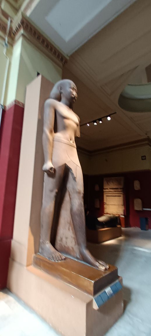 Même chose à droite de ce paragraphe: maintes statues exposées ensemble, dont une seule que j'ai pu identifier grâce à l'aide du web et des webnautes — à savoir le personnage assis exactement au milieu, en haut. Il s'agit de Ptahchepsès, le gendre et vizir du pharaon Niouserrê (de la Vème dynastie), qui a réussi à s'accaparer de nombreuses fonctions importantes: juge suprême, dirigeant une administration qui contrôlait le pays. L'écriteau du musée précise aussi qu'il était "prophète d'Hathor et de Rê". Bref, un sacré cumulard — à se demander si Ramsès II ne s'est pas un peu inspiré de lui, bien plus tard, pour ses ambitions d'omnipotence temporelle et cosmique.