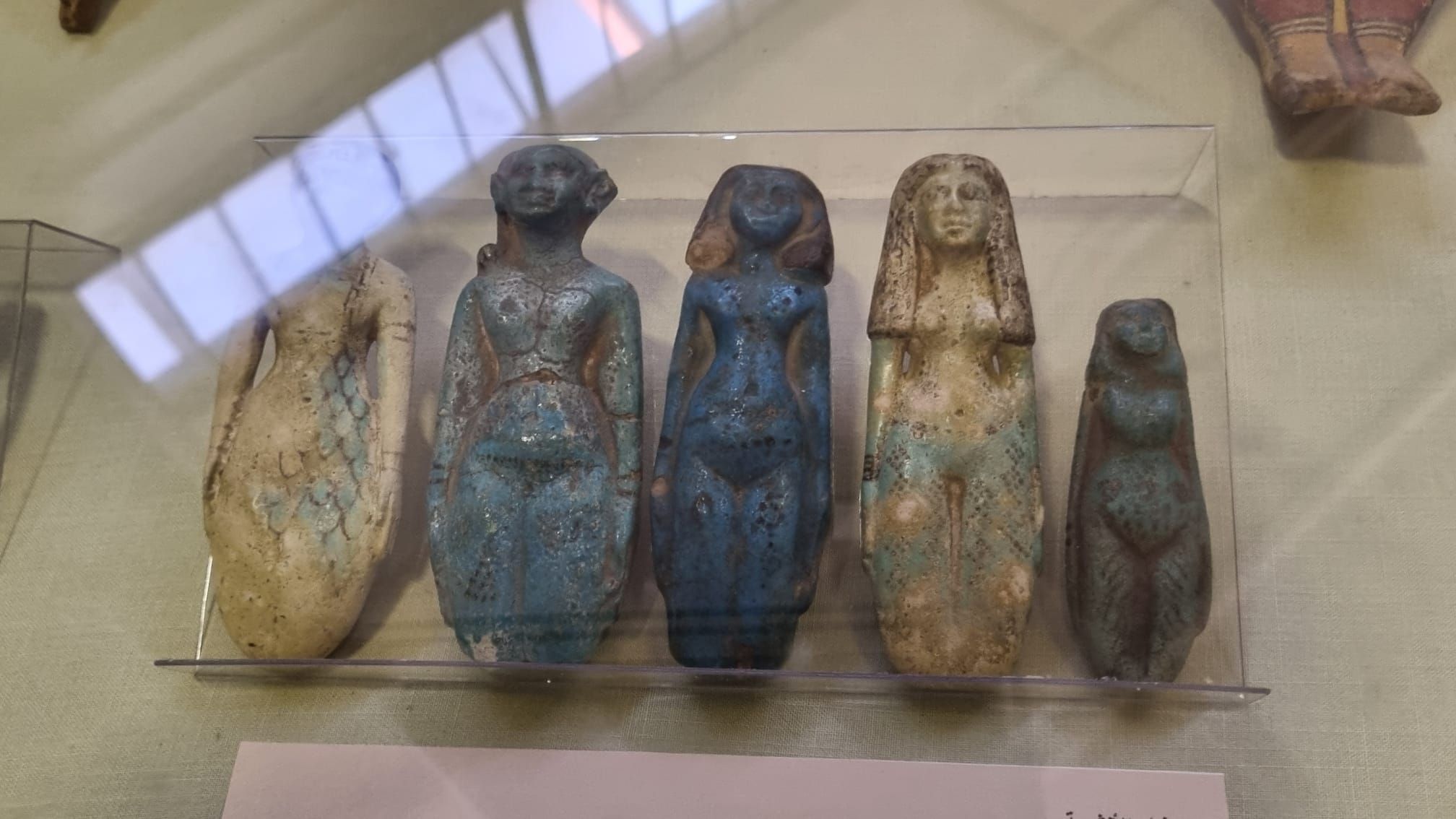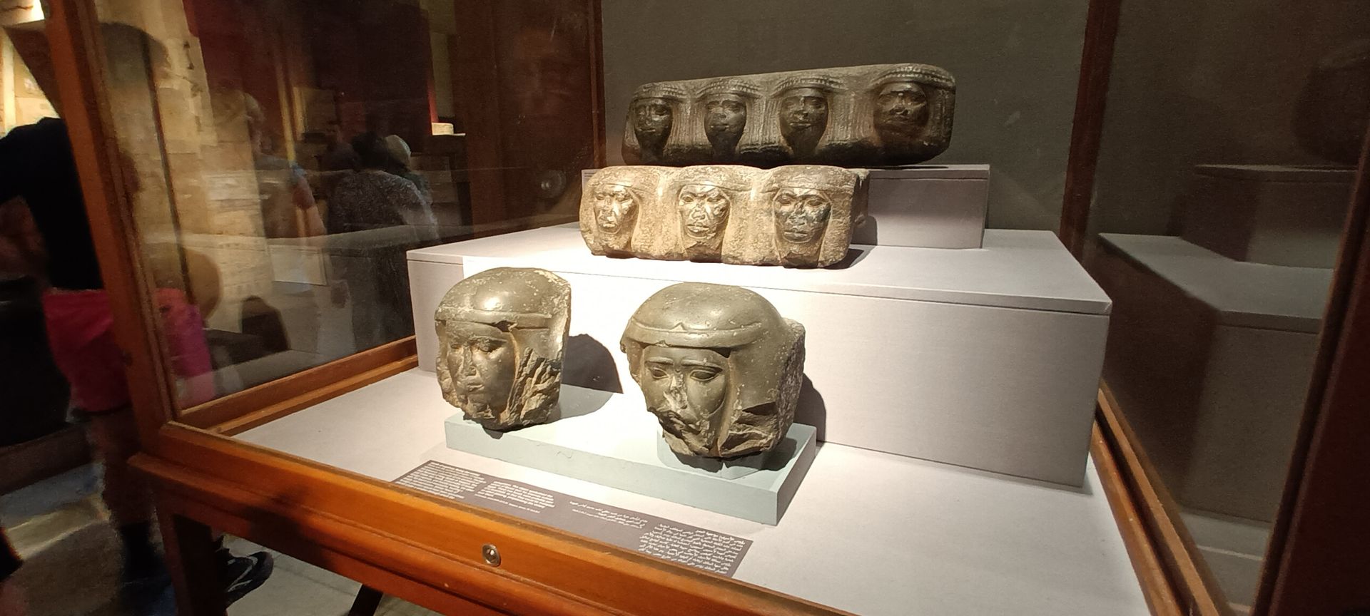Au moins une des petites têtes ci-dessous est celle, en quartzite, d'une fille d'Akhenaton, dont le musée ne donne pas le nom mais qui a été trouvée à Amarna. Comme l'autre tête et la statue complète sont sculptées dans un style similaire, on peut supposer que les trois pièces viennent d'Amarna (puisque le style développé par les artisans d'Akhetaton est connu pour être singulier, par rapport au reste de l'art égyptien antique).