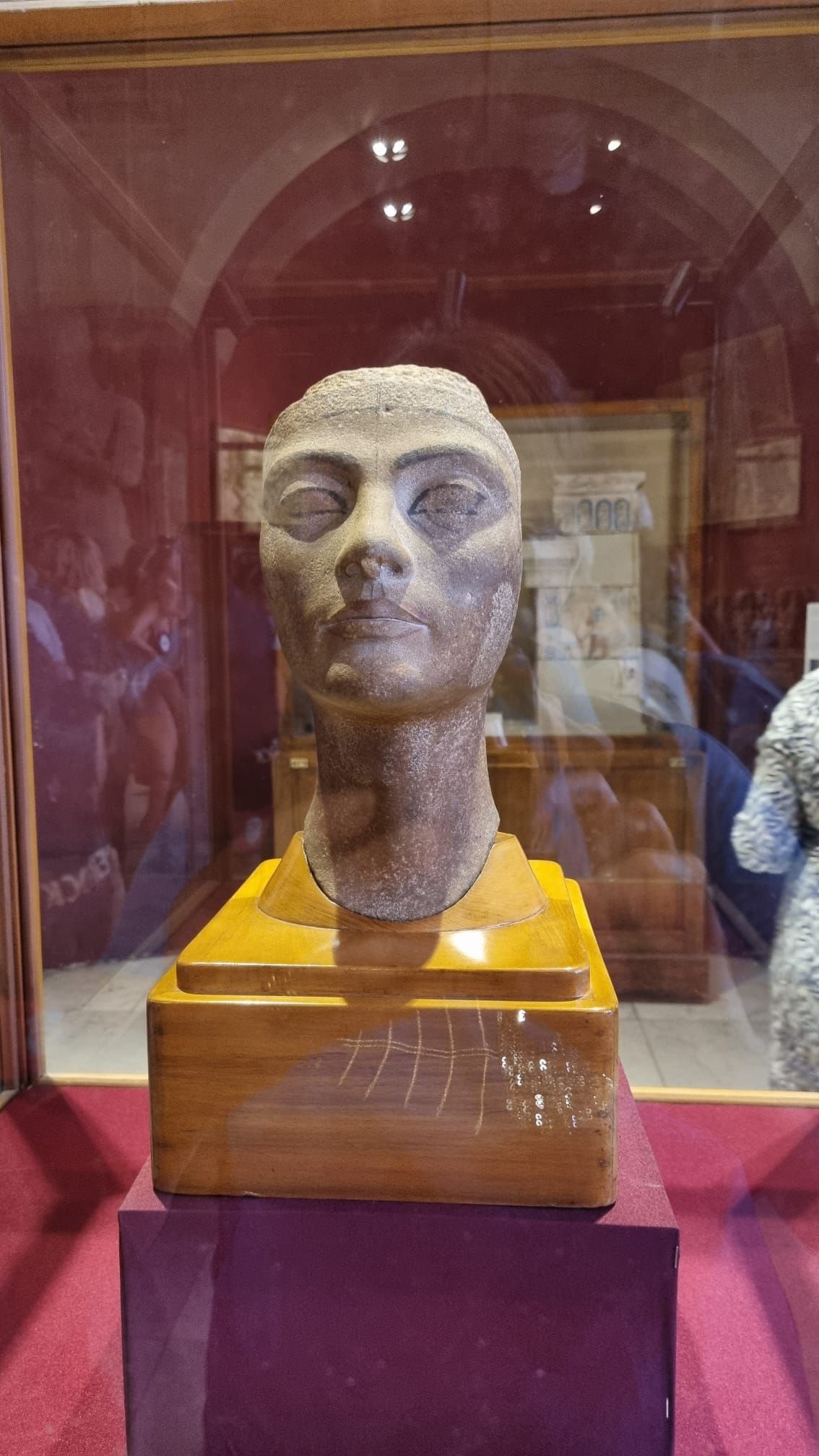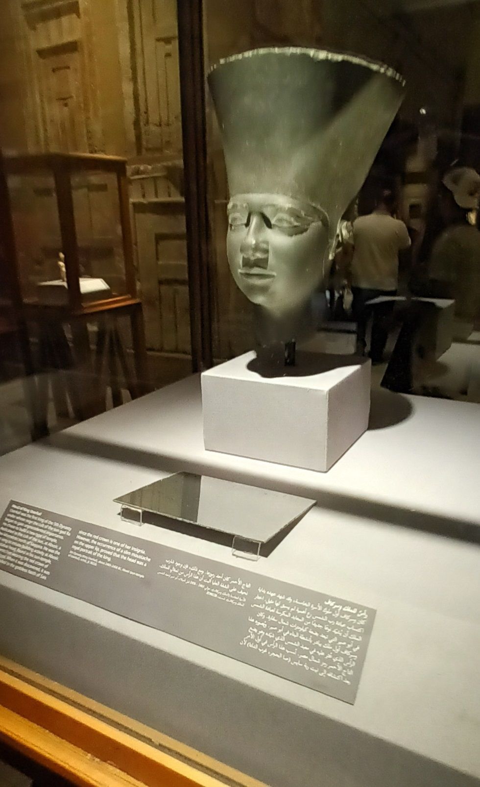 Enfin, dans la famille d'Akhenaton, il y a aussi, bien sûr, son épouse royale bien connue, Néfertiti, dont le musée renferme notamment une tête inachevée, en quartzite brun, qui a été trouvée à Amarna, et qui est potentiellement l'œuvre du sculpteur officiel d'Akhenaton, Thoutmôsis (qui est aussi l'auteur du célèbre buste similaire mais bien fini exposé à Berlin).
