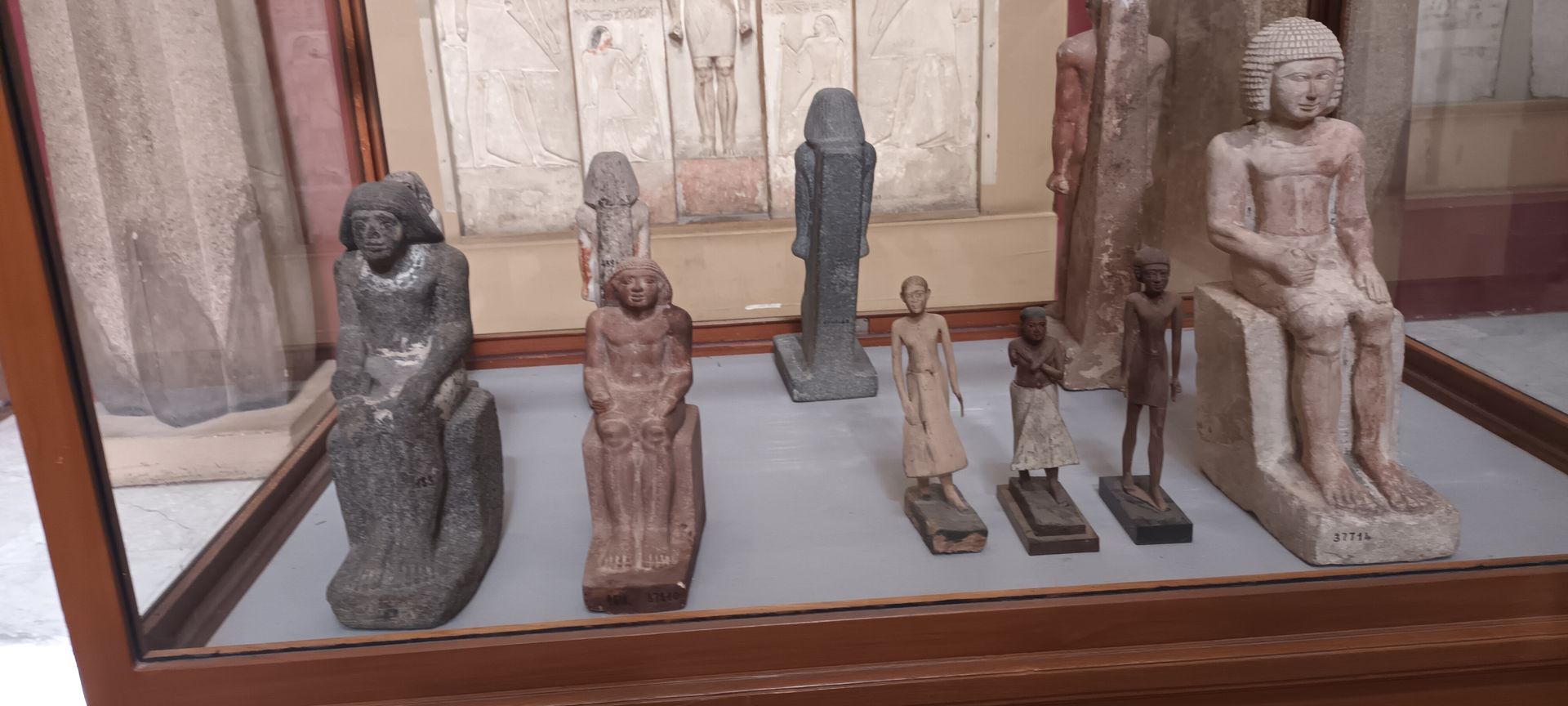 Encore des statues de personnes de petite taille, dont le dénommé Perniankhou (en haut à gauche, en basalte peint, découvert dans sa tombe à Gizeh, puis le prêtre Knumhotep, en haut au centre, puis, dans la deuxième photographie, le prêtre Seneb entouré de sa famille (il fut prêtre funéraire de Khéops et de son fils Djédefrê, les statues sont en calcaire peint, et elles ont été trouvées dans le mastaba de Seneb, à Gizeh). Pas la moindre idée de l'identité des deux personnages à la droite de Perniankhou et Knumhotep.