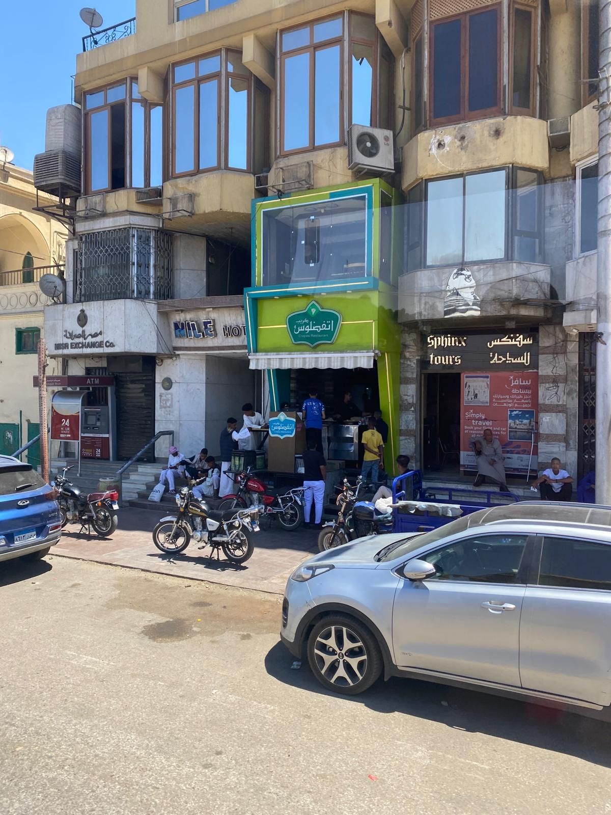 ... non sans s'arrêter au préalable dans deux magasins d'Assouan, où on nous a fait l'article (l'un vendait des huiles essentielles, l'autre des épices), et ça me donne l'occasion de montrer quelques aperçus des rues d'Assouan, vues du bus (dont la façade du magasin d'épices, et les quais remplis de marchands où on avait pris le bateau le matin):