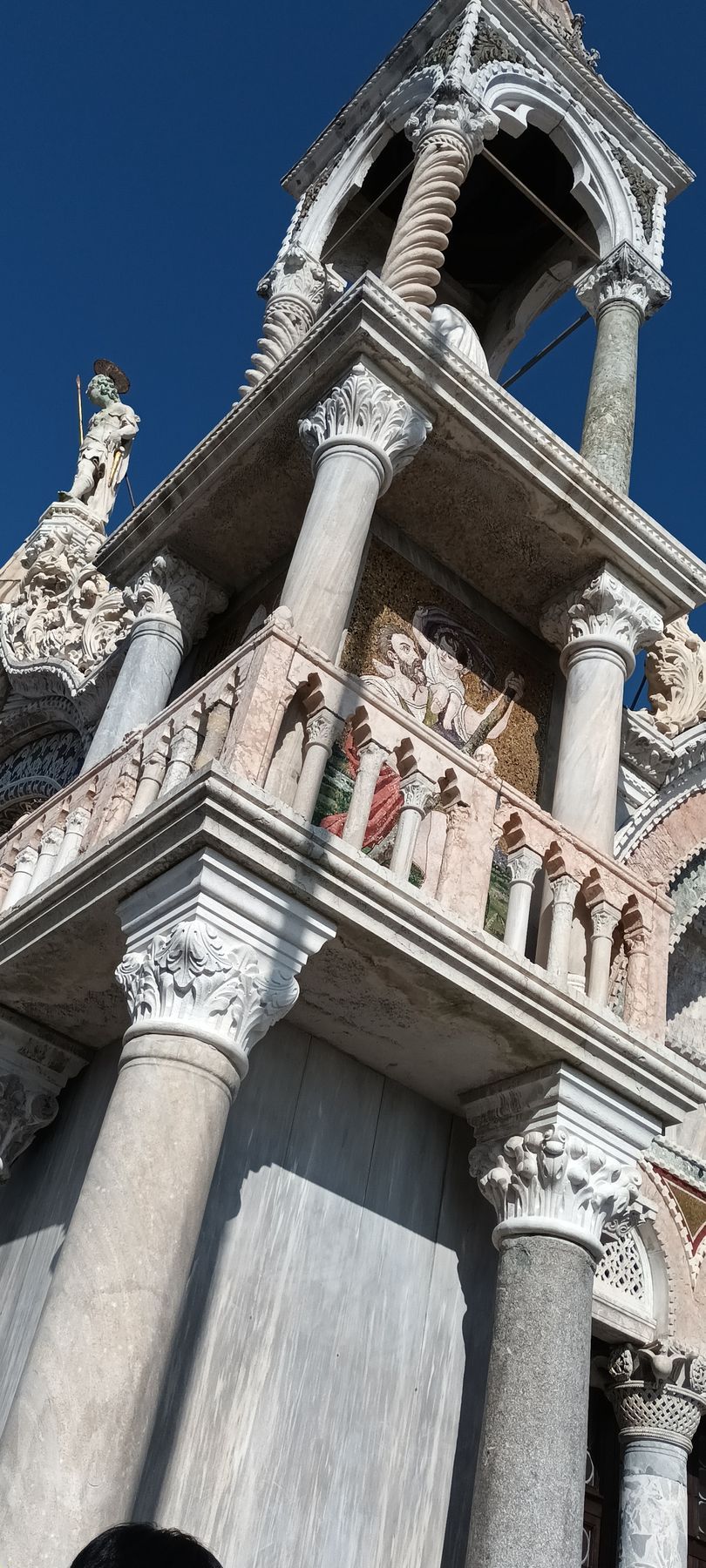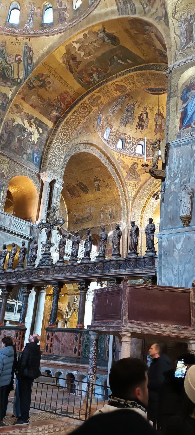 After downloading the app giving access to the audioguide, we begin to explore on our own Saint Mark's Basilica, which was initially built in 828, in a style inspired by the oriental forms of the buildings of the Byzantine Empire, to host relics of Saint Mark the Evangelist, stolen from Alexandria by Venetian merchants. (however the current church was actually rebuilt after a revolt led to the burning of the Doge's Palace (and the original basilica with it) in 976).