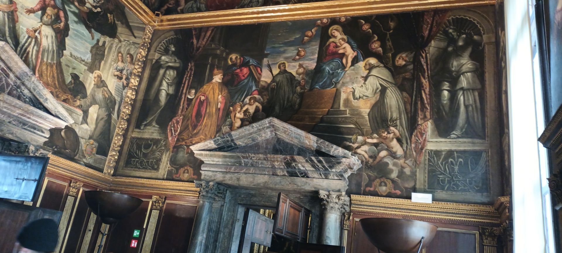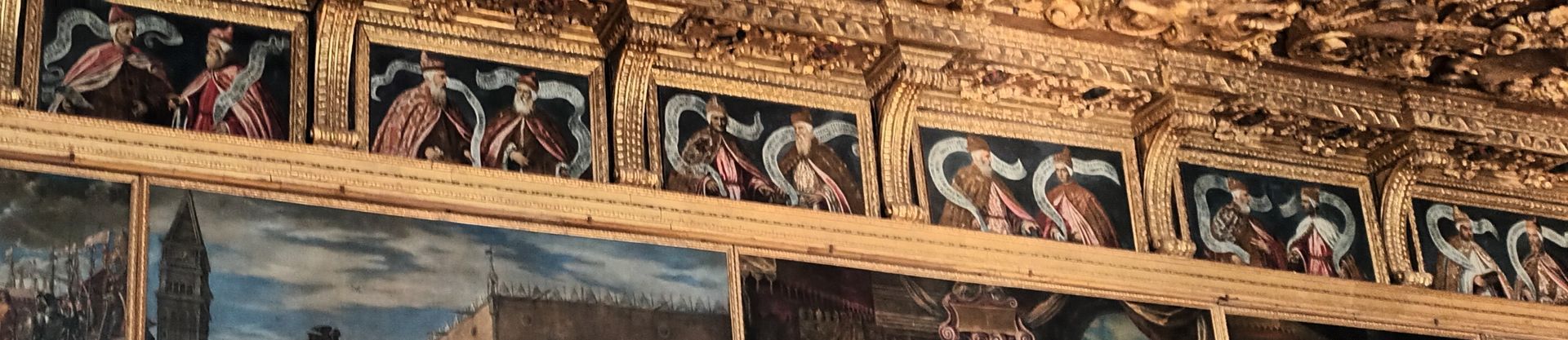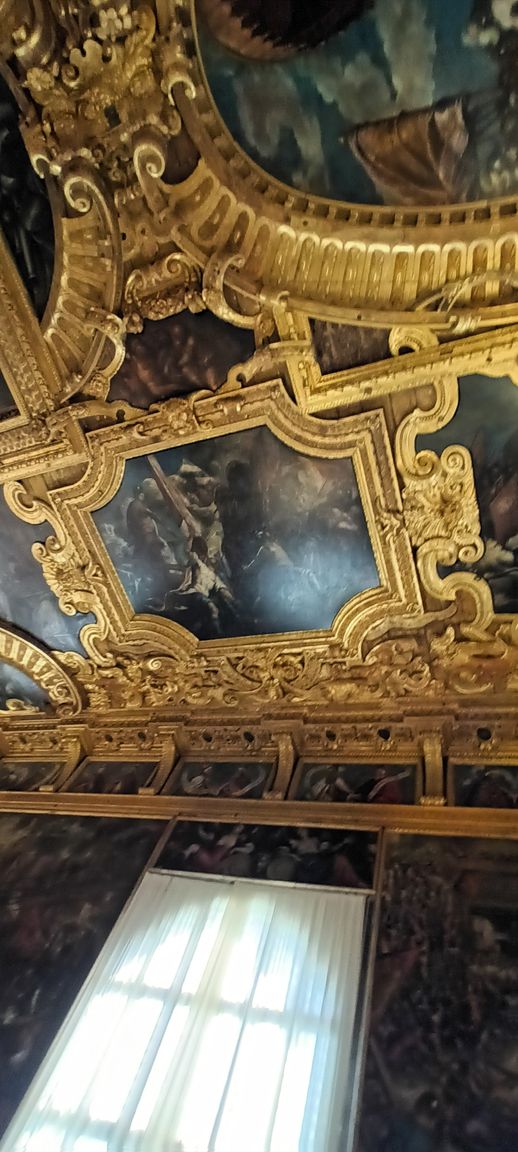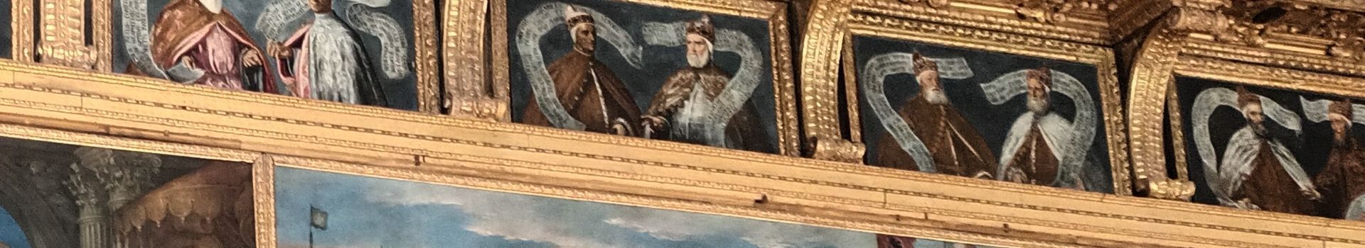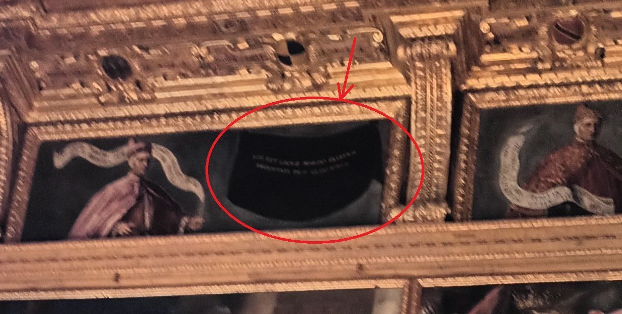 Note the small portraits of all the doges in the history of the Republic, lined up all around the room, above the more monumental paintings — except one, whose portrait has been covered with a painted black sheet (circled in red in the details below): Doge Marino Faliero, in a way the Donald Trump of the Republic of Venice, in that he failed to overthrow the Republic and replace it with his personal autocracy — but, unlike Trump, when the Republic foiled his coup plan, it did not give him on a platter the opportunity to do it again: Faliero was beheaded; and, in the manner of Herostratus (or even Hatshepsut or Akhenaten), the regime also made sure to "erase" him from history, the most famous example of this punishment being the concealment, by painting a black sheet over it, of his portrait in the Great Council Chamber.