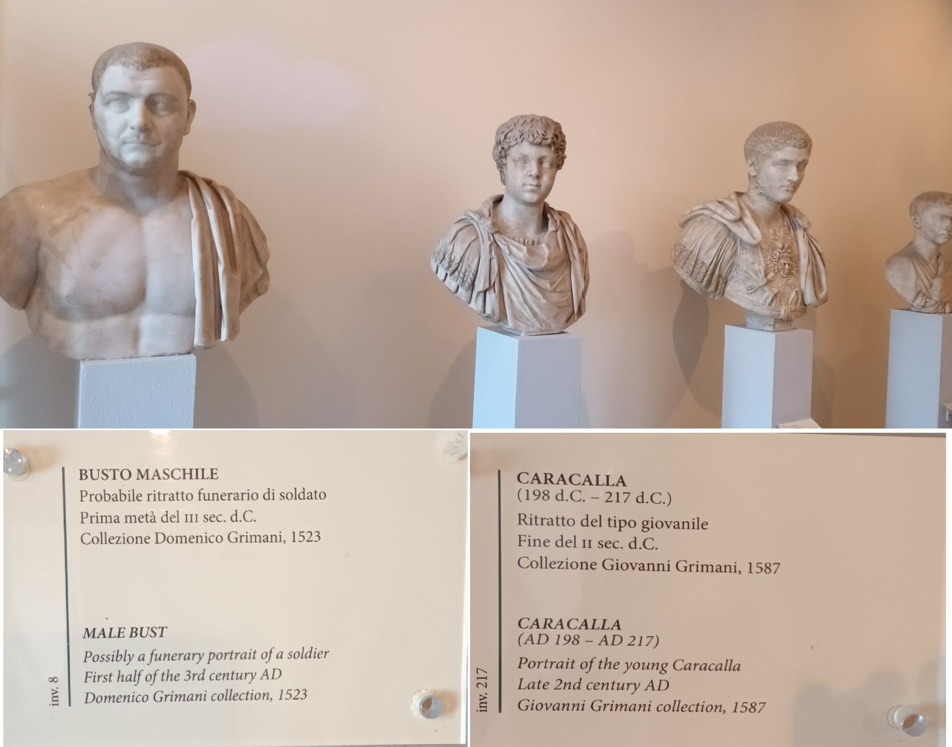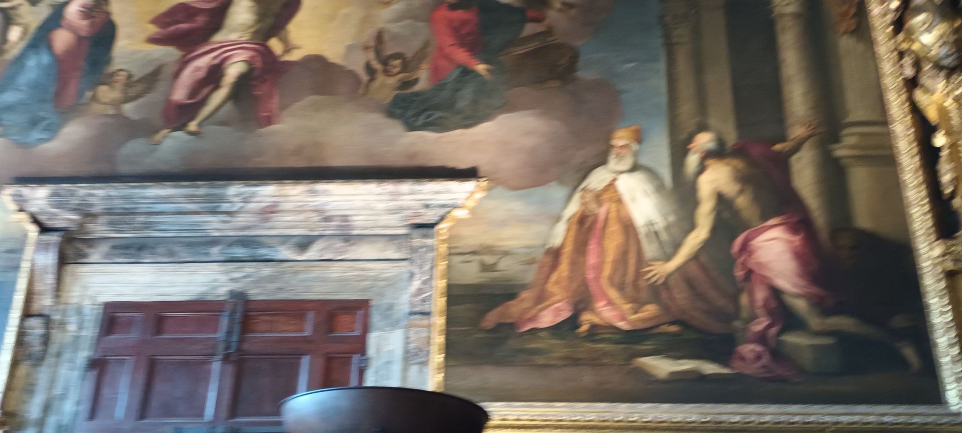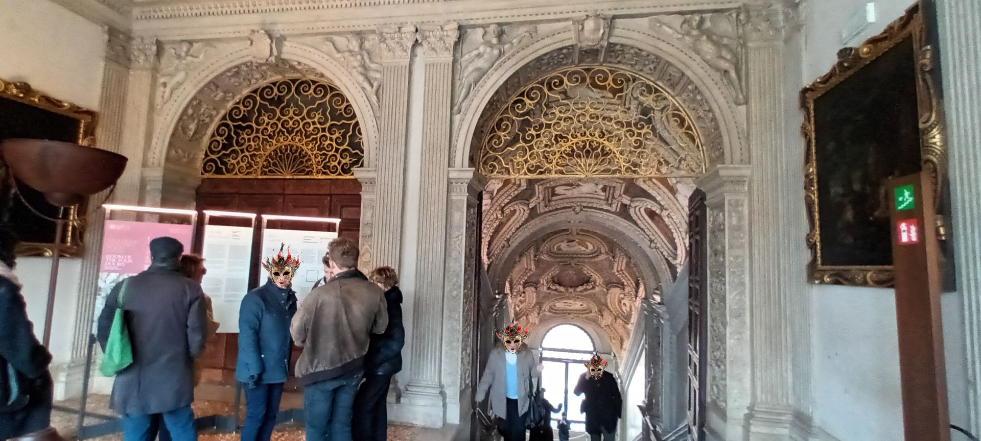 Note the small portraits of all the doges in the history of the Republic, lined up all around the room, above the more monumental paintings — except one, whose portrait has been covered with a painted black sheet (circled in red in the details below): Doge Marino Faliero, in a way the Donald Trump of the Republic of Venice, in that he failed to overthrow the Republic and replace it with his personal autocracy — but, unlike Trump, when the Republic foiled his coup plan, it did not give him on a platter the opportunity to do it again: Faliero was beheaded; and, in the manner of Herostratus (or even Hatshepsut or Akhenaten), the regime also made sure to "erase" him from history, the most famous example of this punishment being the concealment, by painting a black sheet over it, of his portrait in the Great Council Chamber.