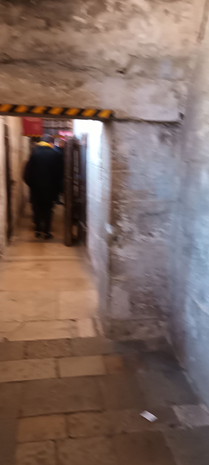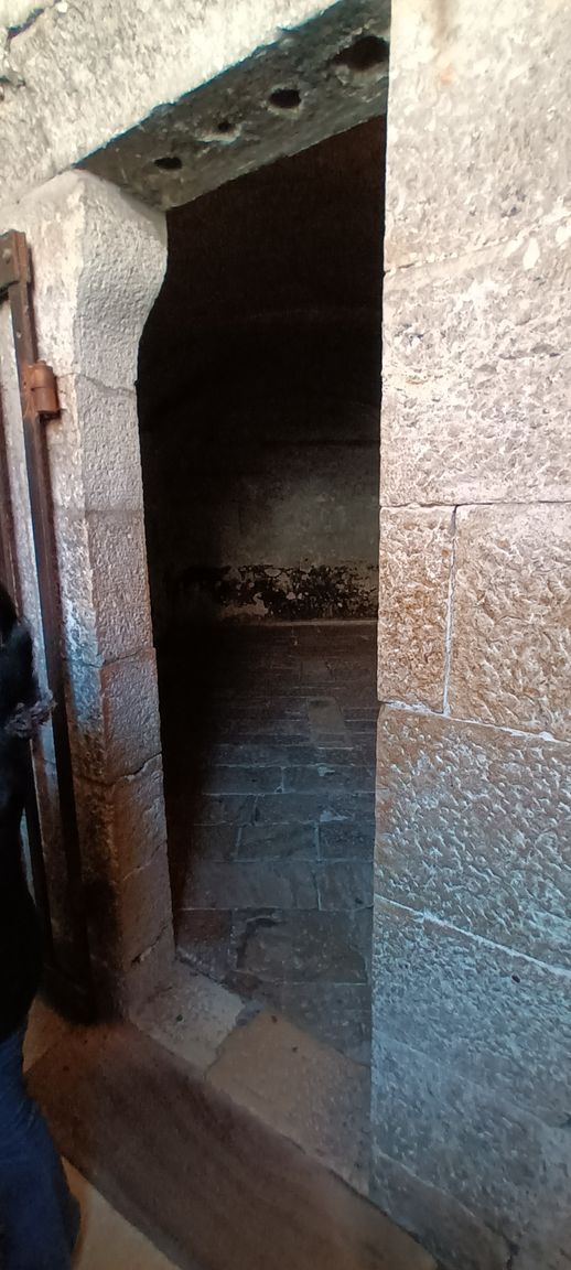 ... before going down the sinister staircase that leads to the even more sinister prisons of the Doge's Palace — but contrary to what I thought, we were not at all shown the Piombi, the initial prison, which was the scene of terrible tortures, and from which Casanova was the only one or one of the few to escape, and which is located directly on the ground floor of the palace (there is no basement: the building, like everything else in Venice, is built directly on the water, on stilts). Instead, we went inside the Bridge of Sighs to visit the New Prisons, built at the end of the 16th century and located on the other side of the Rio di Palazzo. (As a reminder, the Bridge of Sighs that connects the Piombi to the New Prisons, named so after the sighs of despair of soon-to-be prisoners who, when they saw the bridge, knew that it was their last minutes of freedom, and while, inside, it looks like this:)