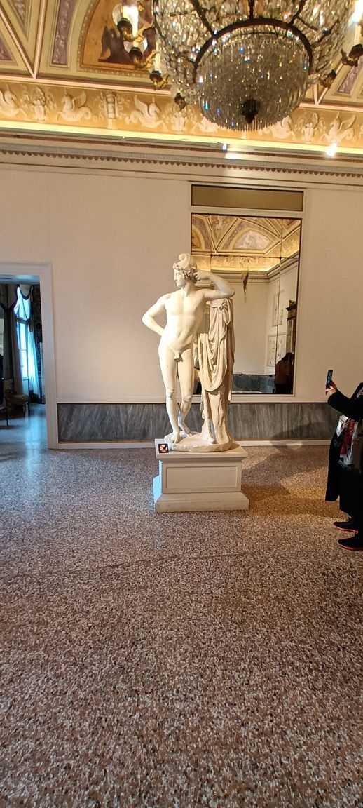 In keeping with these Greco-Latin mythological themes, the next room (decorated in the Empire style by the Venetian painter Giuseppe Borsato (1771-1849)) serves primarily as a setting for one of Canova's first famous works: a statue representing that damn lil' rascal Icarus and his father Daedalus in the process of making him put on the fateful wings: