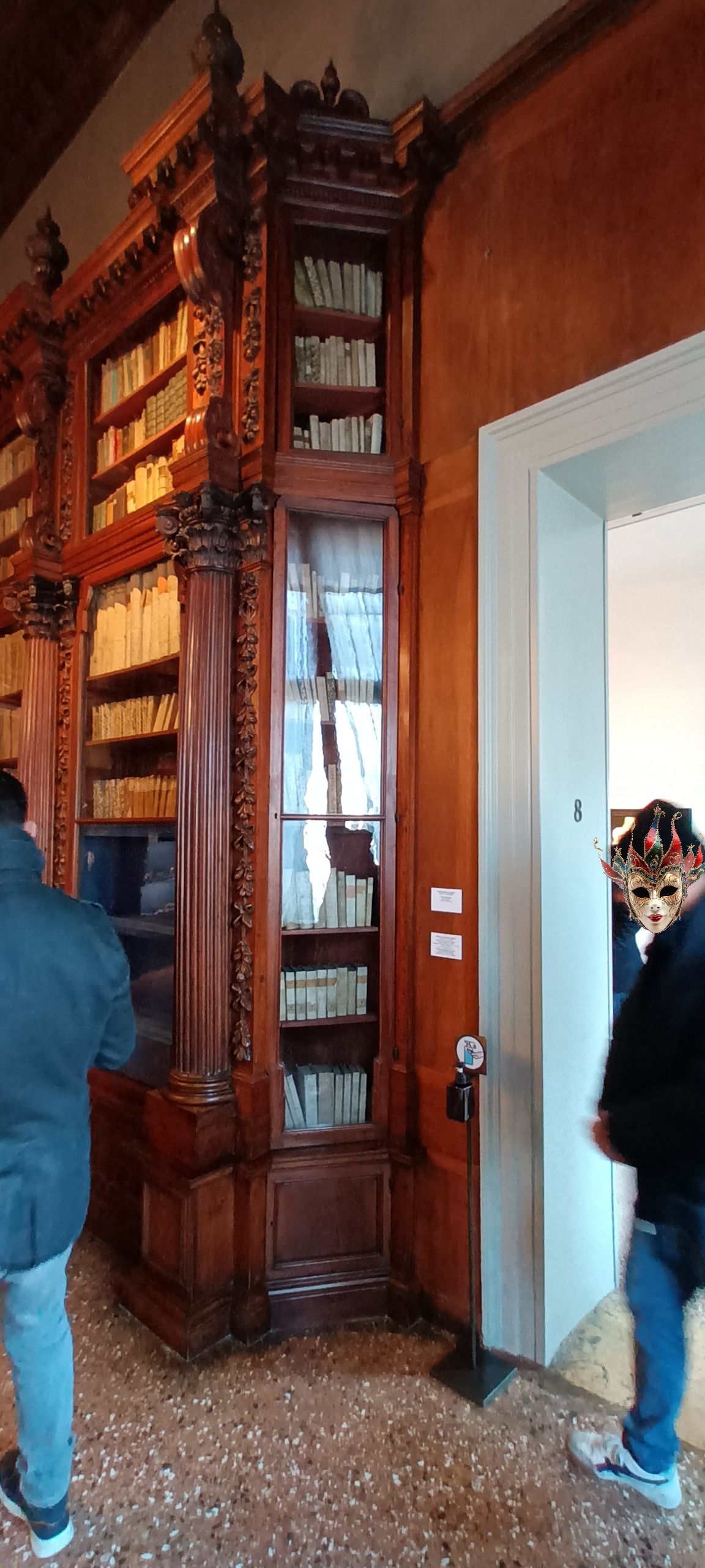 We continue with the embodiment of bliss: a library. More precisely: imposing walnut shelves dating from the 17th century, which surround the next room after being imported from the palace of the Venetian Pisani family, containing all sorts of old books that celebrate, through their exhibition, the history of the early Venetian printing industry. In the middle, two beautiful world maps, of which I mischievously wonder if they are hollow and hide aperitifs like the one my parents had in my early youth. On the ceiling, a beautiful Murano glass chandelier (see the next day's entry, for more on Murano).