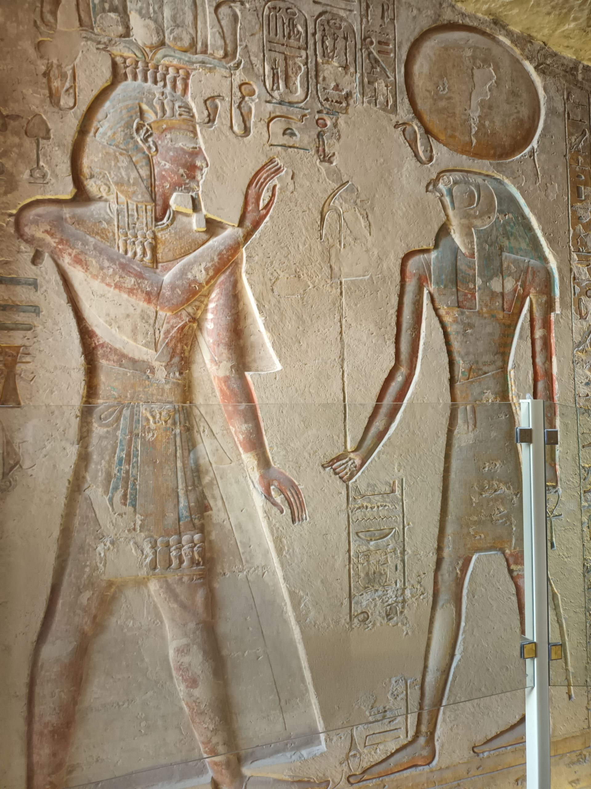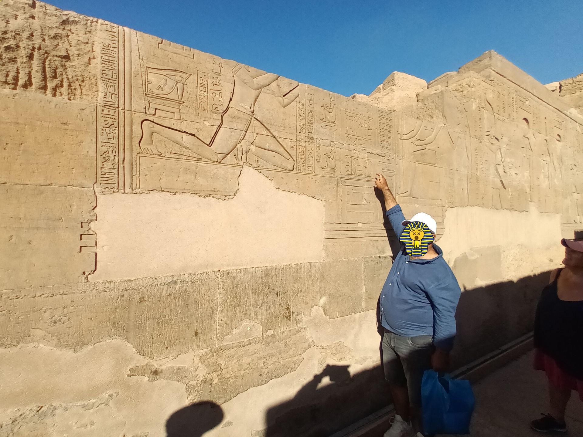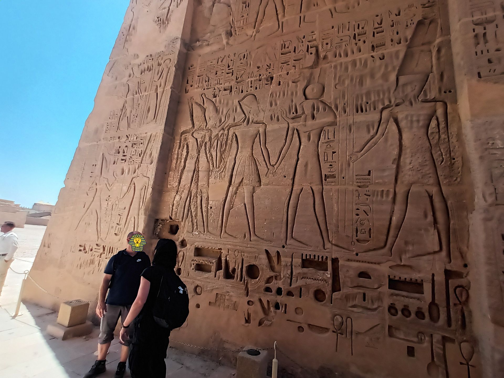 On y trouve aussi des bas-reliefs également à la gloire de Ramsès II (forcément, c'est son temple, fait par lui, pour lui, et même avec lui). Ainsi de la bataille de Qadesh (Syrie, 1274 AEC), que l'animateur anglais Greg Jenner a qualifié, dans le podcast historique BBC You're Dead to Me, de première "fake news" de l'histoire (dans le sens où Ramsès a perdu cette bataille contre les Hittites, mais a convaincu le peuple égyptien qu'il l'avait gagnée triomphalement) (dans la bouche de notre guide, c'est plutôt: il l'a gagnée triomphalement, mais les Syriens prétendent qu'il l'a perdue):