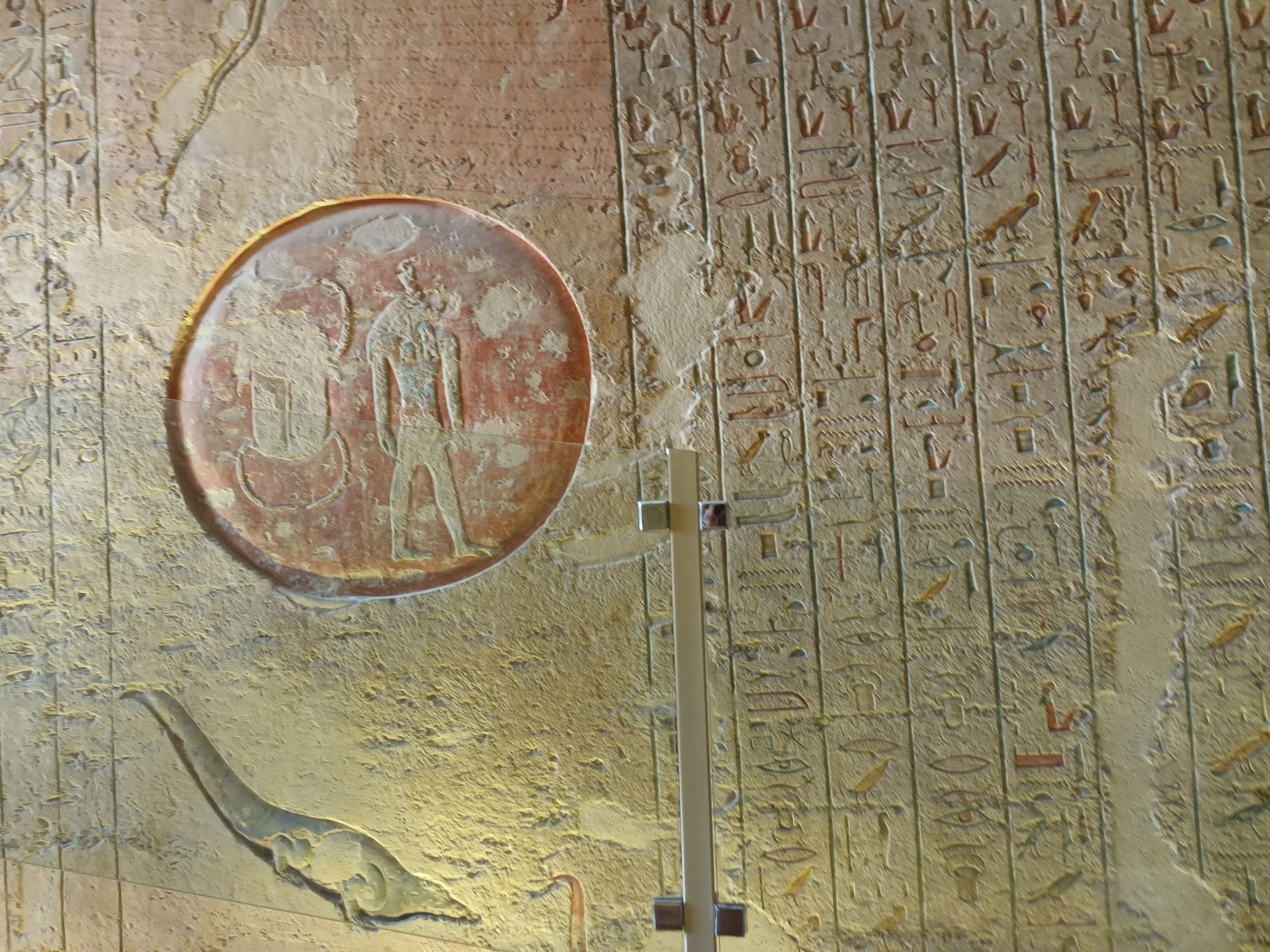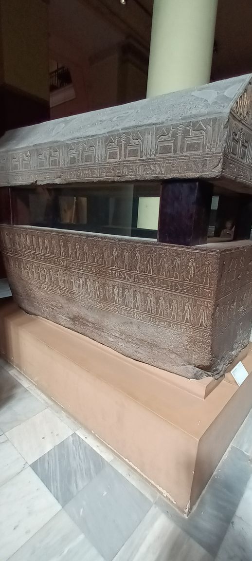 Ensuite, on a vu le sarcophage d'Akhenaton — ou dont il a en tout cas été décidé qu'il était vraisemblablement celui d'Akhenaton, car il ne porte aucun cartouche et la tombe où il a été trouvé à la Vallée des Rois ne portait nulle mention de l'identité du défunt. L'hypothèse qui fait consensus est que c'est un sarcophage initialement fabriqué pour Kiya, une épouse "secondaire" d'Akhenaton, mais après la fin du règne de ce dernier dans sa capitale dédiée à Aton (Akhetaton, sur le site de l'actuelle Amarna), et pendant le règne de son fils Toutânkhamon, le fiston devenu pharaon (alors qu'encore gamin) a fait improviser une sépulture au papounet en disgrâce (pour son "hérésie") et l'a fait rapatrier à Thèbes sans grande pompe, et le sarcophage aura été recyclé dans le feu de l'action).