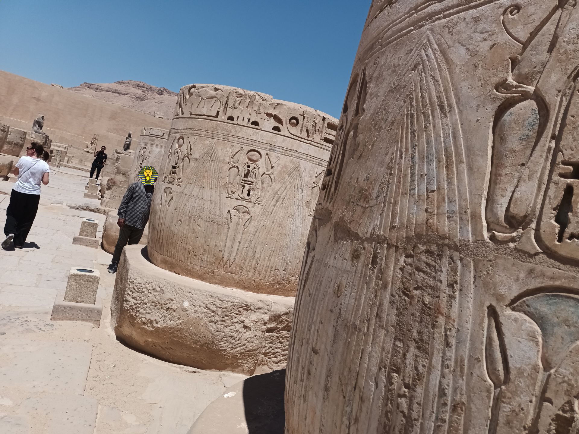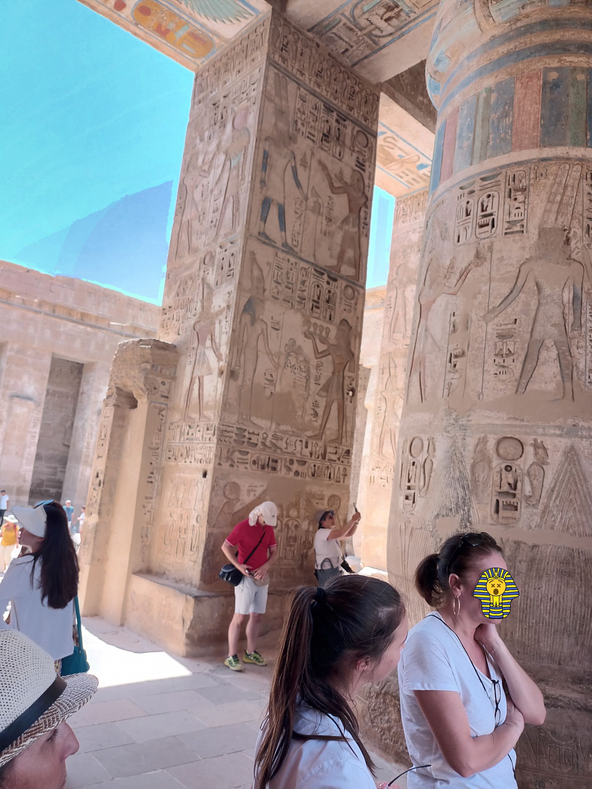 Du coup, puisque le prestigieux dieu pharaon Horus est de la partie, pour le couronnement, on imagine bien que nombre de colonnes de la salle hypostyle lui sont consacrées, mais il y en a aussi un certain nombre qui figurent l'épouse d'Horus, la déesse Hathor — ainsi, comme le système symbolique du temple suggère qu'Horus parraine directement Ramsès, la même chose est suggérée concernant Hathor et l'épouse de Ramsès, Nefertari: