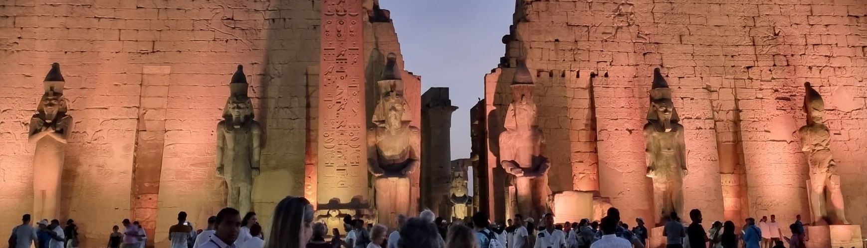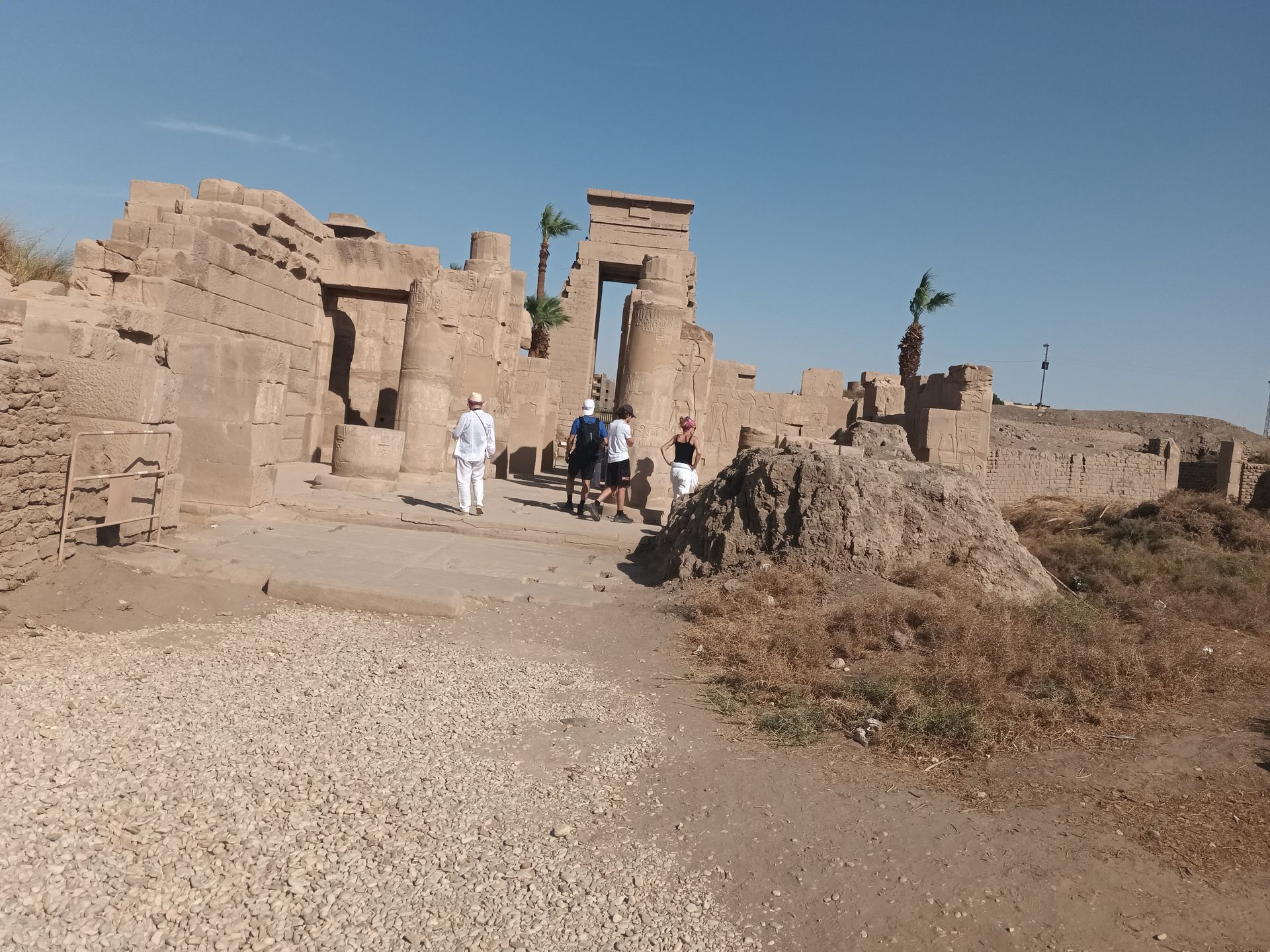 À l'entrée du Temple d'Horus à Edfou, en tenue de supporter d'Horus dans son match retour victorieux contre Set.