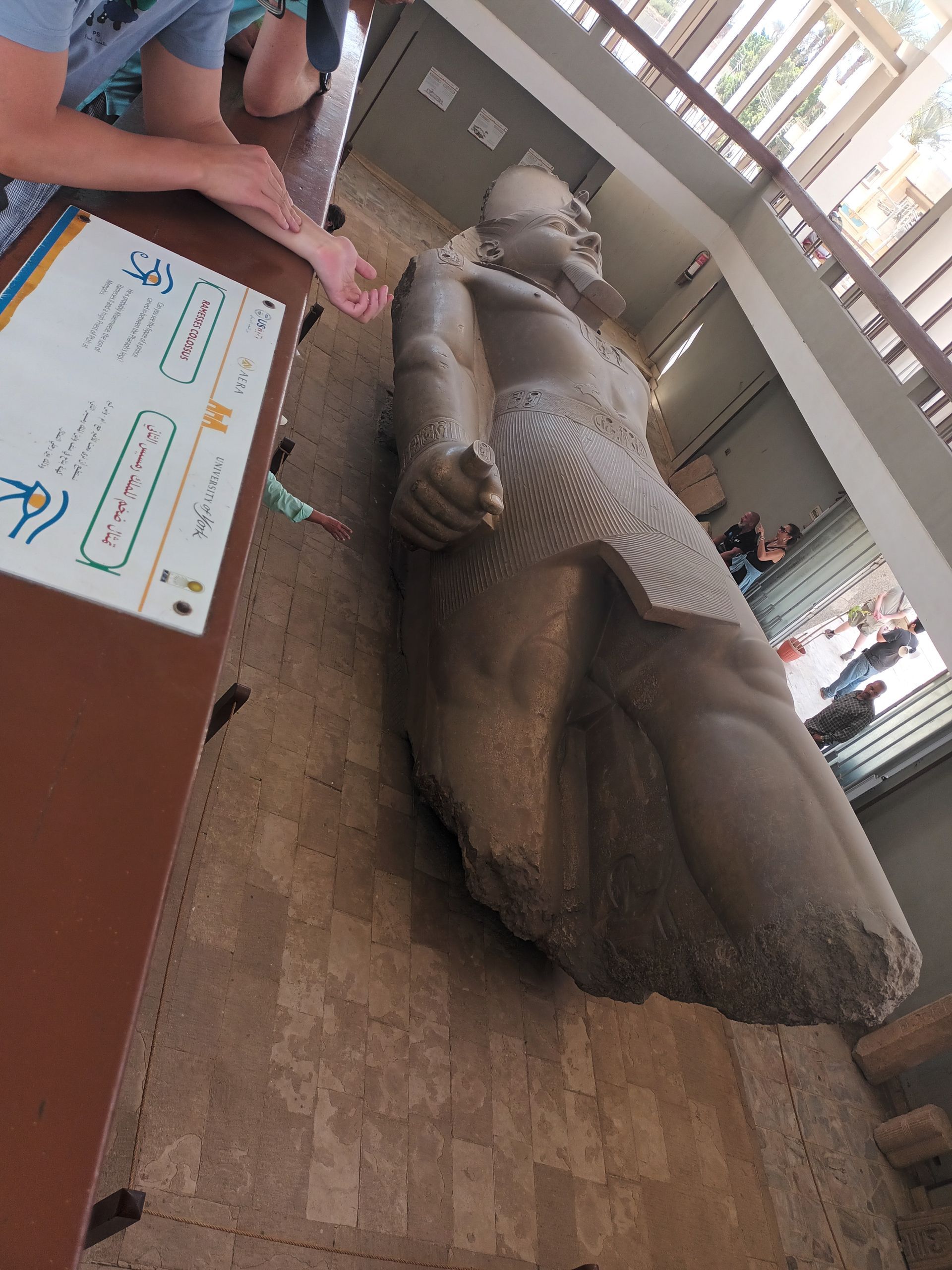 Rassurez-vous: on n'est pas parti sans que des pharaons soient venus (sous forme de statues, dans l'allée entre les tables de restaurant par laquelle on quitte le musée) nous faire coucou. Pas moyen de trouver leur identité, par contre, mais à vue de nez ça a l'air d'être deux fois la même, et je ne serais pas surpris que ce soit Ramsès II. 😉