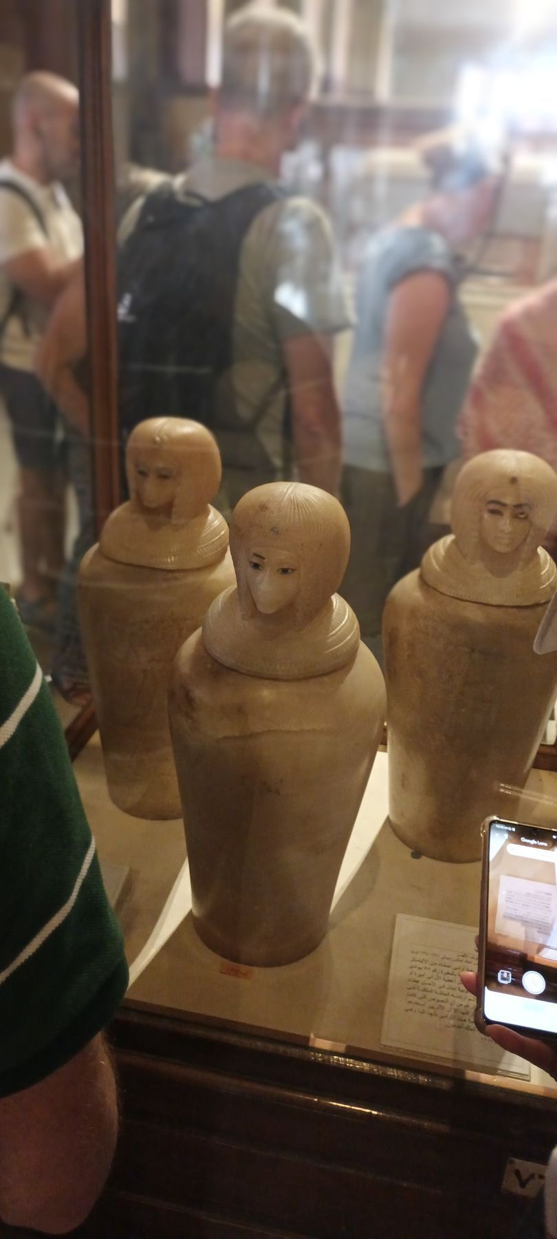 Les photos ci-dessous montrent les vases canopes et le coffre canope de Touya, la mère de Tiyi. Le coffre est en bois noirci à la poix, avec les figures dorées d'Isis et Nephthys sur deux faces, celles d'autres déesses, Neith et Serket, sur les deux autres. Les vases sont en calcite. L'ensemble a bien sûr été trouvé dans la tombe de Touya et Youya, à la Vallée des Rois.