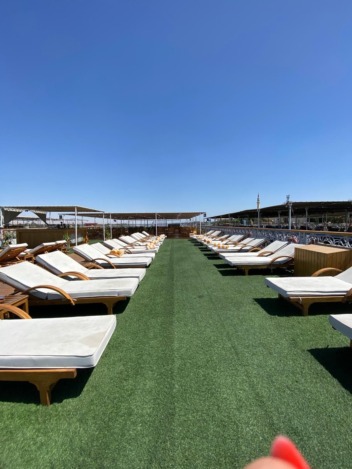 Vues des berges du Nil depuis les fauteuils confortables des ponts intérieurs: