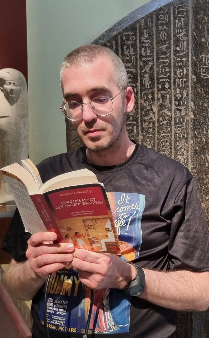 Au musée de la place Tahrir, lisant un bout du Livre des morts devant un bout du Livre des morts.