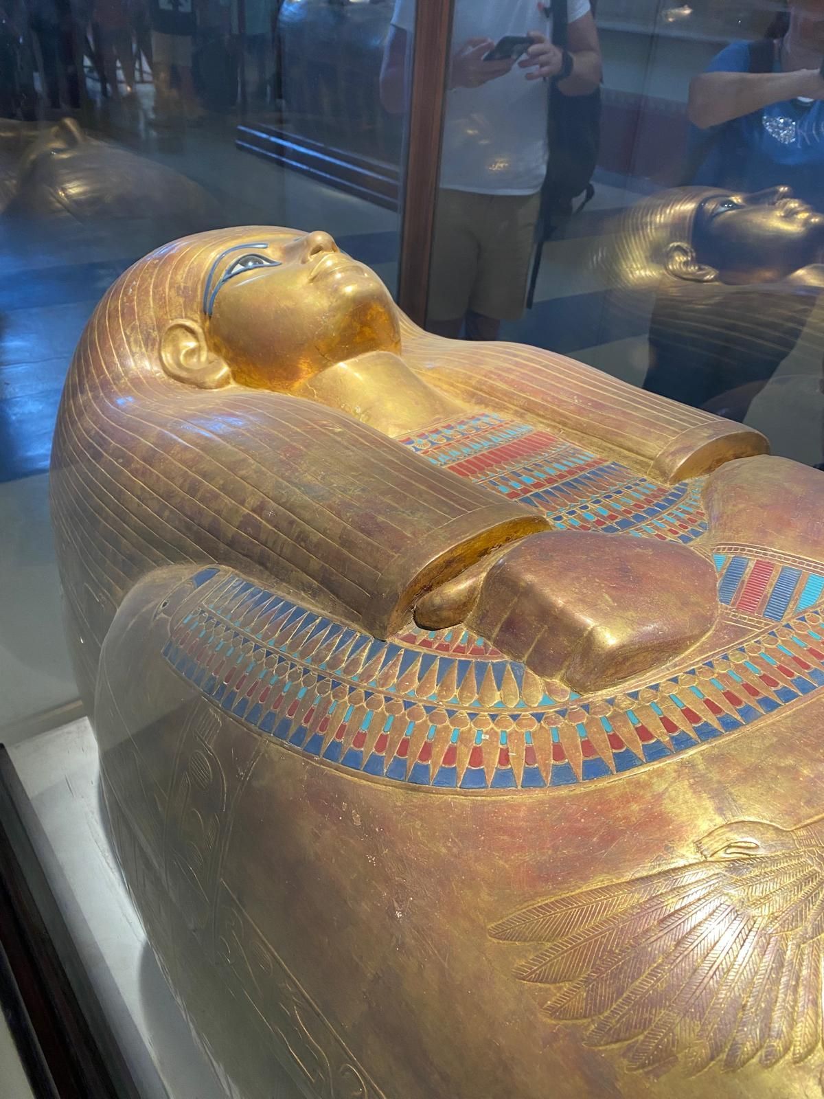 Ramsès II, Ramsès IX, Ramsès VI, Ramsès V, Séthi Ier, Thoutmôsis III, Hatchepsout, etc., mais 22 d'entre elles ont été transférées en 2021 au Musée national de la civilisation égyptienne, à Fostat, puis un certain nombre ont été redéplacées pour aller occuper la salle des momies royales au Grand Musée Égyptien bâti sur le plateau de Gizeh, et censé ouvrir bientôt depuis des années. Les deux seules momies restantes, place Tahrir, sont celles de Touya et Youya, les parents de Tiyi (l'épouse d'Amenhotep III, qui est assise au bras de ce dernier dans la sculpture giga-colossale de l'atrium présentée un peu plus haut). Ils avaient été enterrés, intialement, à la Vallée des Rois.