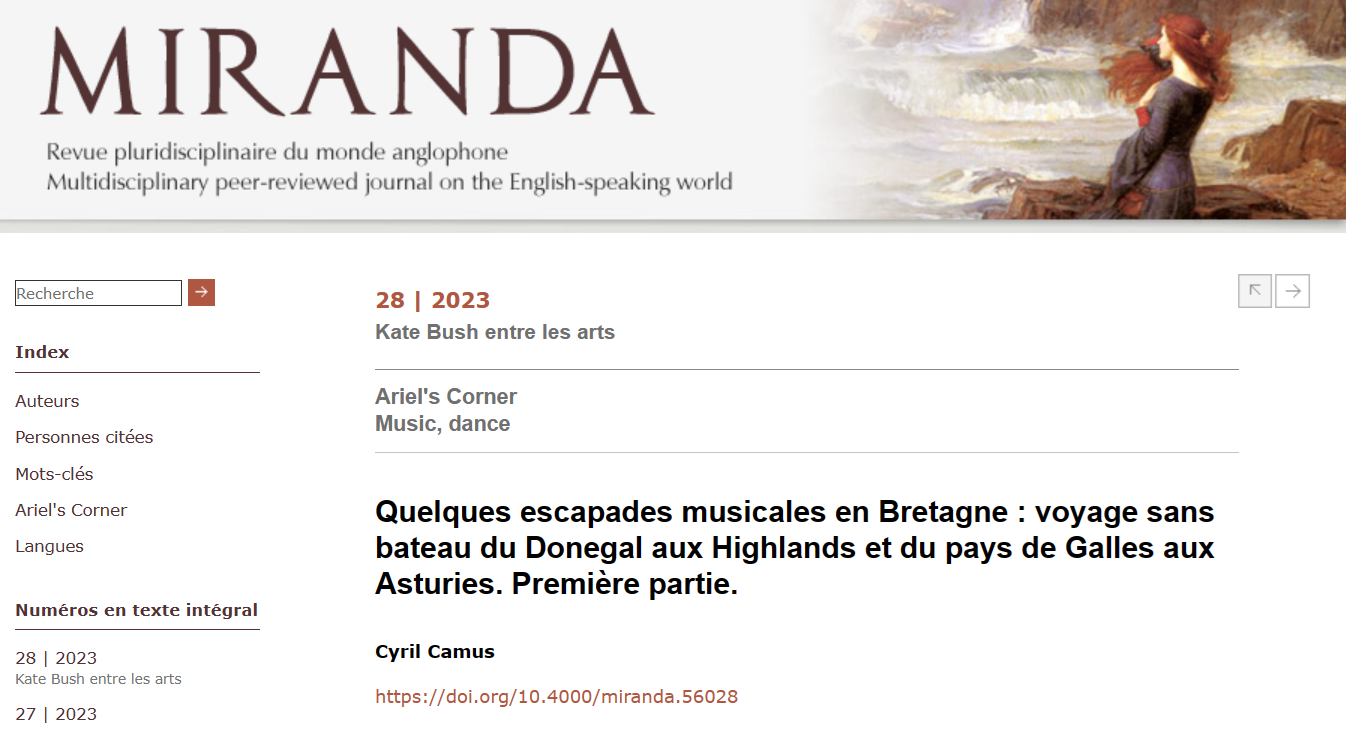 Si la première partie de ma deuxième "promenade musicale" (en Bretagne, intitulée " Quelques escapades musicales en Bretagne : voyage sans bateau du Donegal aux Highlands et du pays de Galles aux Asturies " (pour rappel, la première "pm" était sur la Nouvelle-Orléans et s'intitulait " Dix jours d'un concert à l'autre à la Nouvelle-Orléans "))) vous a intéressé, eh bien voilà, comme promis à l'époque, la deuxième partie (de la deuxième pm (en Bretagne), intitulée cette fois " Quelques escapades musicales en Bretagne : voyage sans bateau de Belfast à Cardiff en passant par Beyrouth " (toujours une publication Miranda (oui, j'aime les parenthèses 😉 ))): https://journals.openedition.org/miranda/59980 Yec'hed mat! (Après Altan , les 3 Daft Monkeys , les Gabiers d'Artimon ou encore Algaire dans la première partie, le programme de ce nouveau chapitre inclut Endro , Pure Blarney , The Trials of Cato , Celkilt , Poppy Seeds , etc.!)
