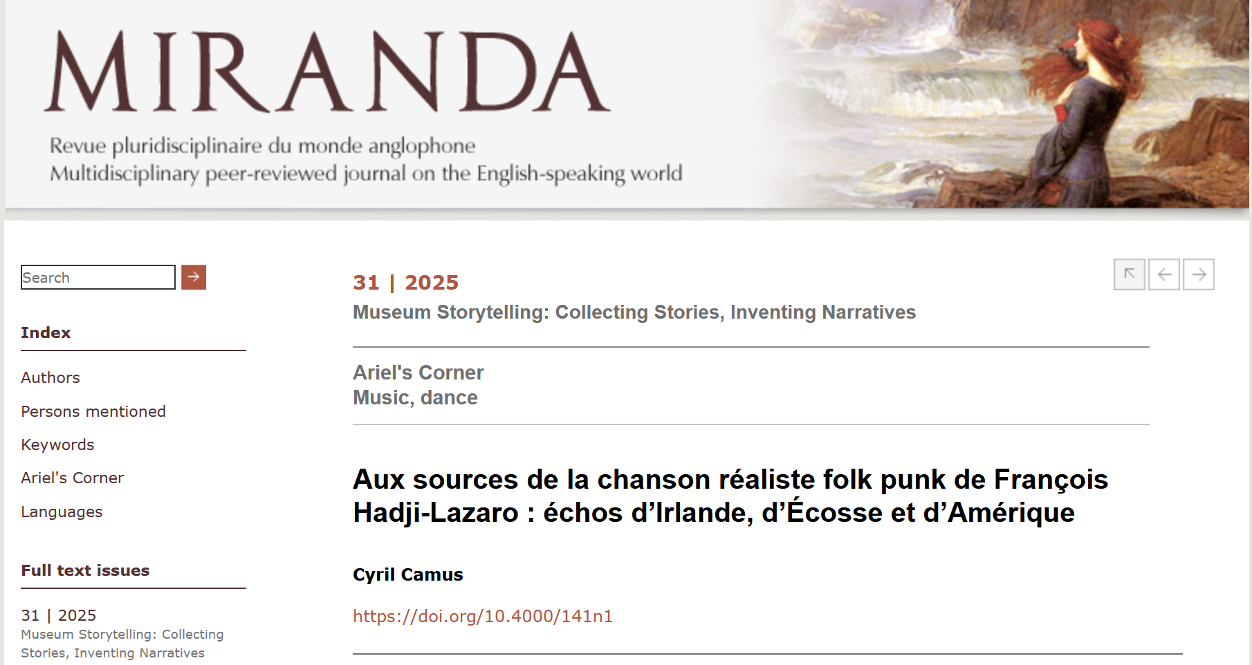 La section musicale de la rubrique Ariel's Corner de la revue Miranda publie une nouvelle fois * un article de votre serviteur sur un sujet tonitruant: François Hadji-Lazaro ! https://journals.openedition.org/miranda/66387 _______________________________________________________________ *Pour rappel, avant ça, cette même section de cette même rubrique de cette même revue avait déjà accueilli mes deux essais sur le partage de musique en ligne comme outil de création de lien pendant les confinements covidiens (celui sur l'album Breath & Hammer et les Sunday Connections de David Krakauer et Kathleen Tagg ; et celui sur le ShantyTok ), puis mes deux "promenades musicales" (celle sur la Nouvelle-Orléans ; et la partie 1 et la partie 2 de celle sur la Bretagne et les festival interceltique 2023).
